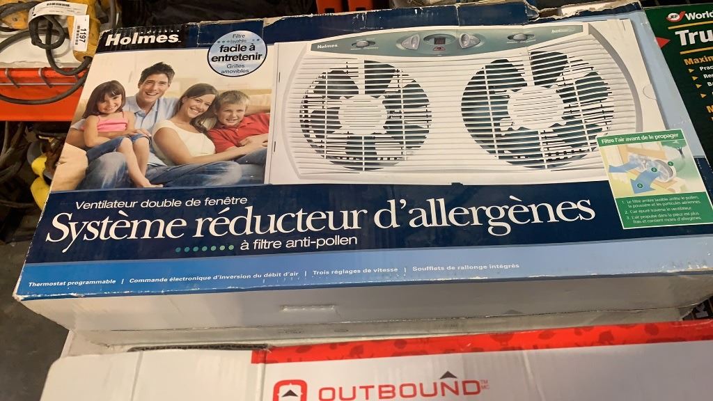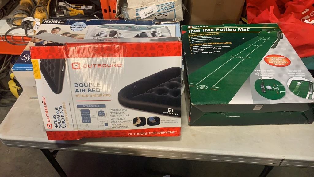 HOLMES DOUBLE WINDOW FAN DOUBLE AIR BED AND GOLF PUTTING MATT
