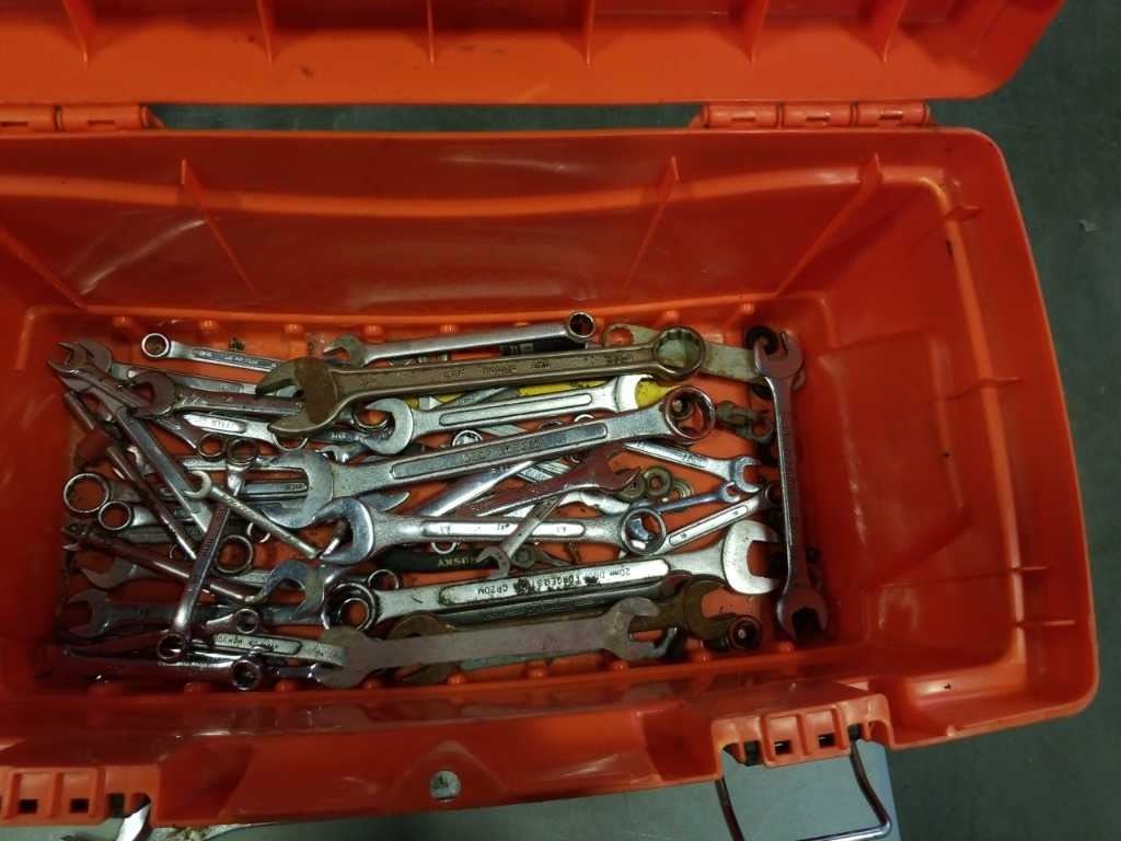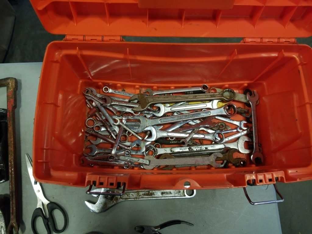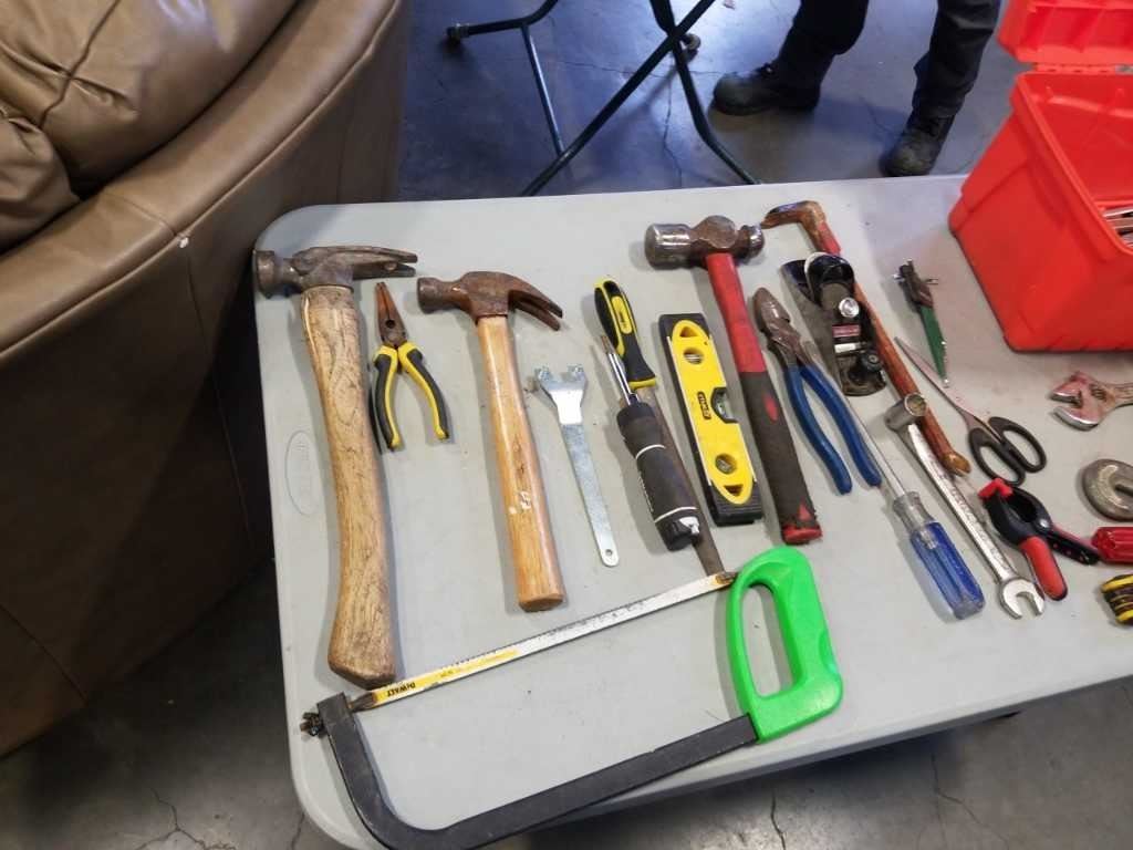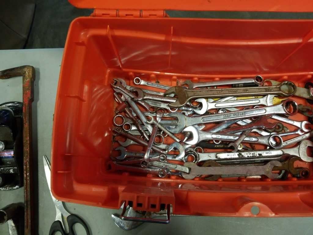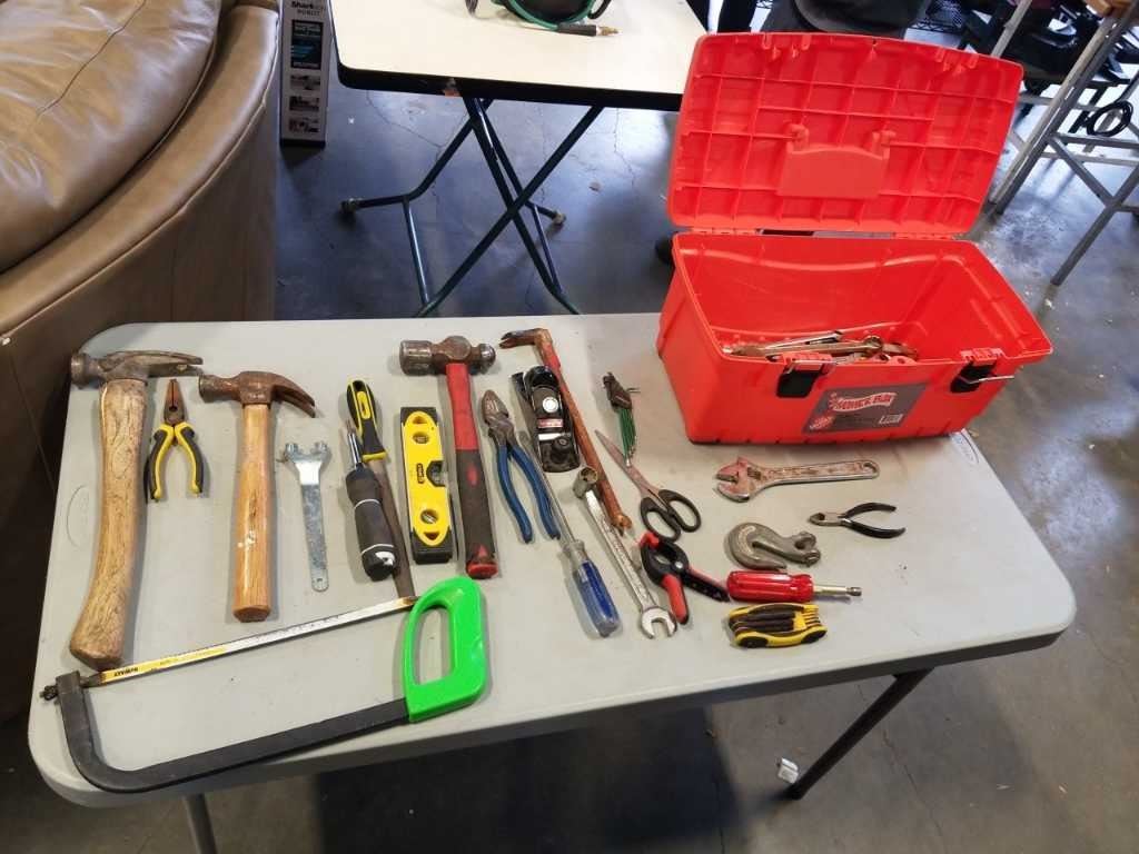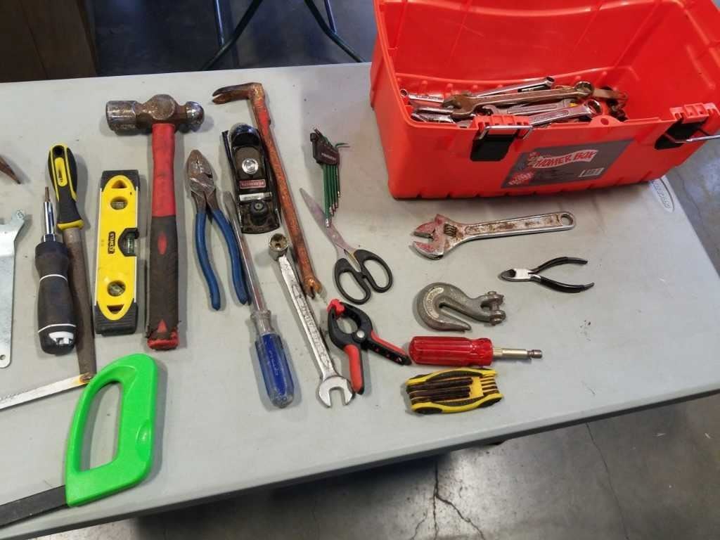 HOME DEPOT TOOLBOX WITH CONTENTS, TOOLS, HAMMERS, WOOD PLANE, PRY BAR