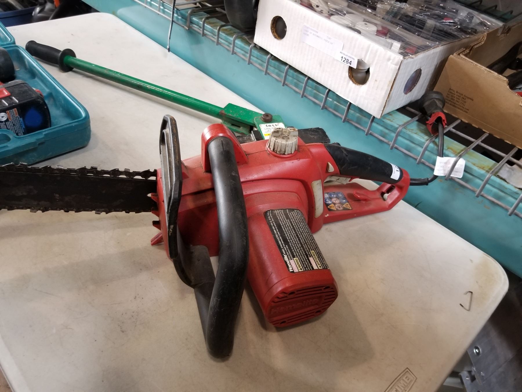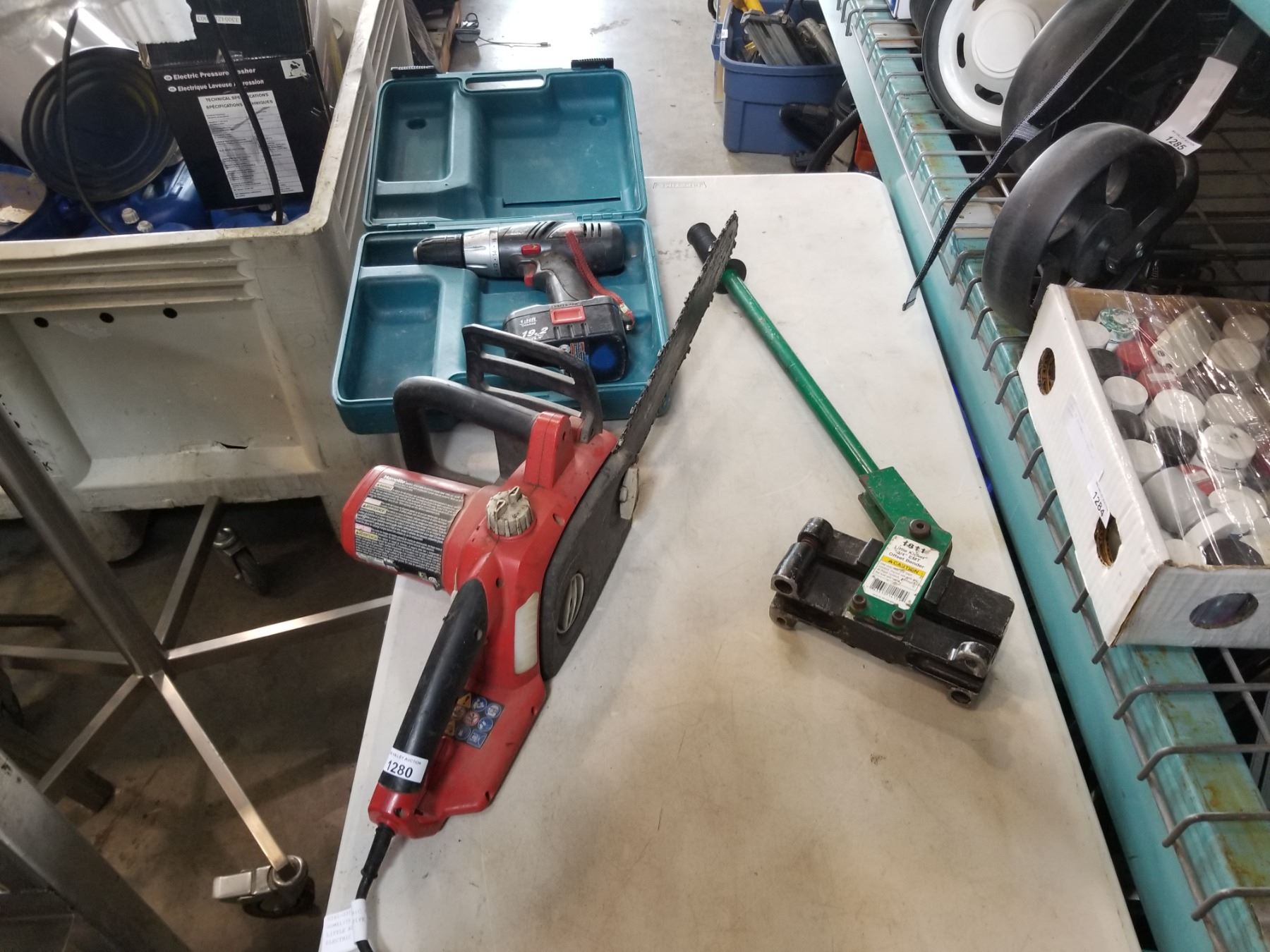 HOMELITE ELECTRIC CHAINSAW, LITTLE KICKER PIPE BENDER, AND ELECTRIC DRILL