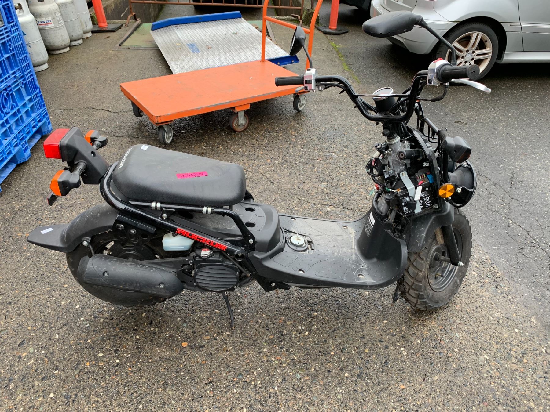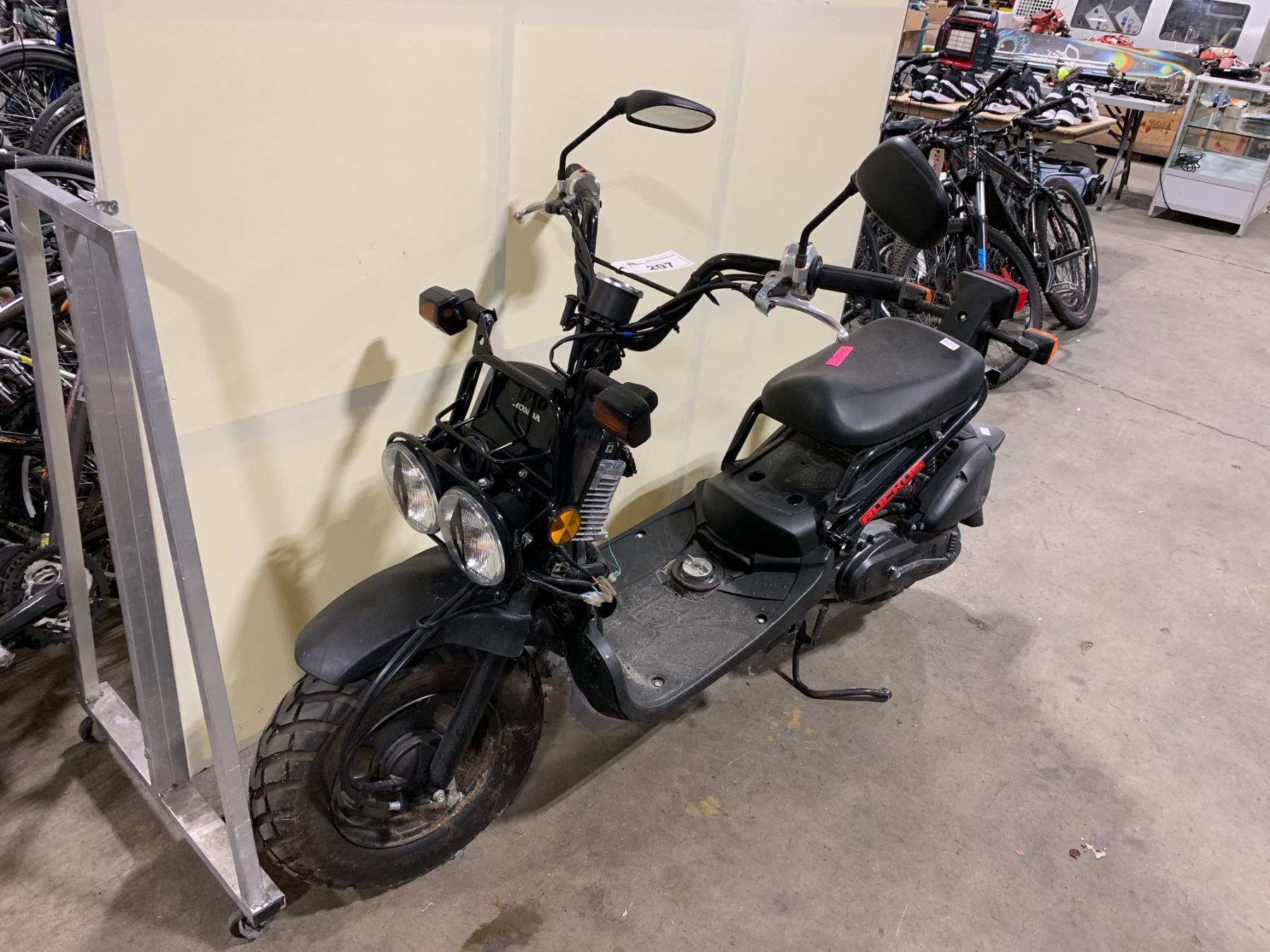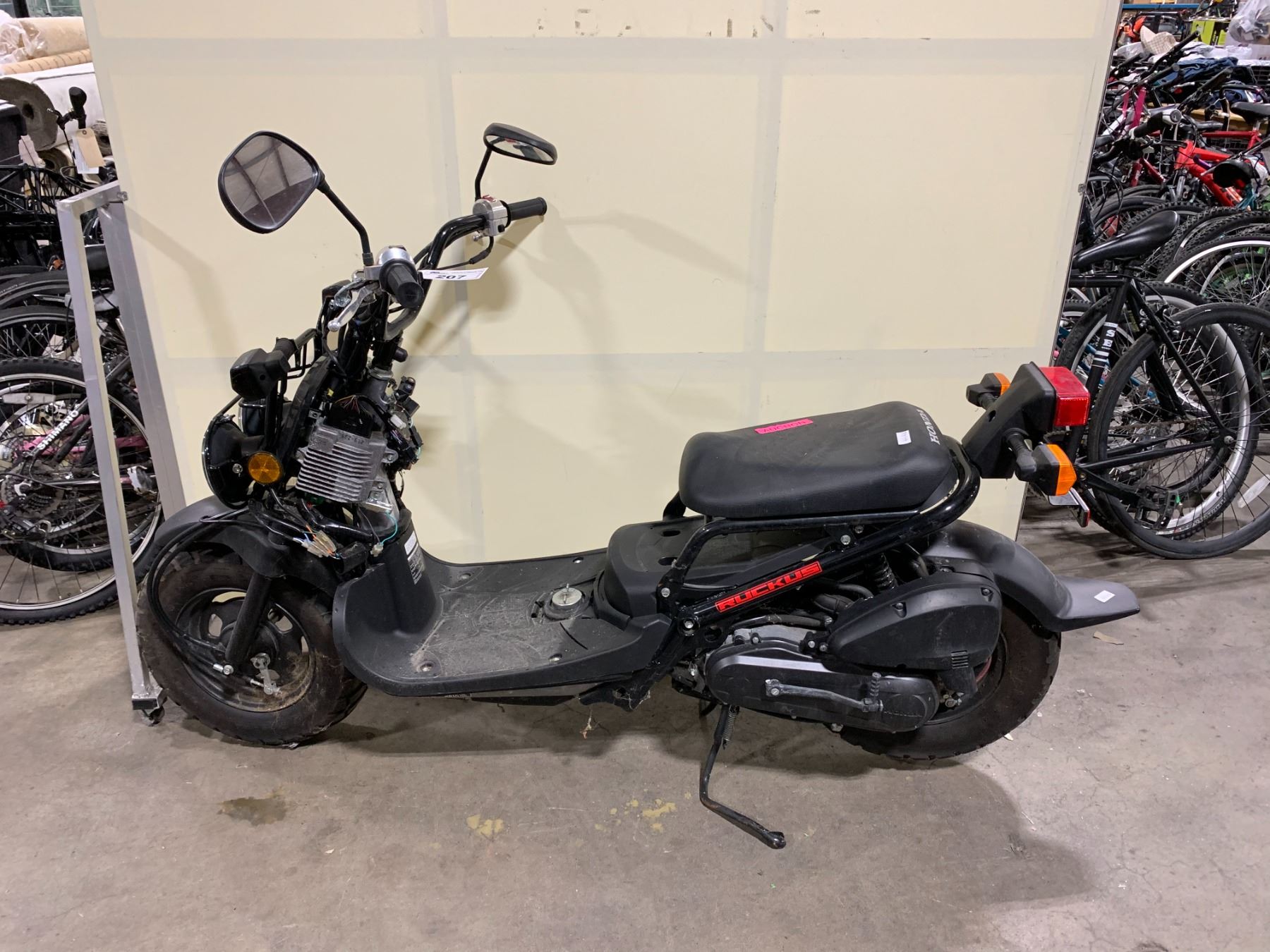 HONDA RUCKUS BLACK GAS OPERATED FULL SUSPENSION SCOOTER *NO KEY, NO REGISTRATION, FRONT TOP BODY PARTS MISSING*