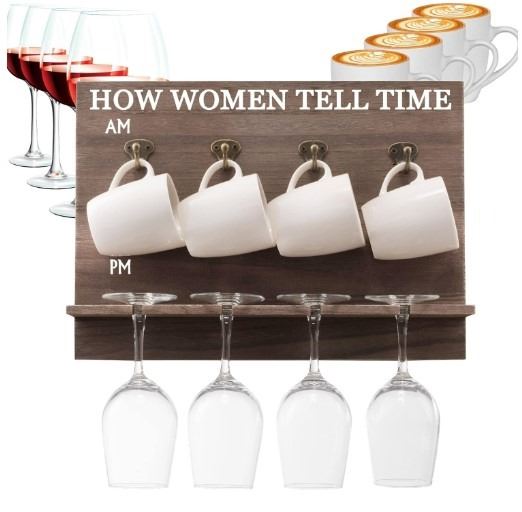 HOW WOMEN TELL TIME WINE GLASS AND COFFEE MUG WALL RACK - INCLUDES 4 WINE GLASSES AND 4 COFFEE MUGS