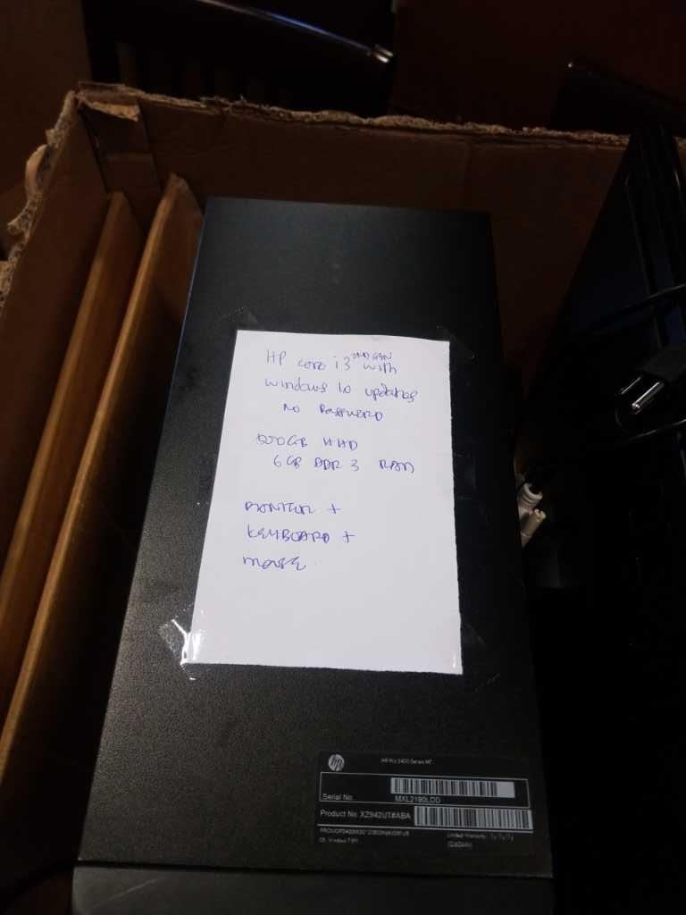 HP I3 second gen, windows 10 update, no password 500 GB HDD, 6 GB DDR 3 Ram with monitor, keyboard and mouse