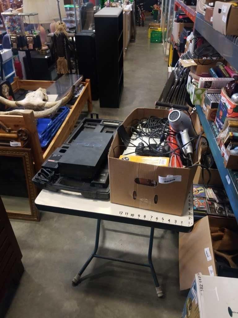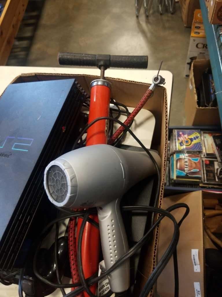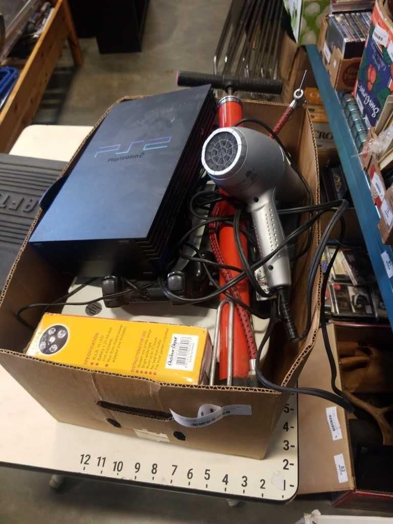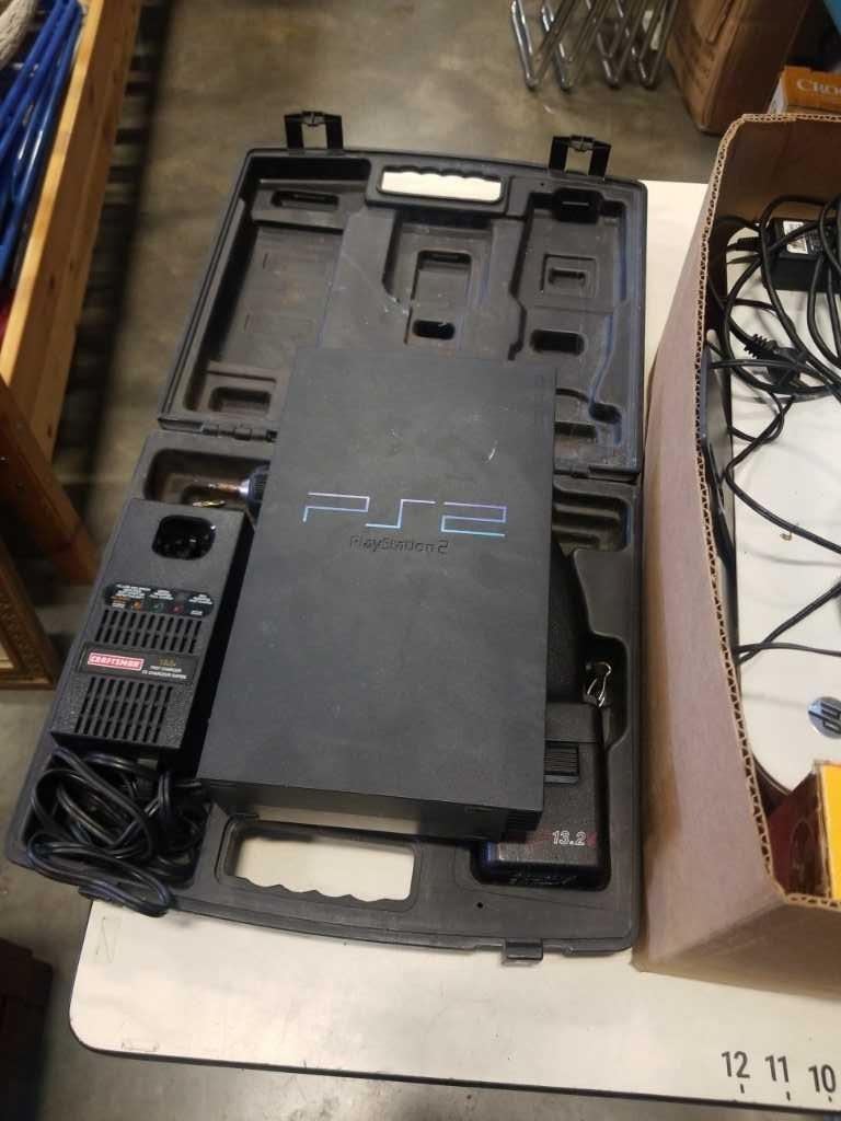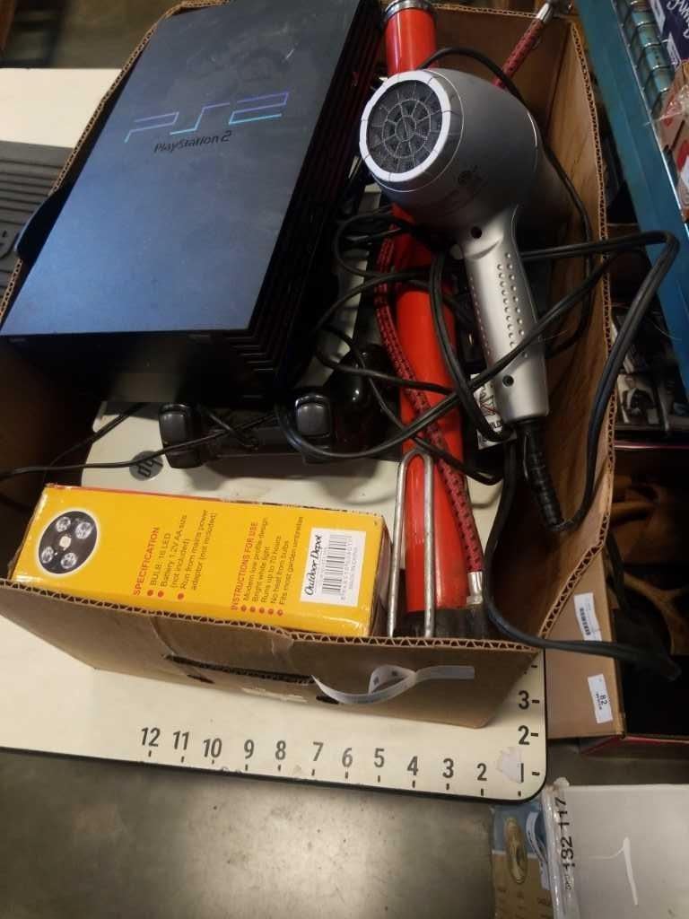 HP PRINTER, PS2 CONSOLE, UMBRELLA LIGHT, BIKE PUMP AND CORDLESS DRILL