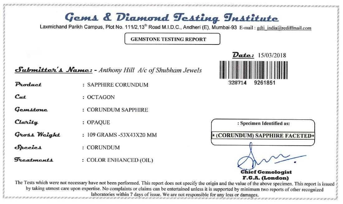 HUGE CERTIFIED 546 CT MUSEUM SIZE BLUE SAPPHIRE. EMERALD CUT MEASURING 53 x 43 x x.20 mm. PLEASE SEE CERTIFICATION FOR FURTHER DETAILS. ONE OF A KIND SHOW PIECE . Total Gram Wt 109.