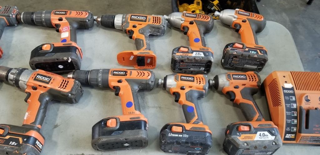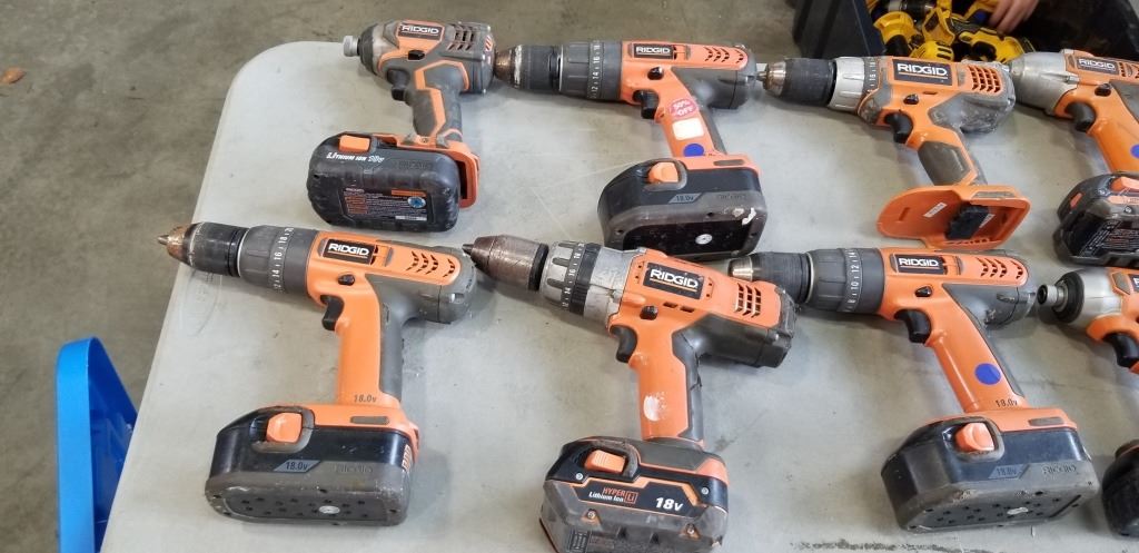 HUGE LOT OF RIDGID 18V DRILLS, IMPACTS, CHARGERS AND MORE