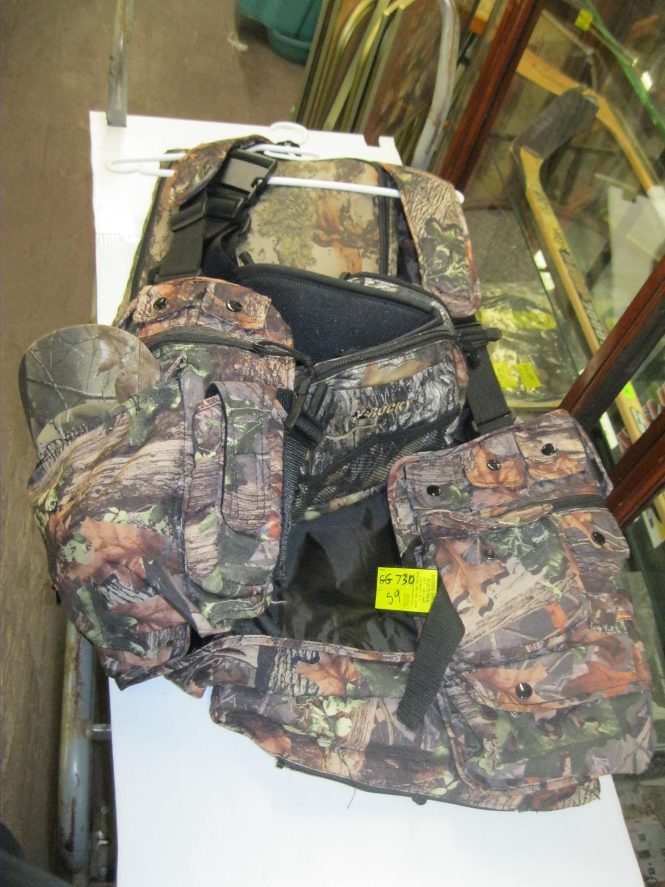 HUNTING CAMMO VEST W/ATTACHMENTS, SEAT CUSHION, FANNY PACK, ETC.