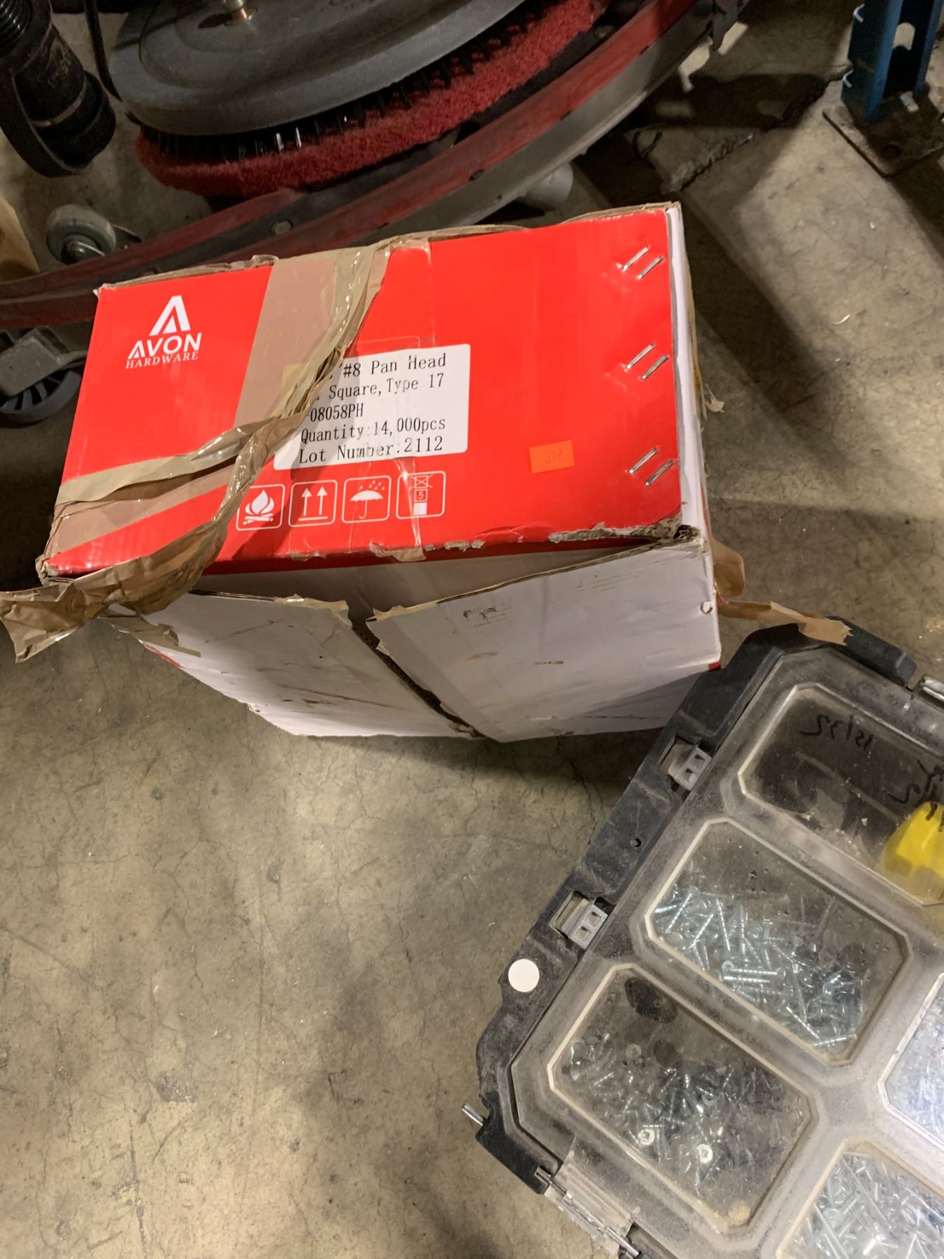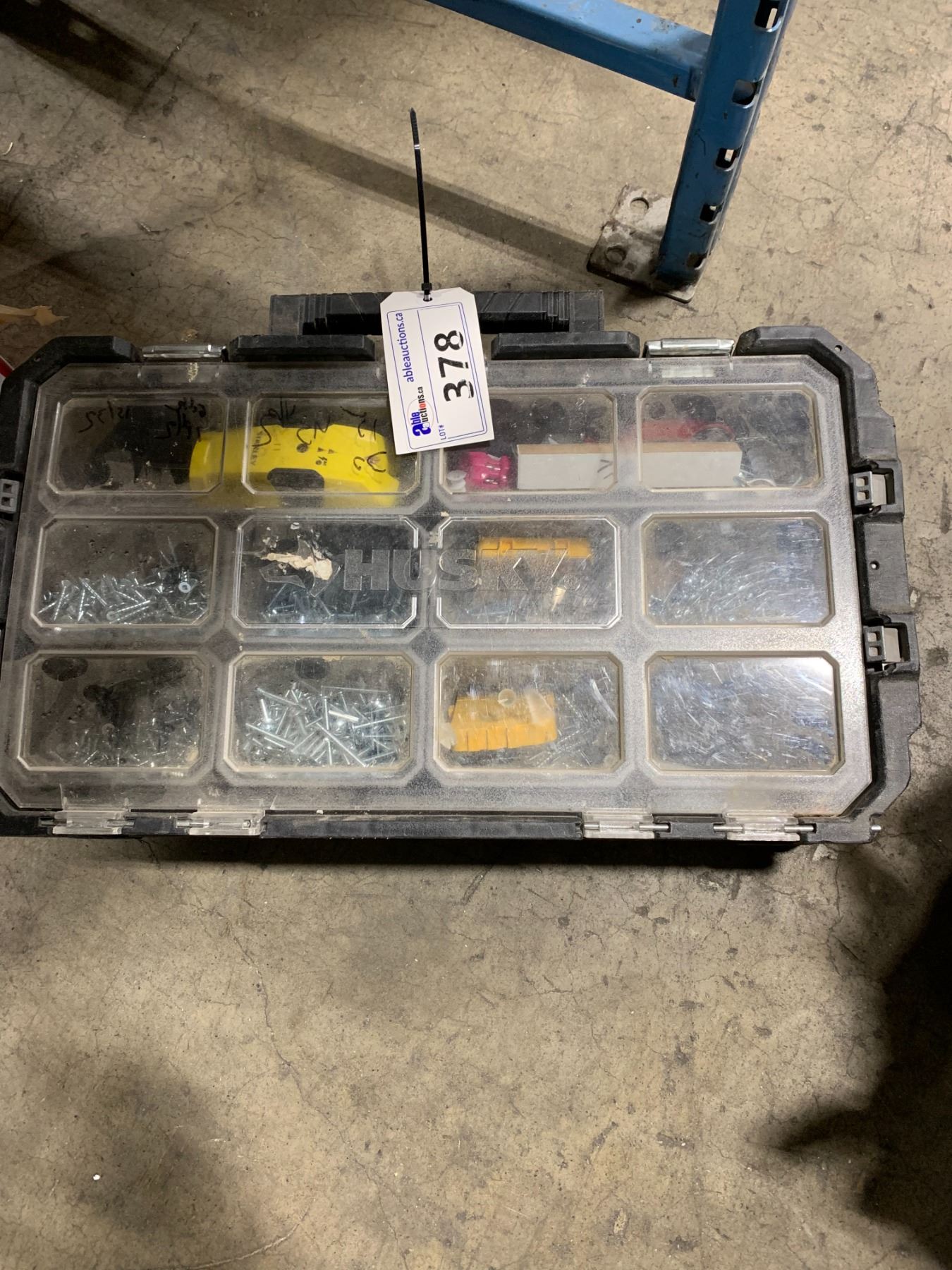HUSKY HARD TRAVEL ORGANIZER BIN WITH ASSORTED SCREWS AND ATTACHMENTS, AVON HARDWARE BOX OF 3/8 PANHEAD SCREWS