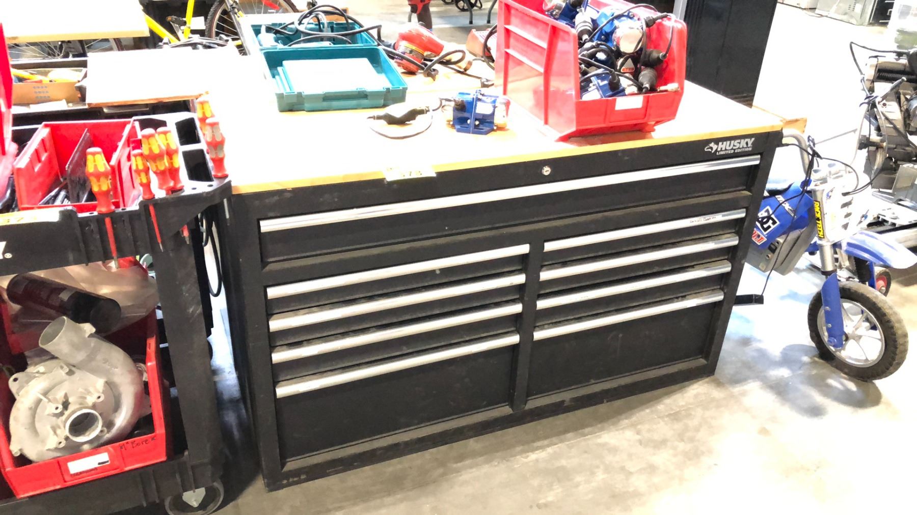 HUSKY LIMITED EDITION 9 DRAWER BLACK TOOL BOX 18" X 52" X 31" W/ CONTENTS (NO KEY)