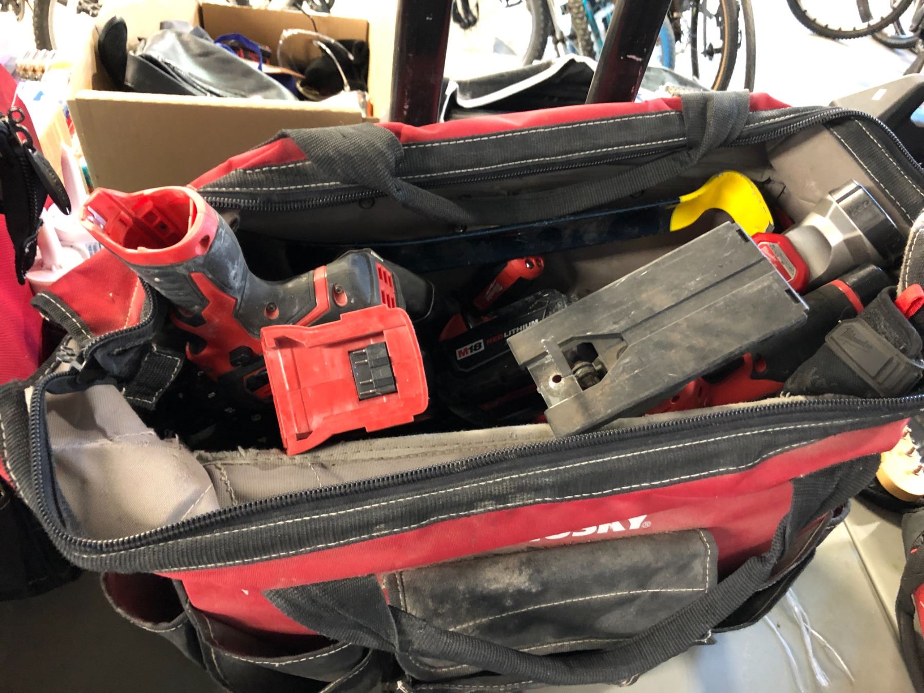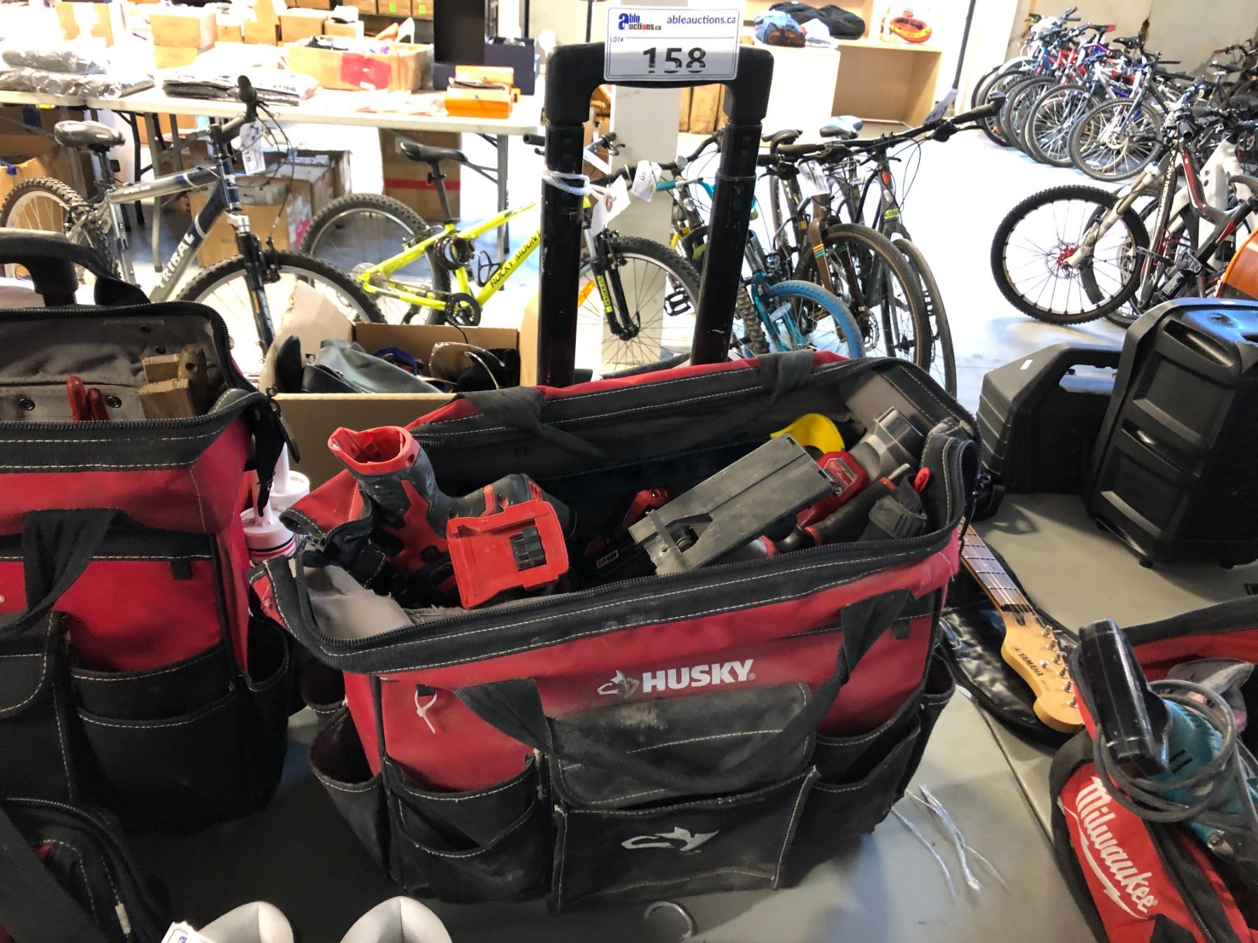 HUSKY MOBILE TOOL BAG WITH CONTENTS OF ASSORTED MILWAUKEE CORDLESS POWER TOOLS INCLUDING ROTARY HAMMER DRILL, SAWZALL, OSCILLATING MULTI TOOL, ROTARY TOOL, 2 DRILLS, IMPACT DRIVER, JIGSAW, WORK LIGHT, 1 - M18 BATTERY, 3 - M12 BATTERIES AND ASSORTED HAND TOOLS