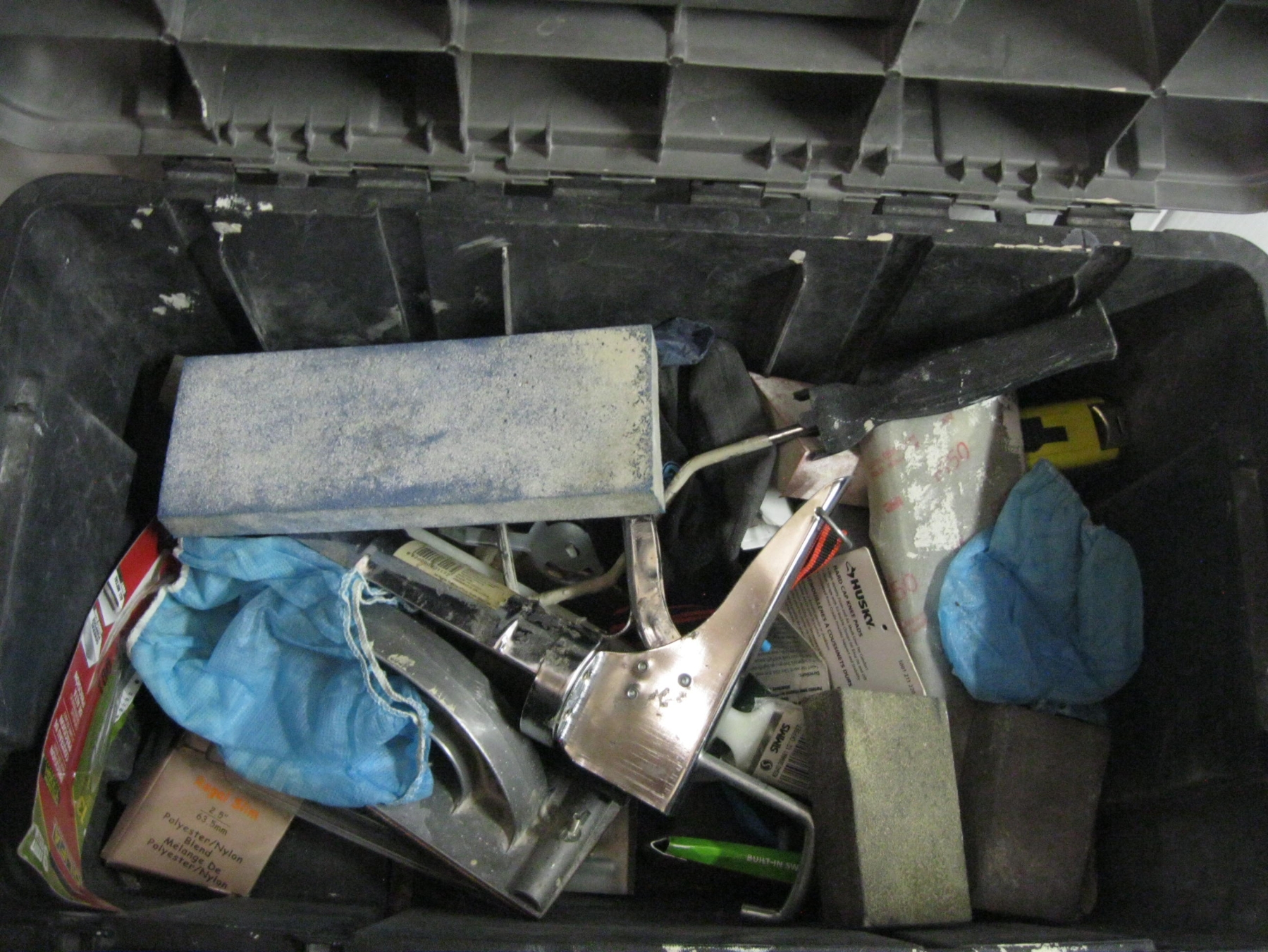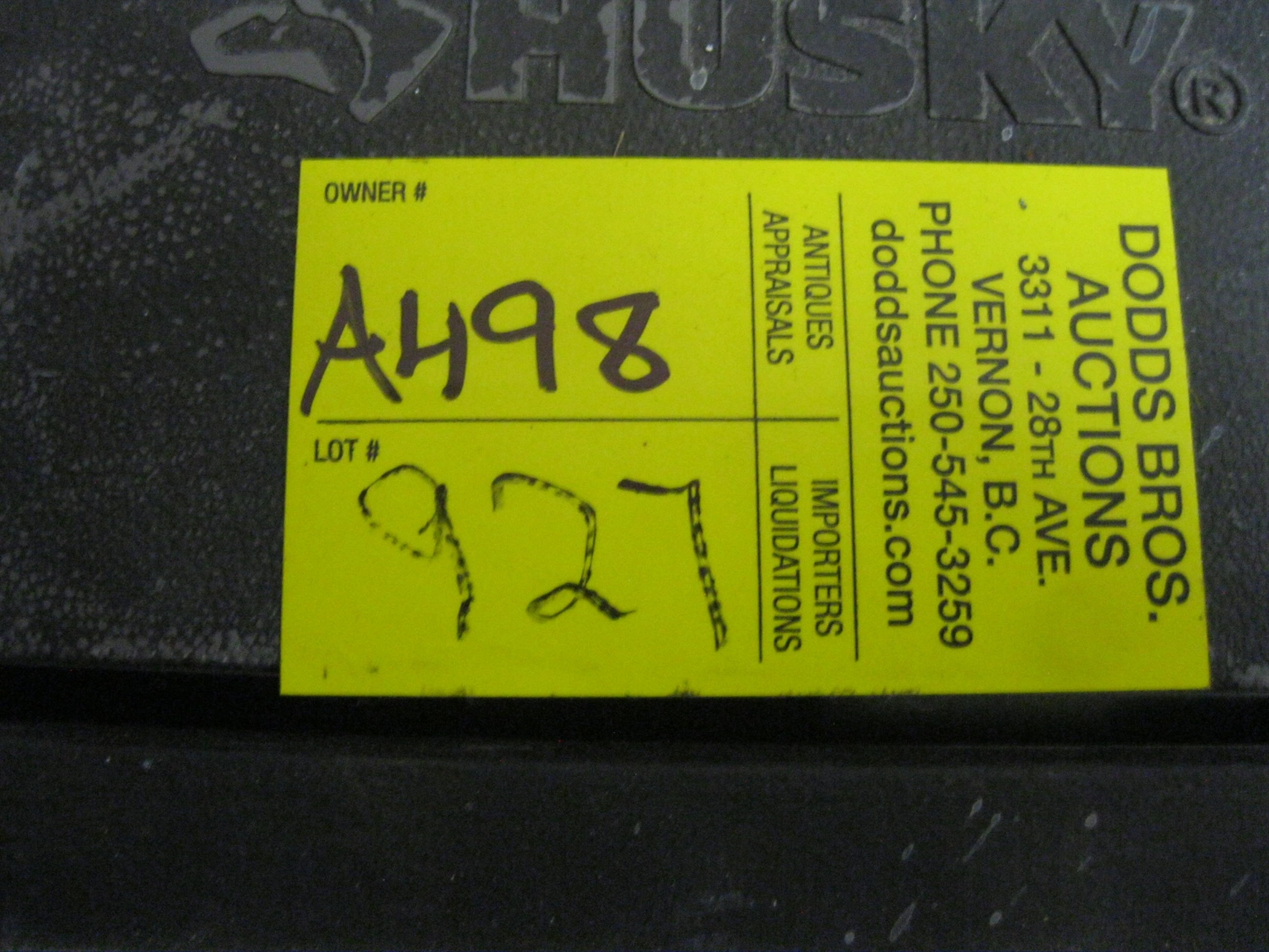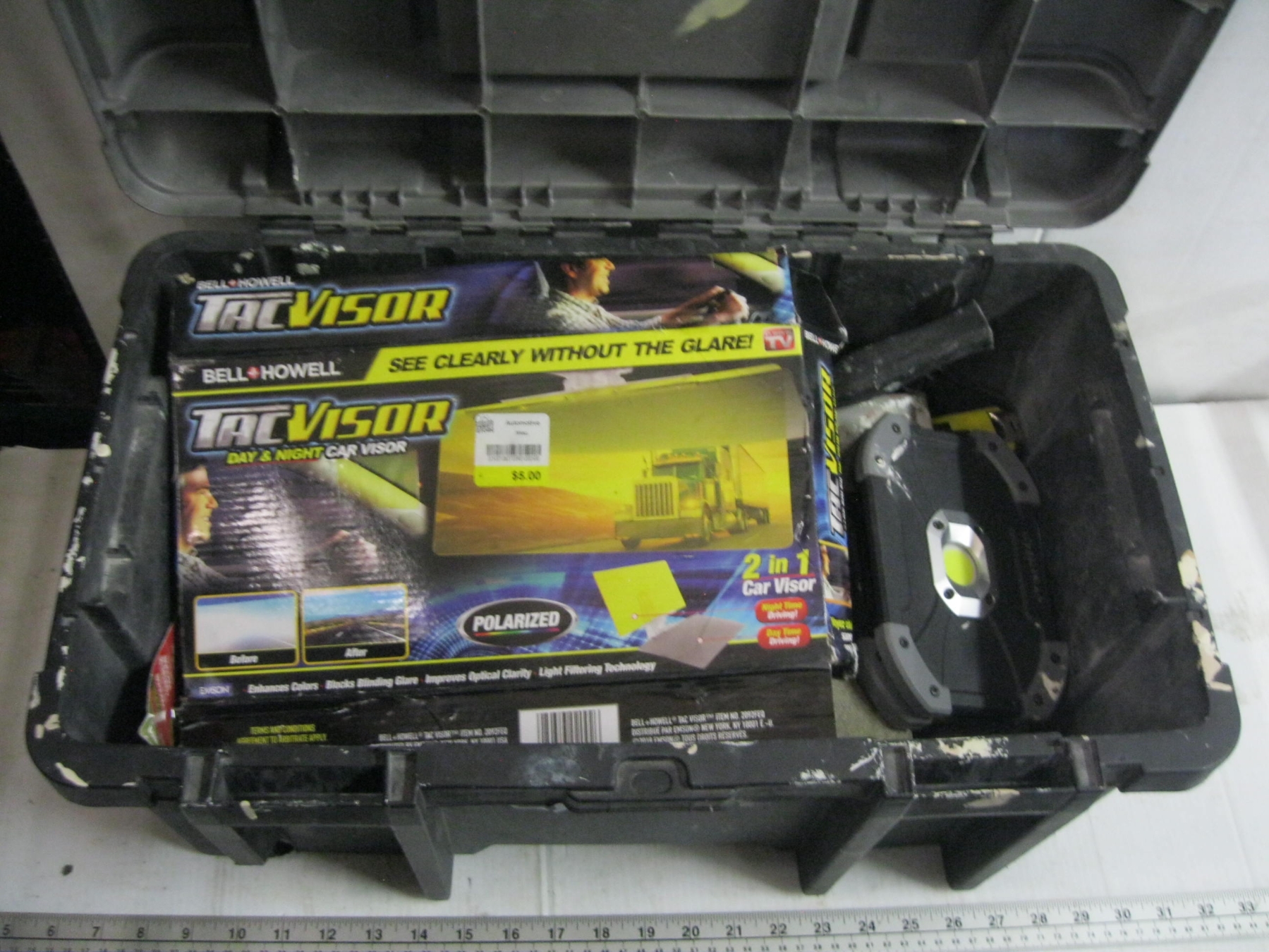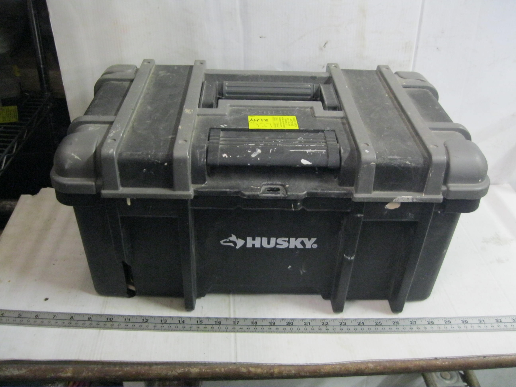 HUSKY TOOLBOX W/MISC. CONTENTS: CAR VISION, CAULKING GUN, SANDING PADS, LED LIGHT, ETC.