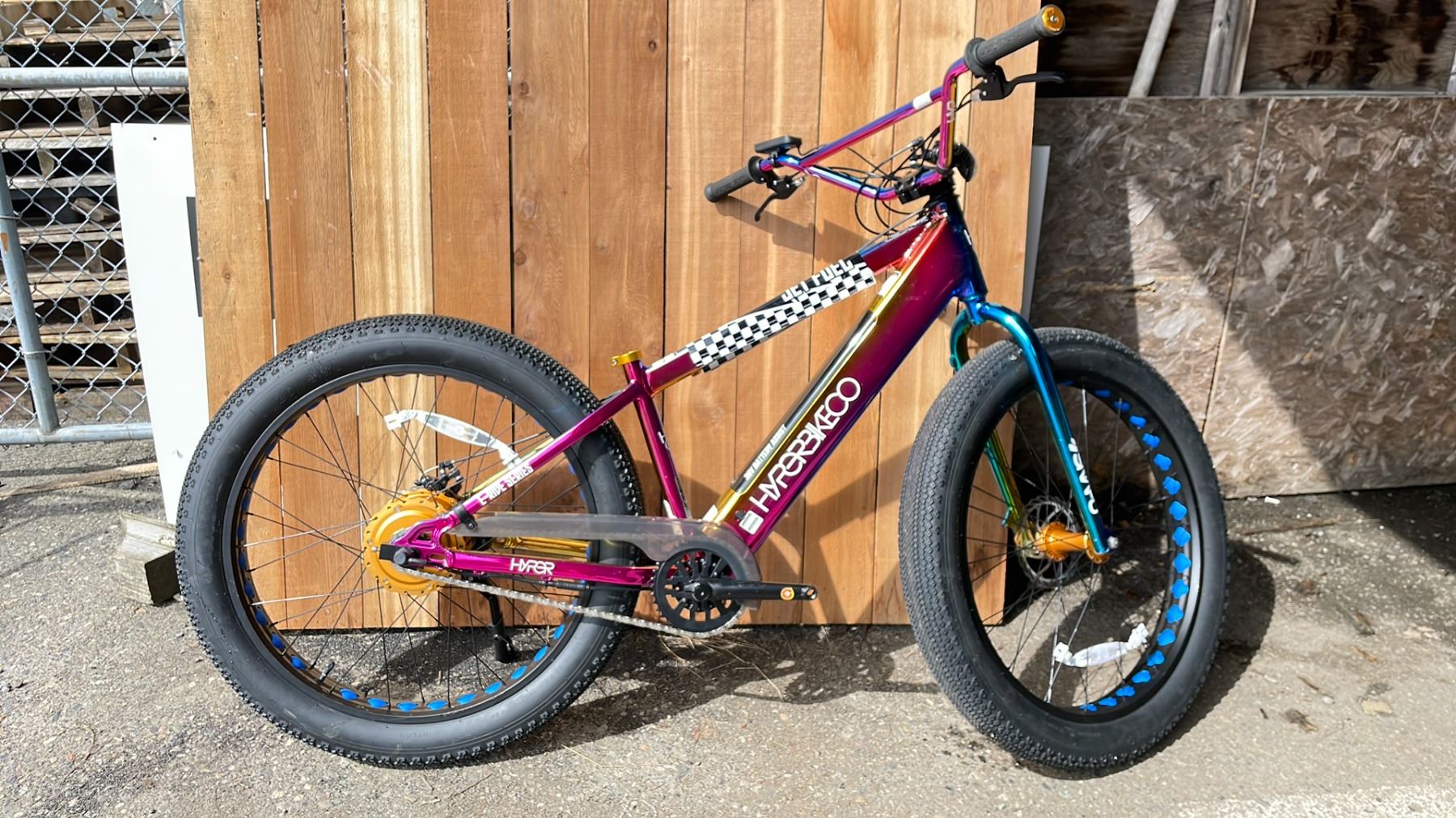 HYPER E-RIDE SERIES E-BIKE WITH BATTERY (NO CHARGER, NO KEYS, BRAKE ISSUES, NO SEAT, UNKNOWN WORKING CONDITION)