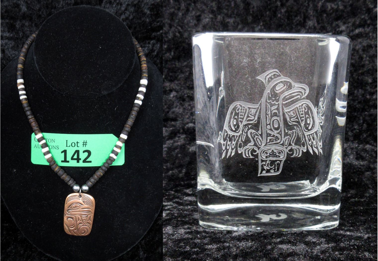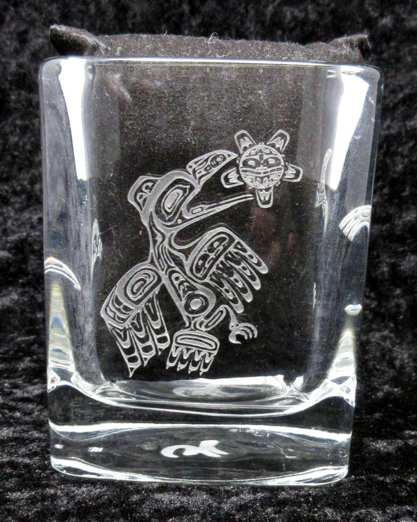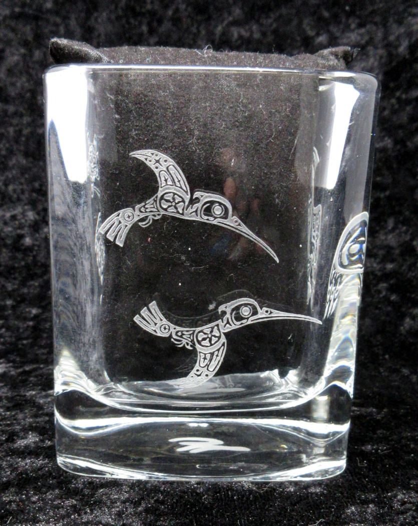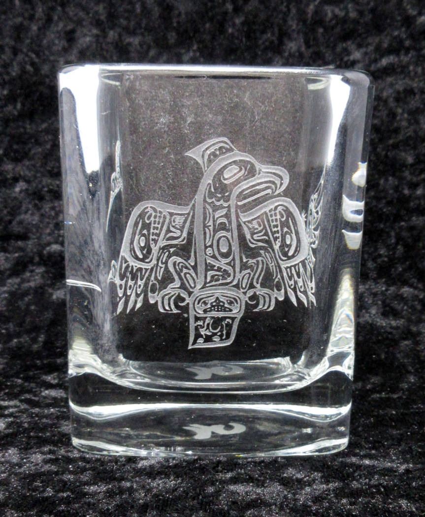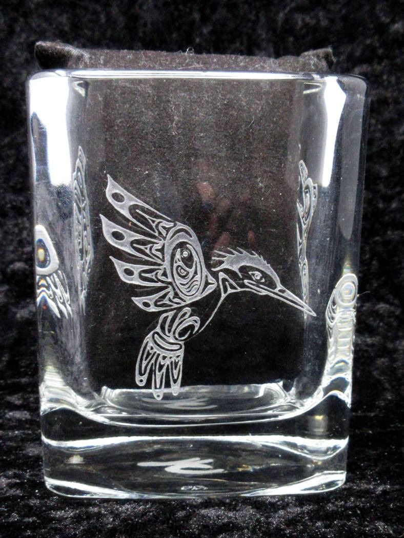Candle holder is etched on 4 sides with Hummingbird, Raven, Eagle and Thunderbird.