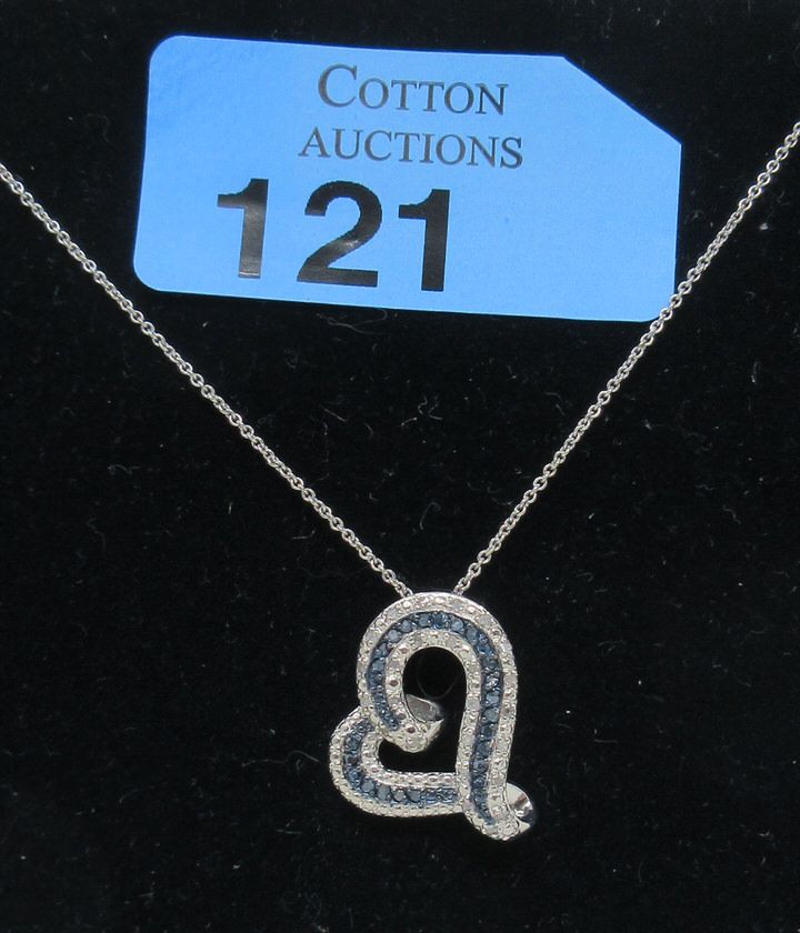 25 Blue & 25 White diamonds set in a heart shaped pendant. Includes a chain & a $800 certificate.