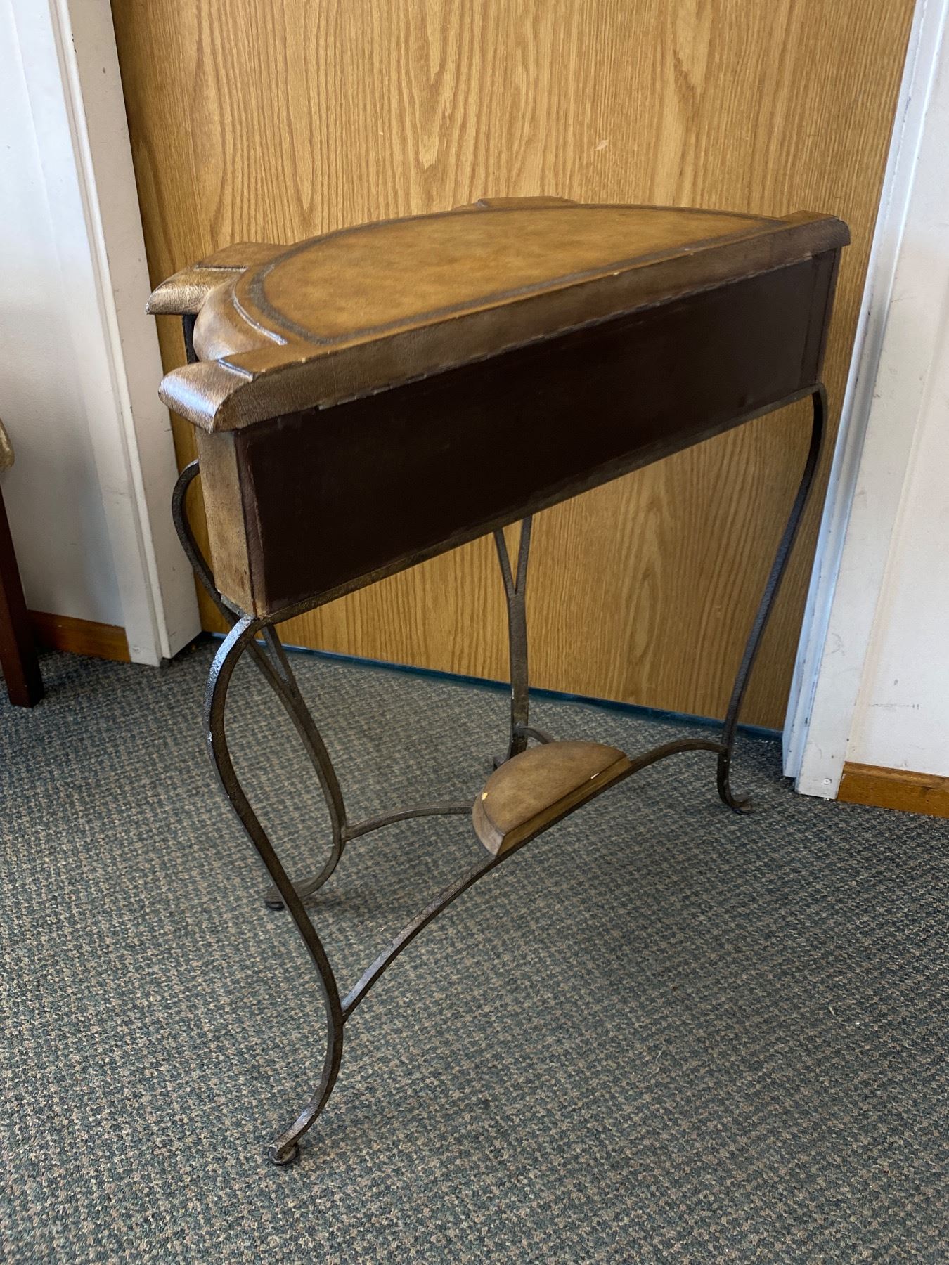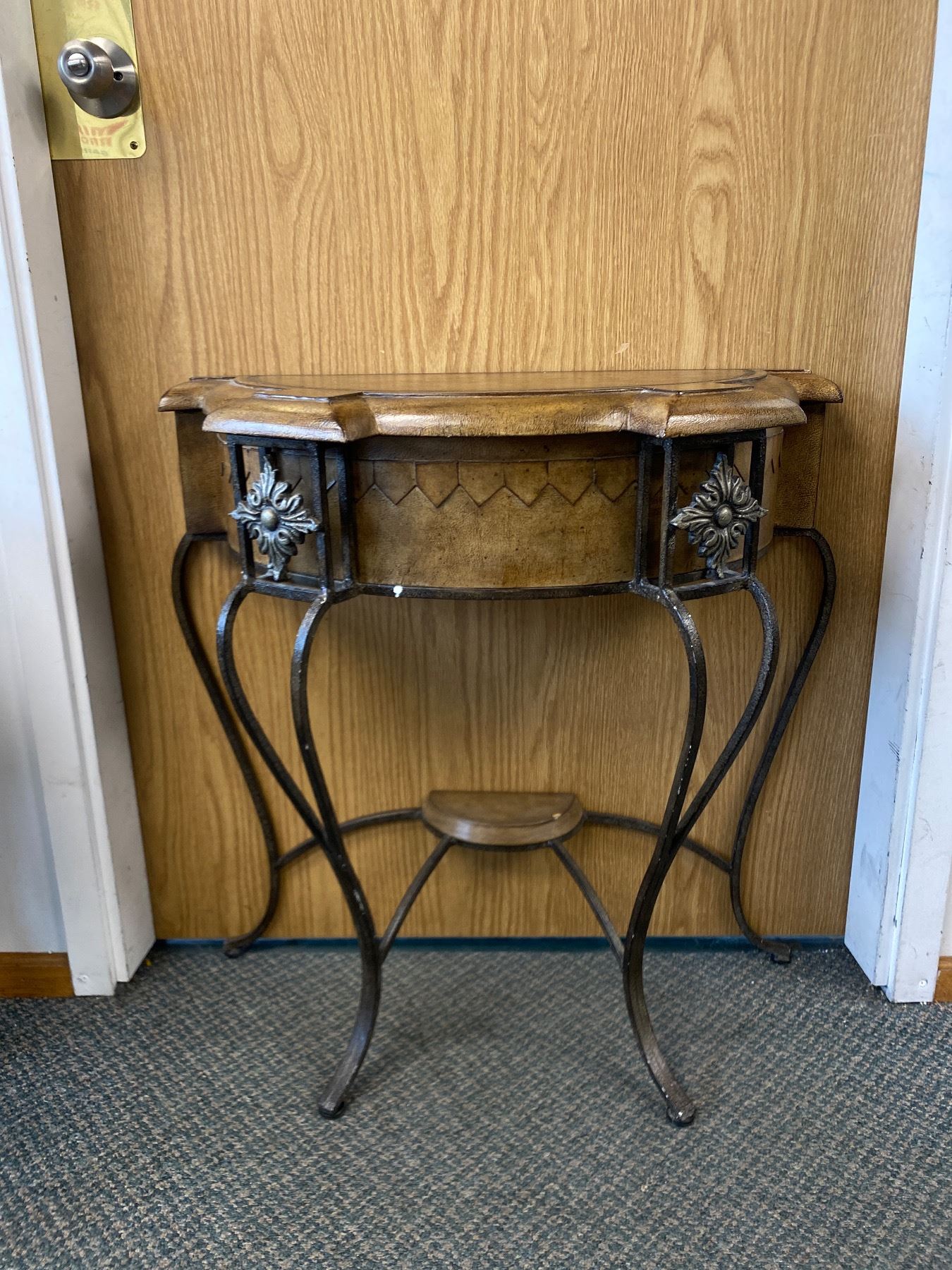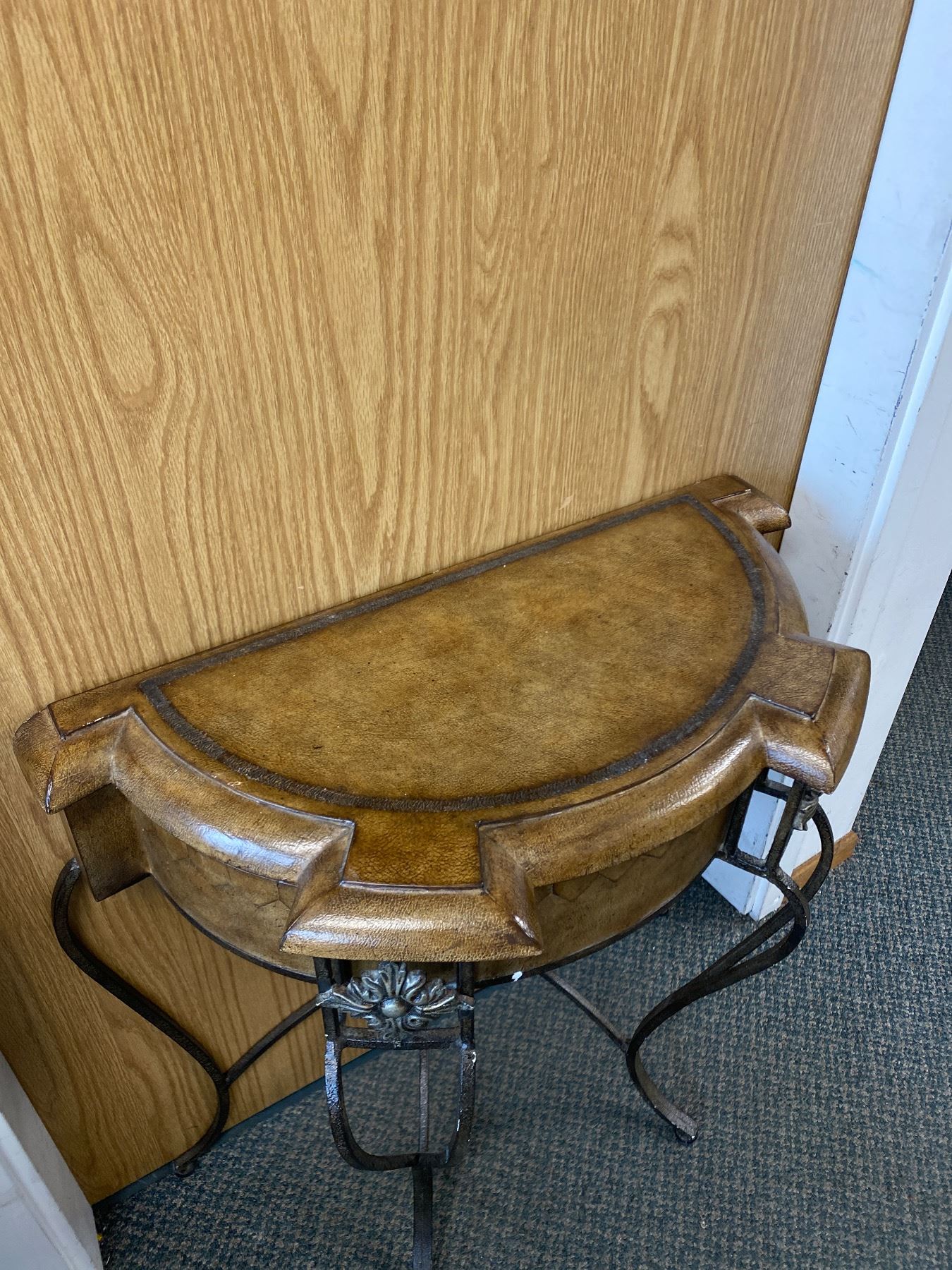 Half Moon Side Table w/ Leather Look Top & Ornate Metal Legs. Approx. 29" H x 28" x 13"