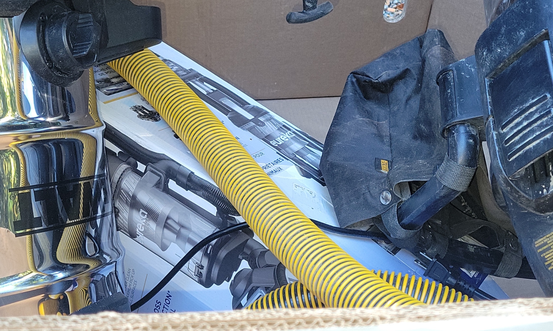 As is. Includes DeWalt canister vacuum and Eureka upright vacuum.