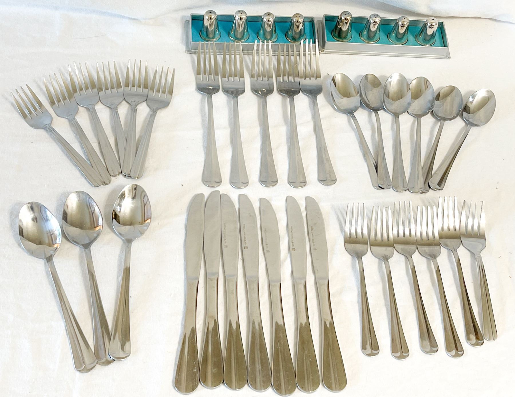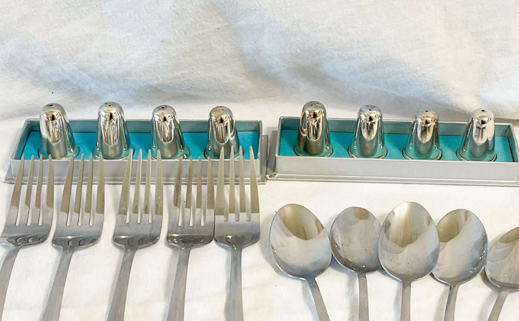 Mixed lot of stainless flatware by Hampton Forge and Hampton Silversmiths, accompanied by four boxed sets of individual silver-plated salt and pepper shakers.