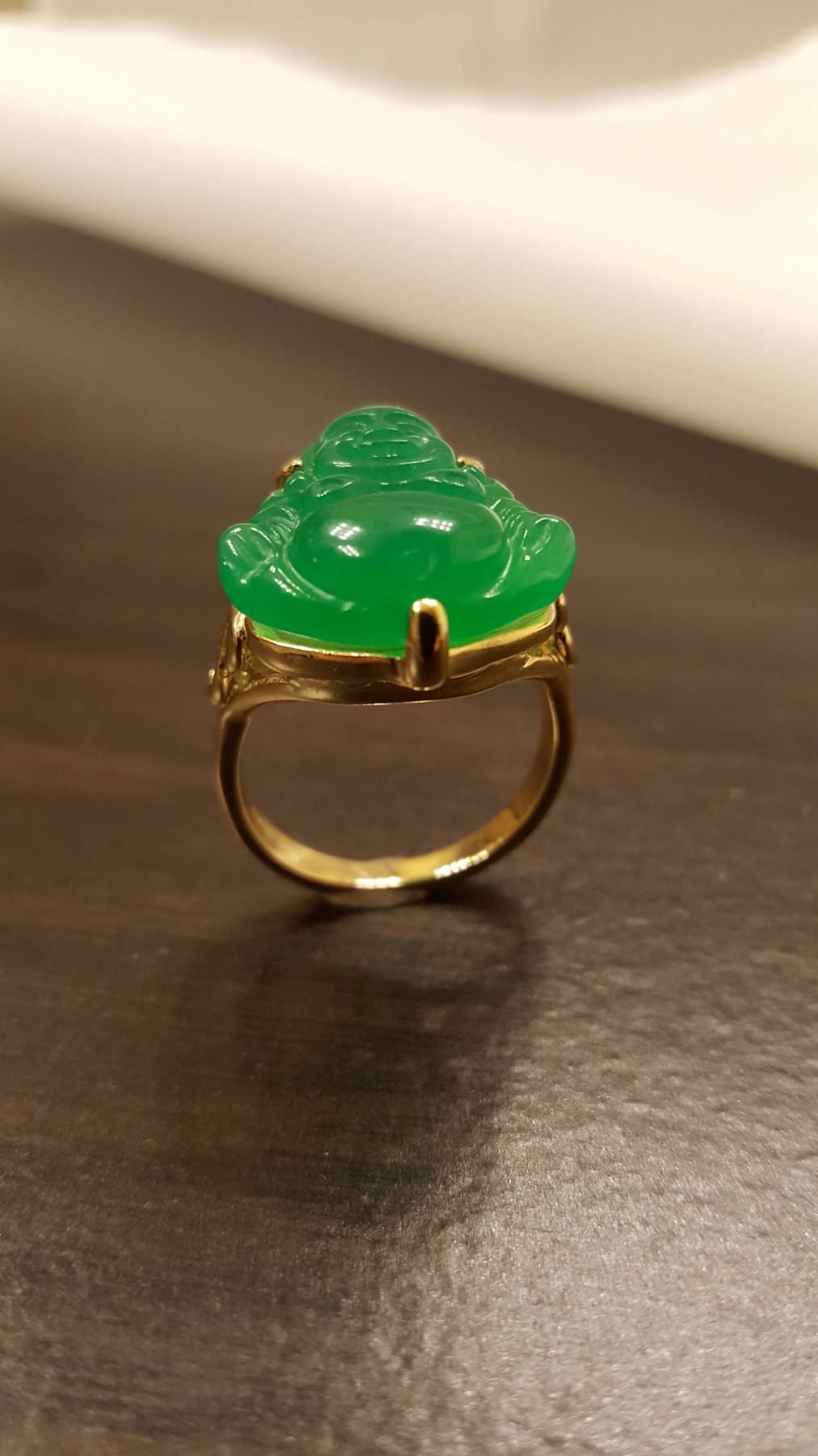Hand Carved 12 Ct Jade Buddha Ring Mounted In 14 kt. Overlay.Due to the hardness of the stone, jade was also extremely difficult for craftsmen to work with. As such, jade was a symbol of power and status. This item is in good condition mounted in 14 kt gold overlay. Size: 8 1/2 .Approx. Net Weight 6.8 grams. Ring box in phote not included