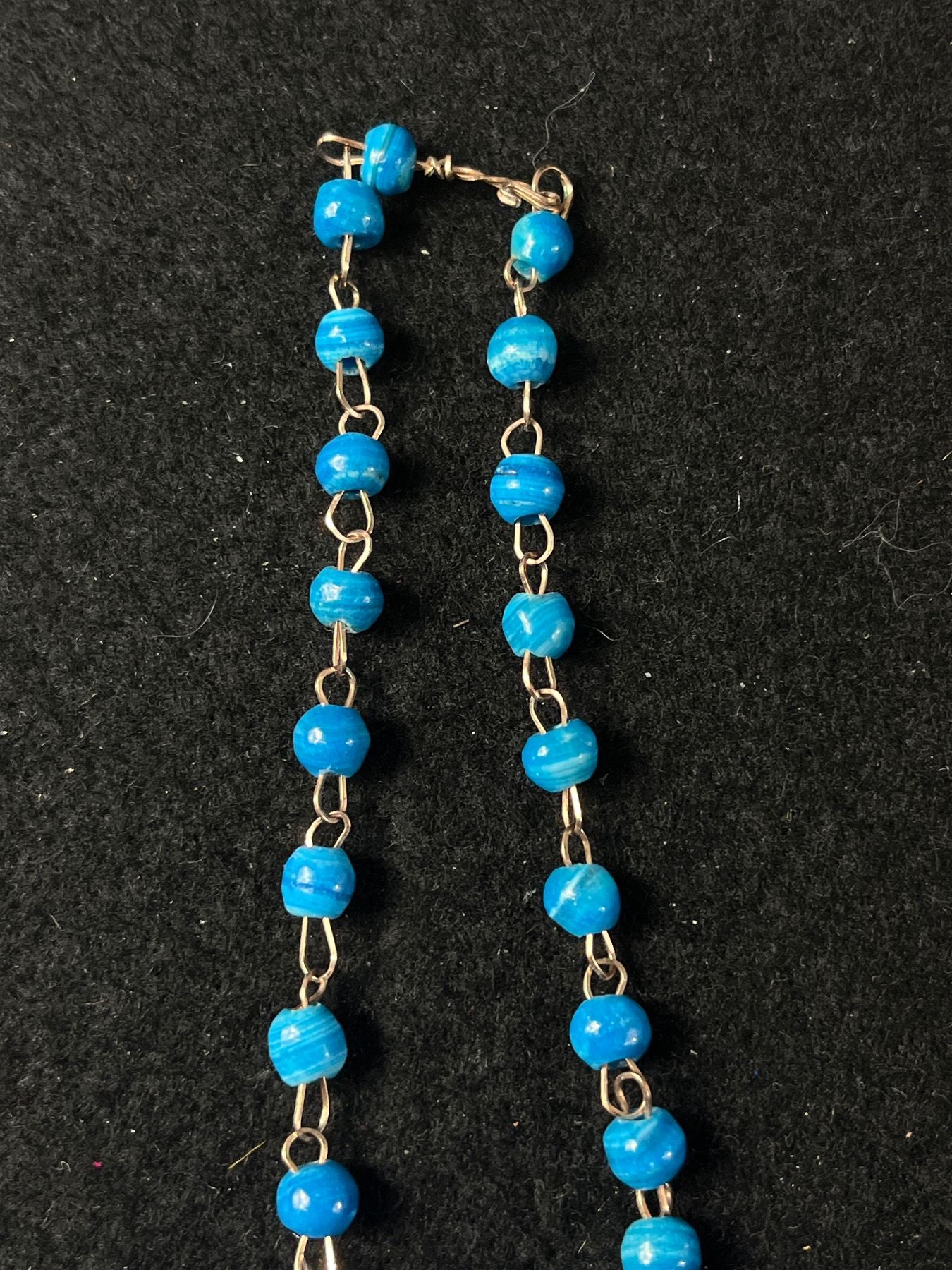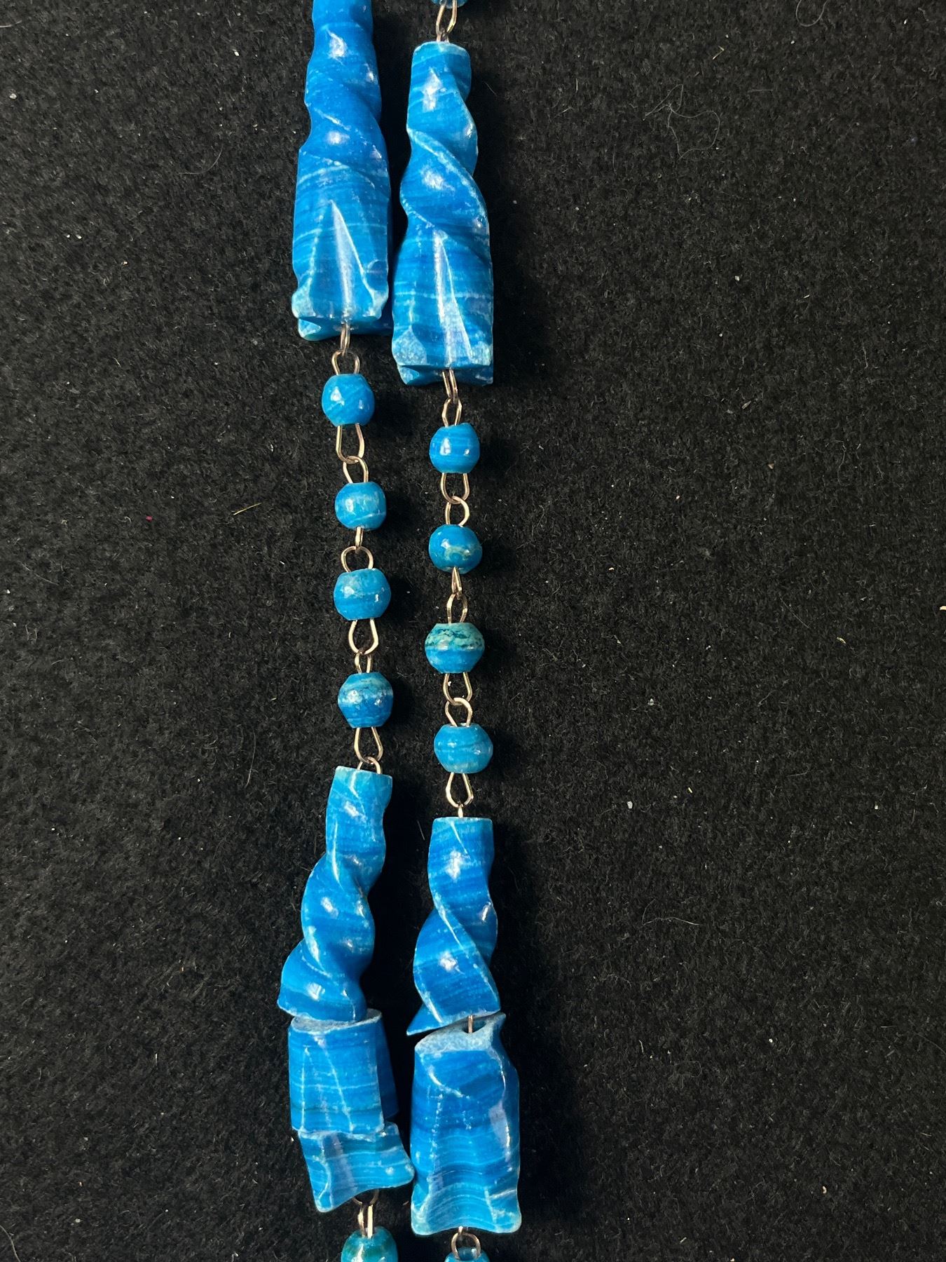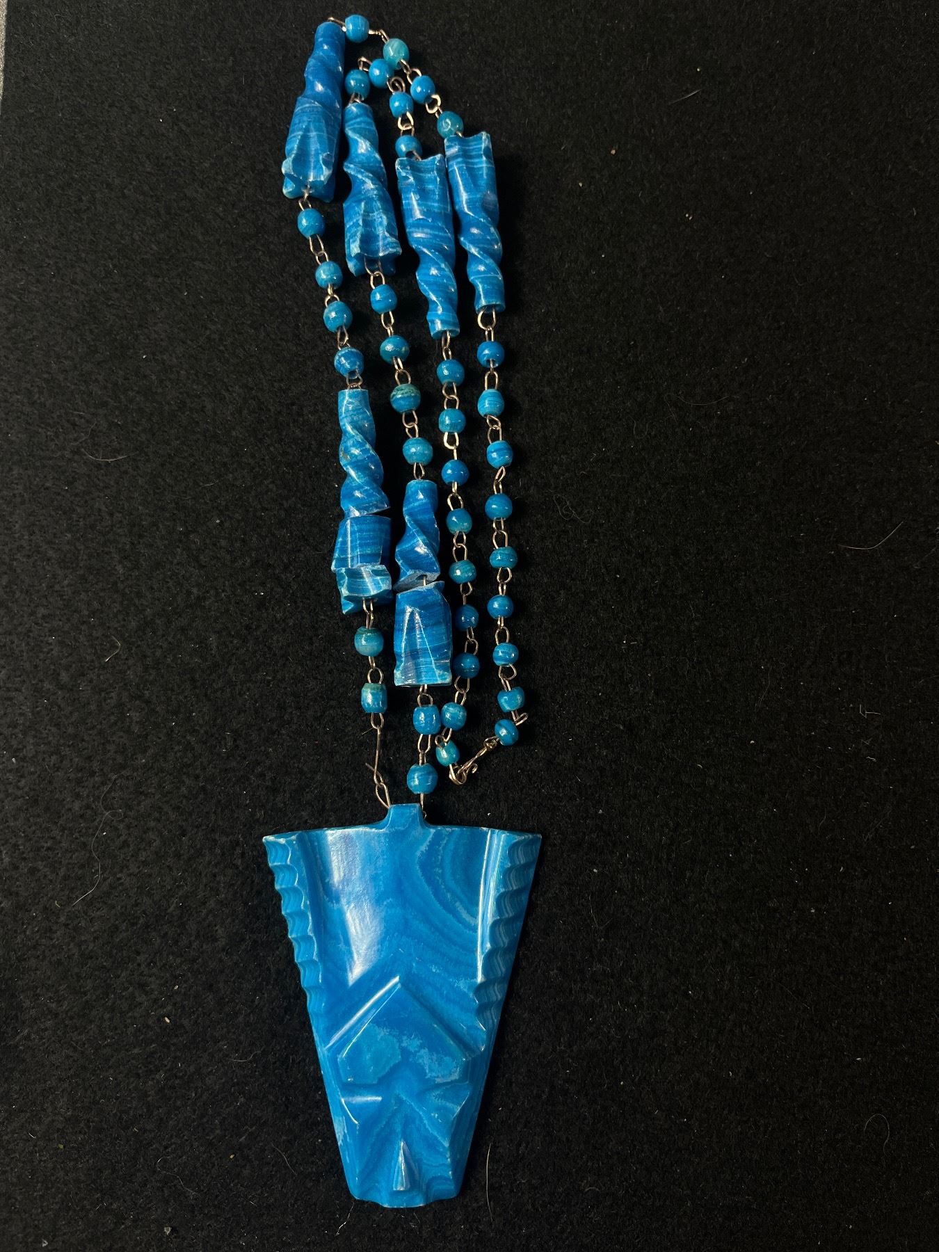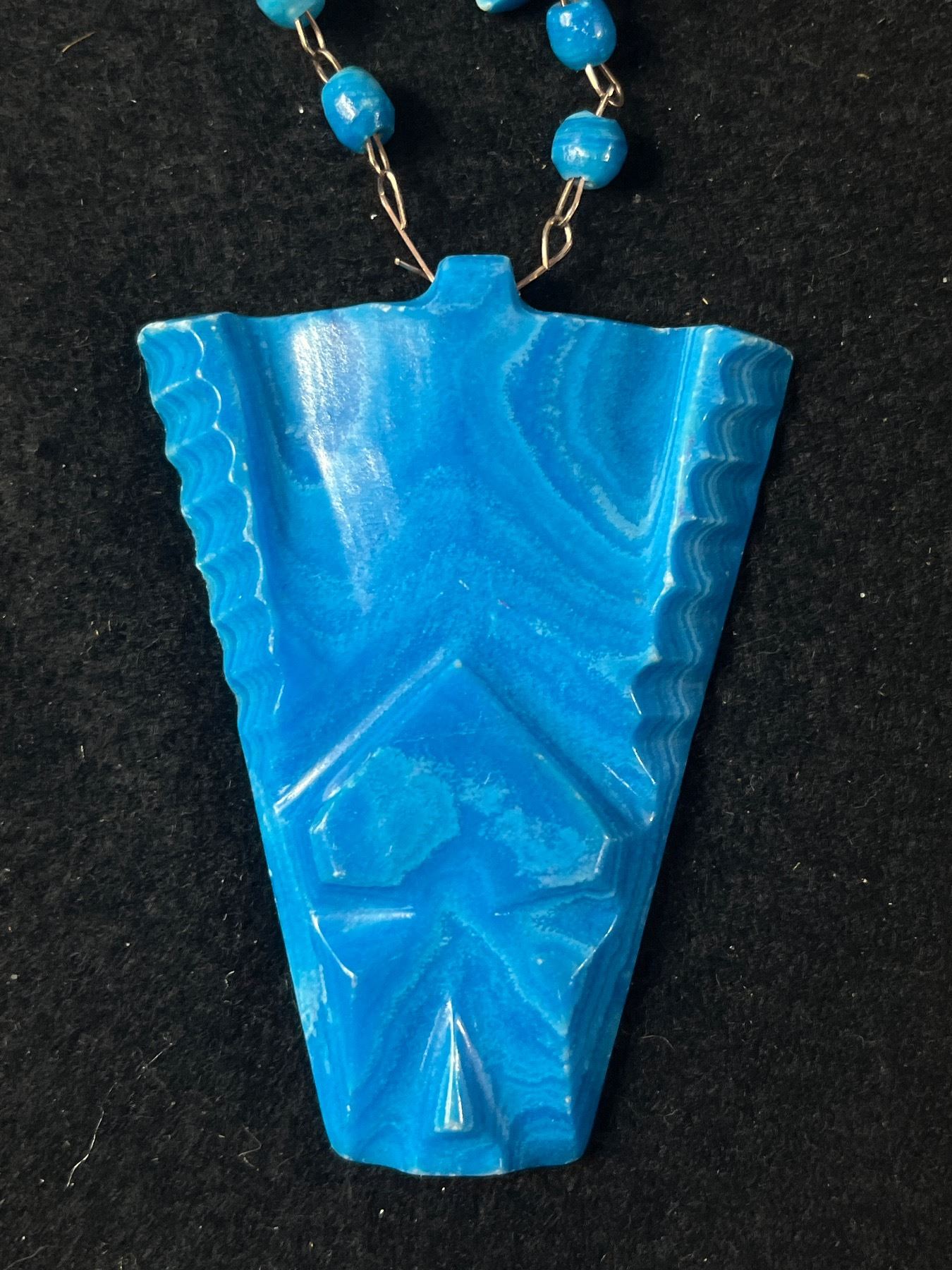 Hand Carved Blue Onyx/Marble Stone Aztec Warrior Face Pendant & Linked Beads Necklace