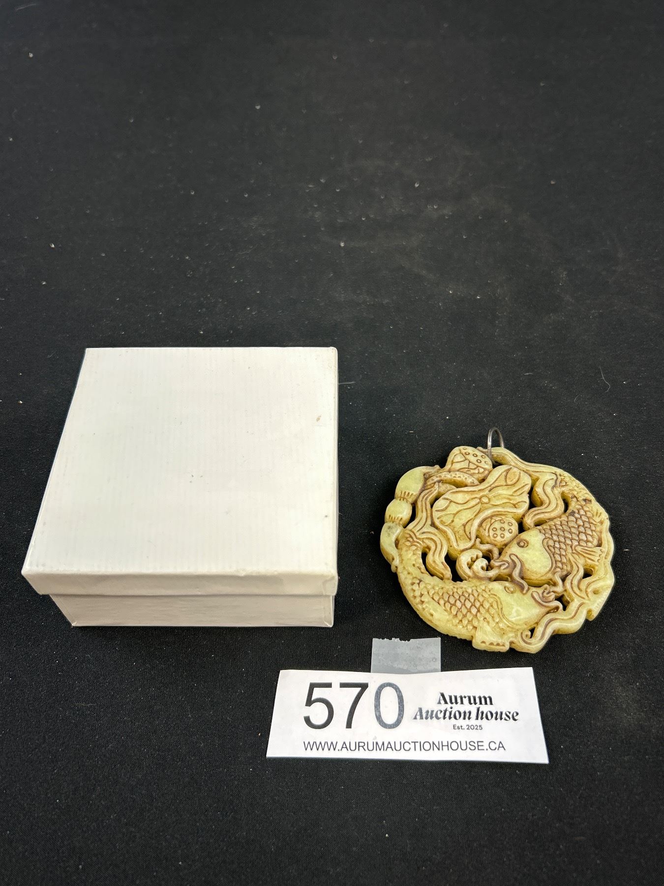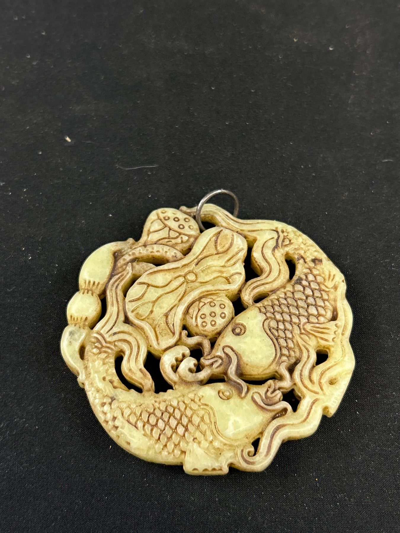 Hand Carved Fish Lotus Leaf Pendant 2 Sided 2.5"