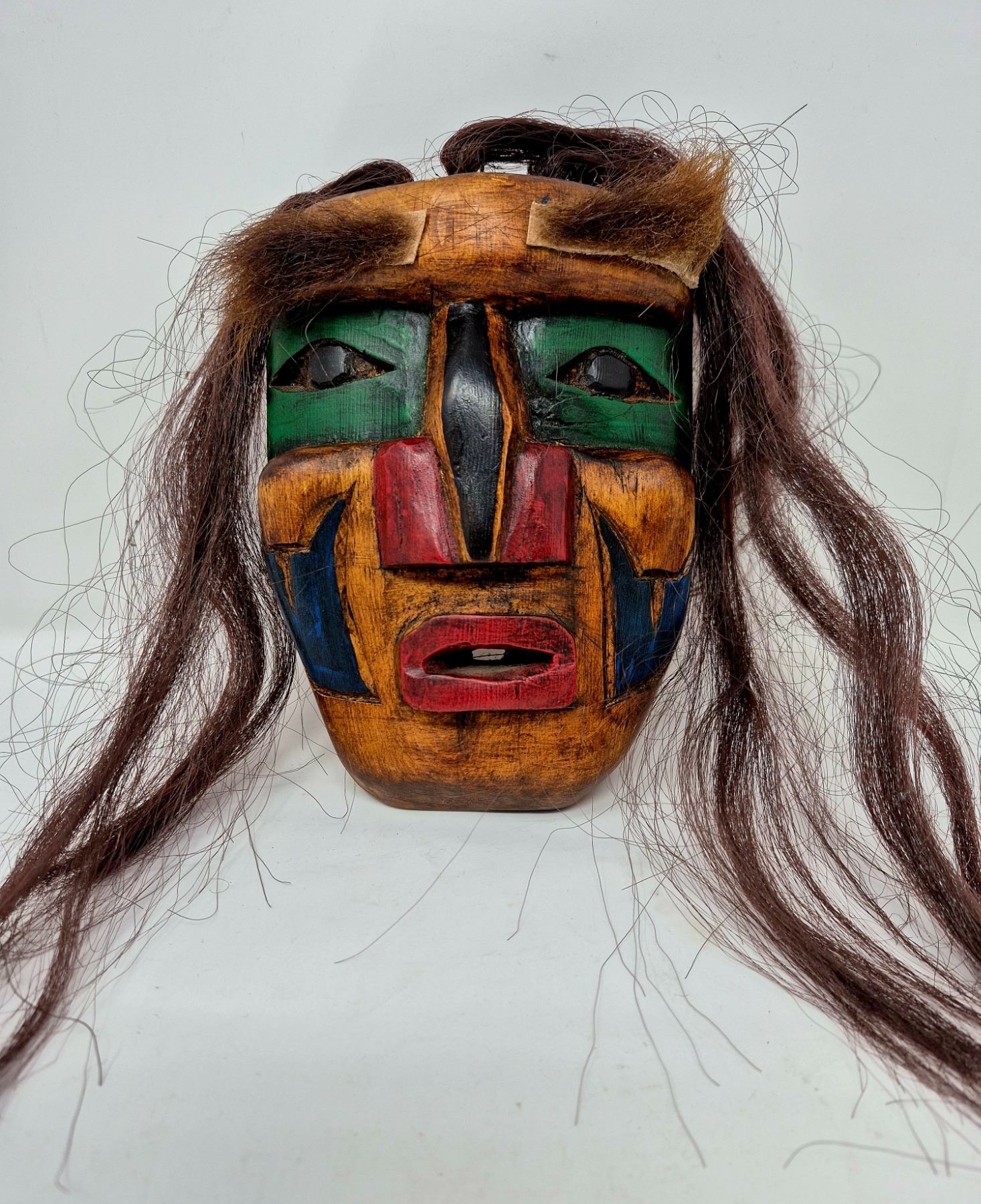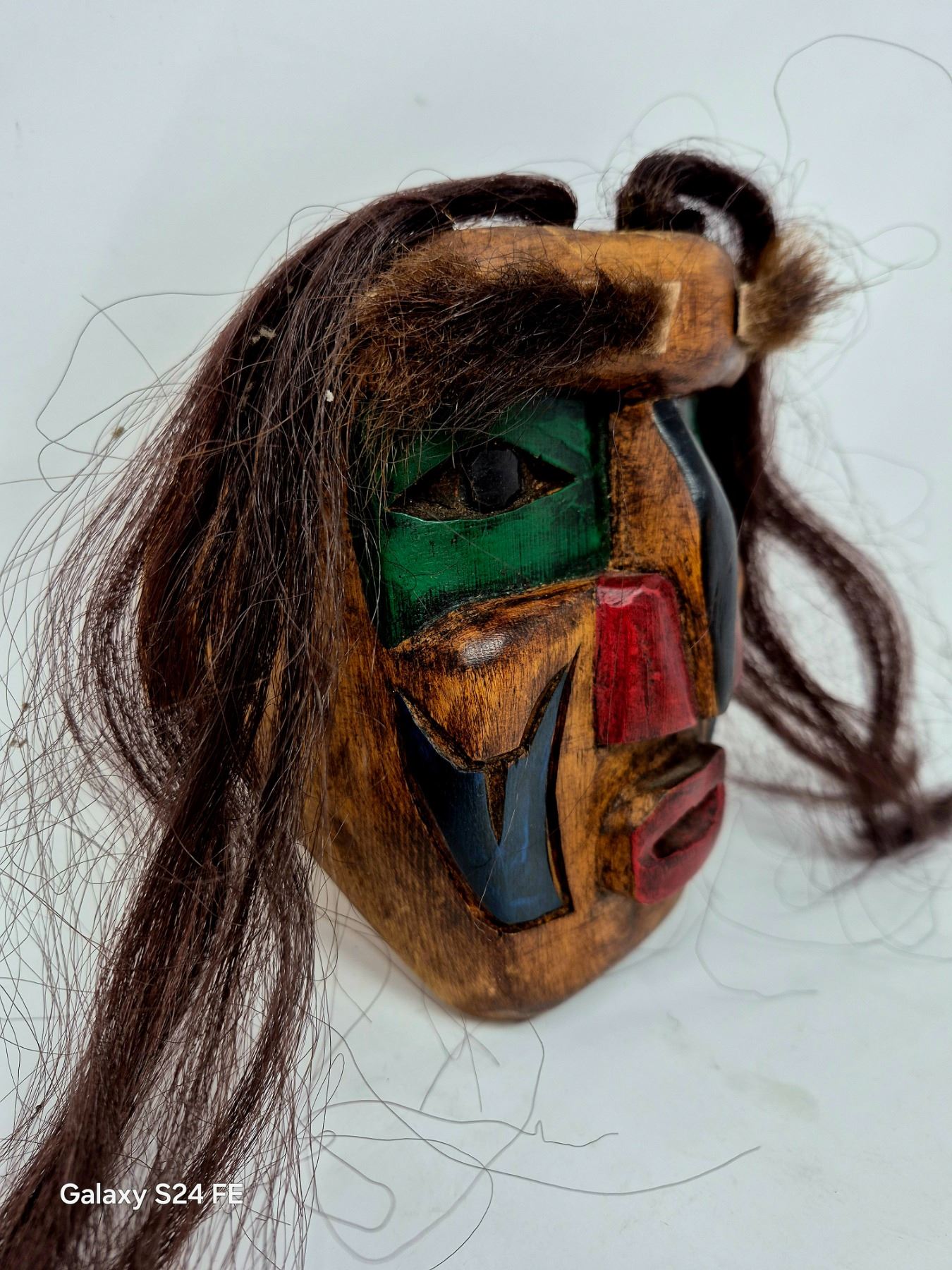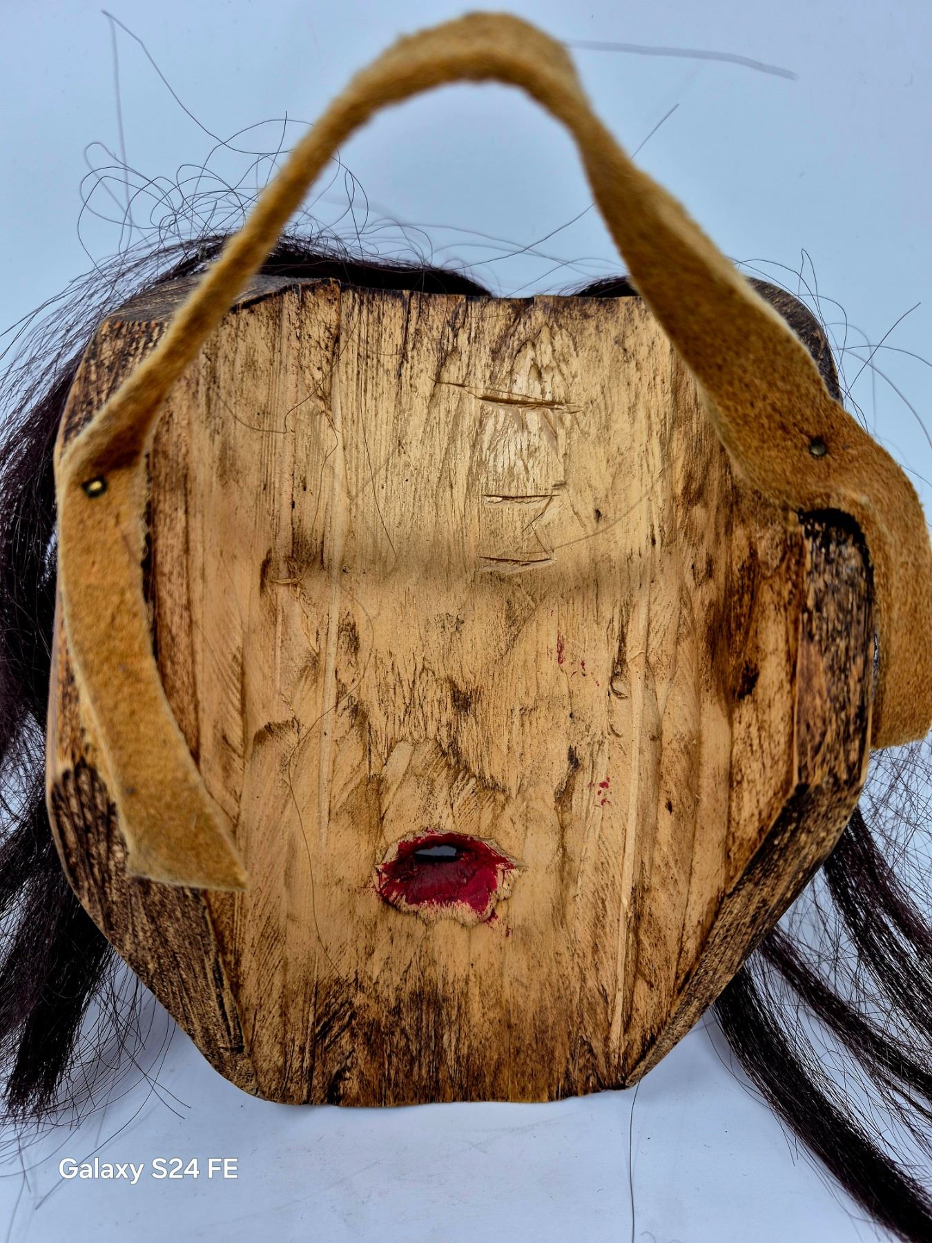 Striking tribal-style wood mask with bold colors, carved features, flowing hair, and rustic strap for display. Dramatic and expressive.