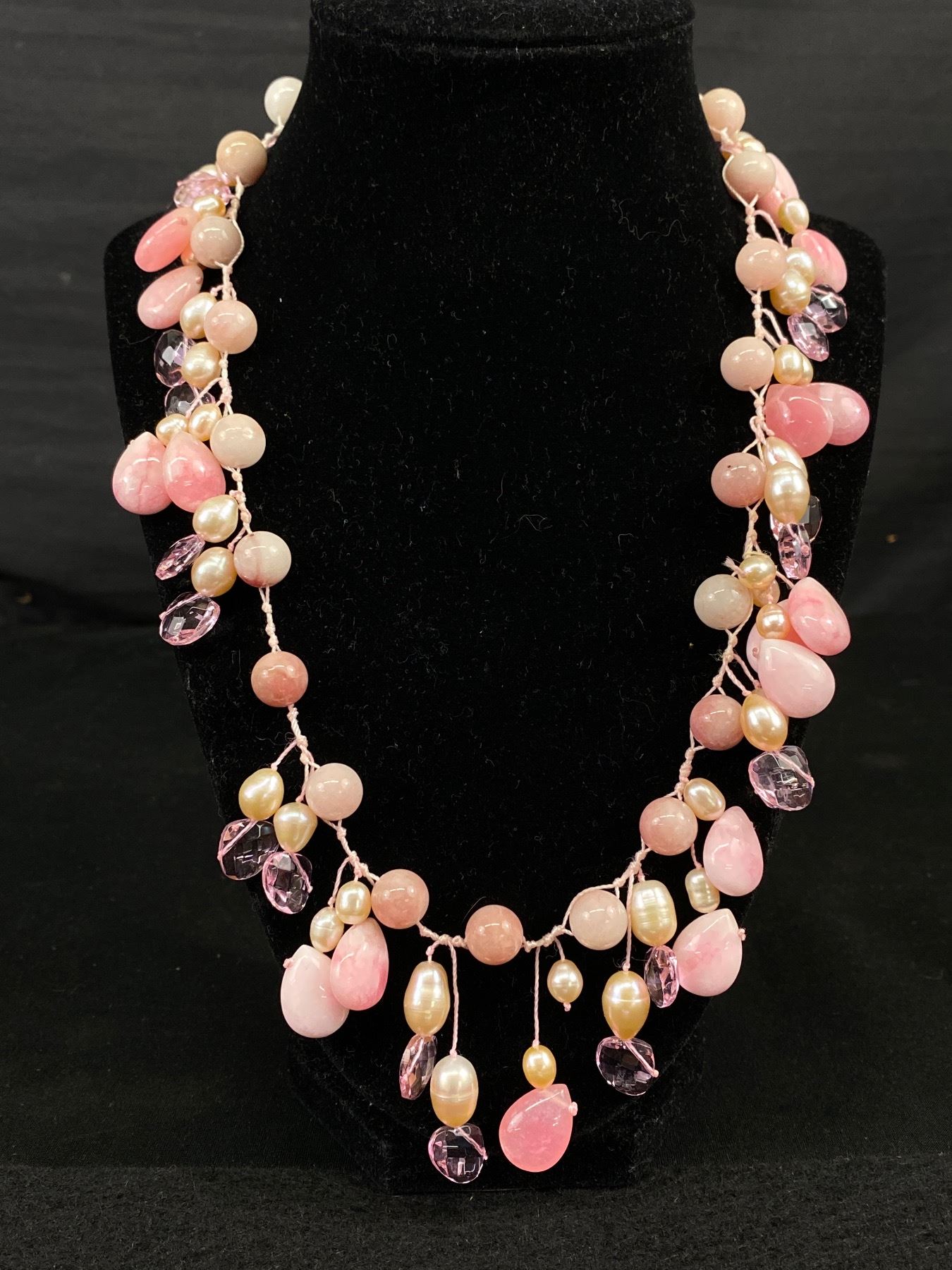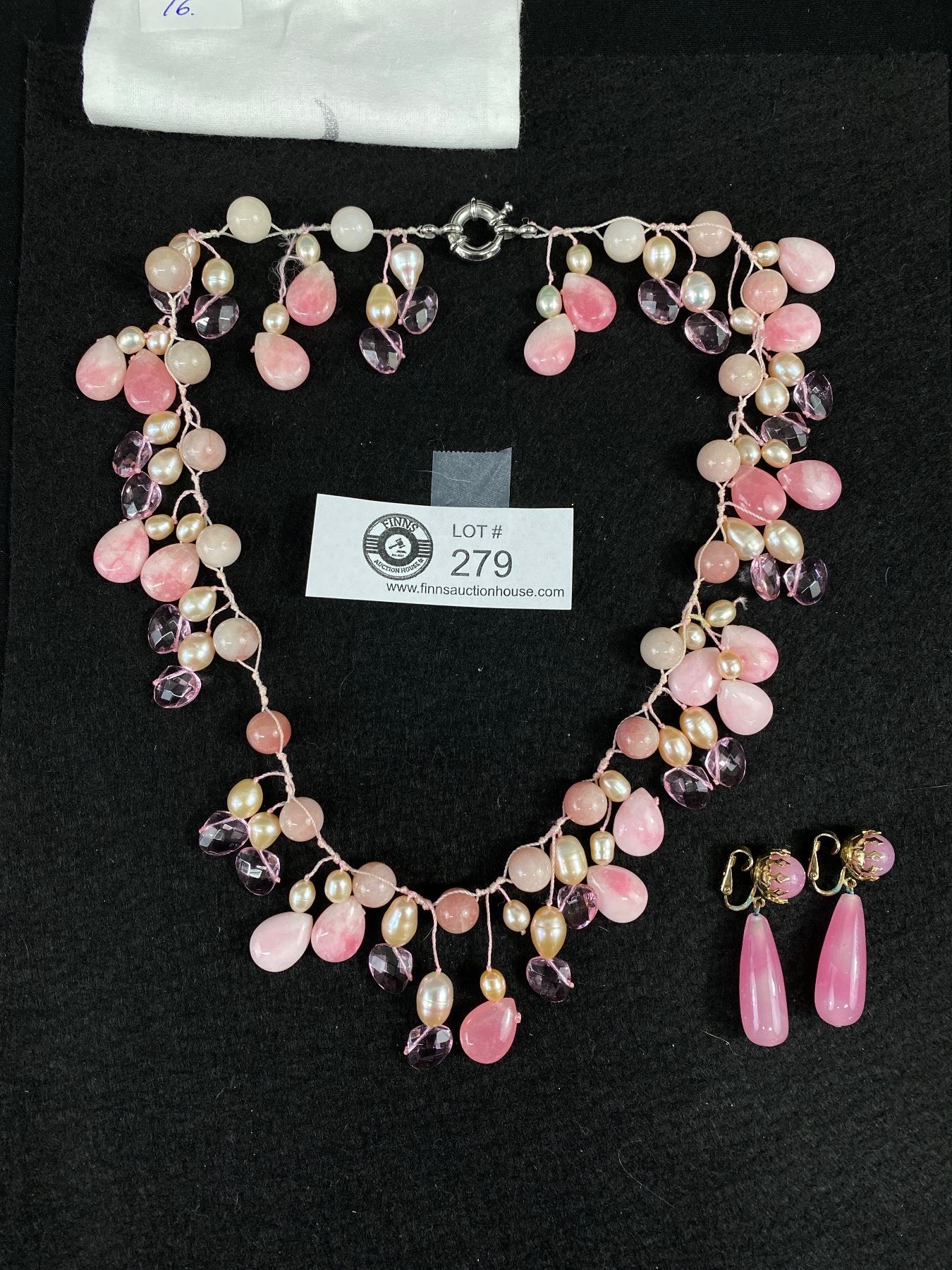 Hand Crafted Quartz Stone,Pearls & Glass Beads, Dangling Necklace & Pair Of Earrings