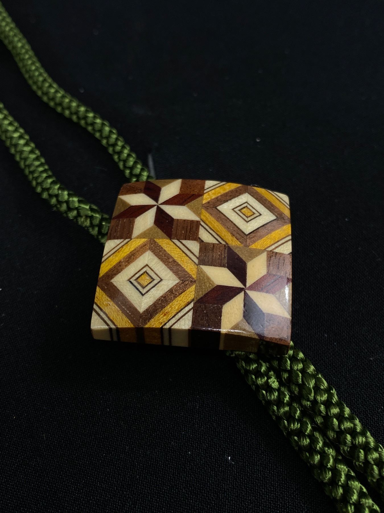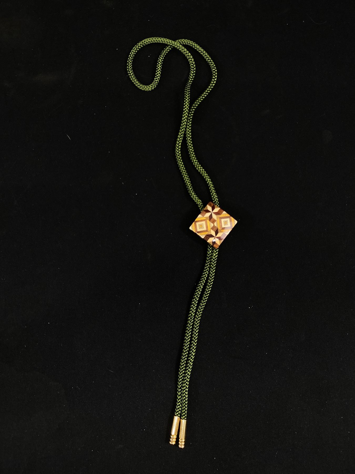 Hand Crafted Wood Inlay w/Green String Bolo Tie Exellent Condition. Just Like New