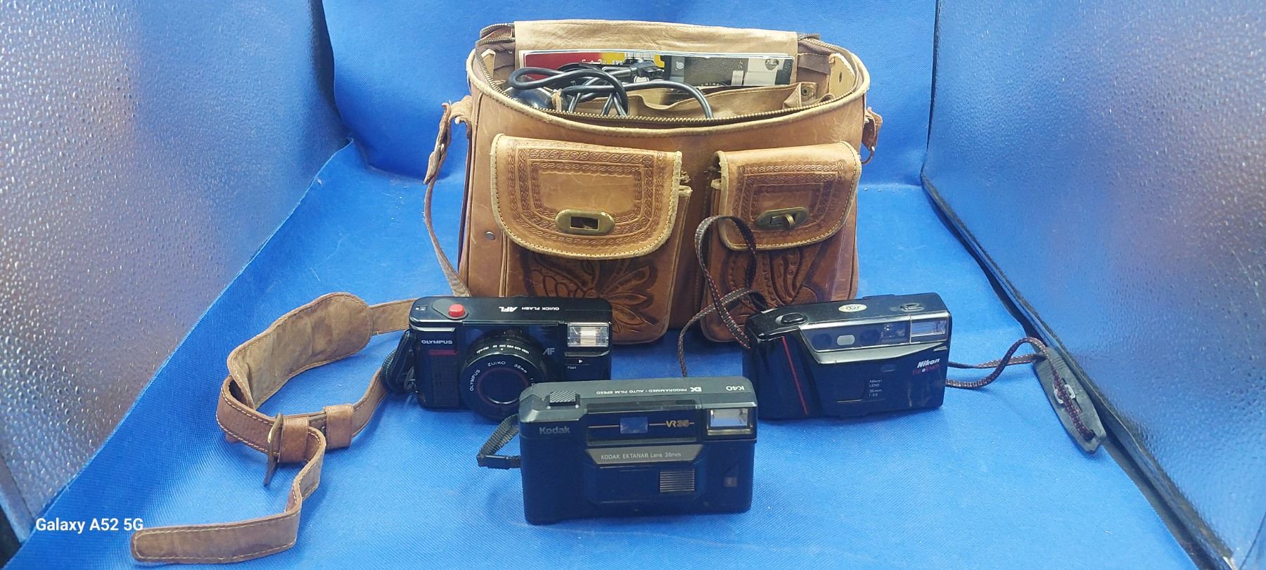 Hand carved leather Mexican camera bag containing several vintage cameras
