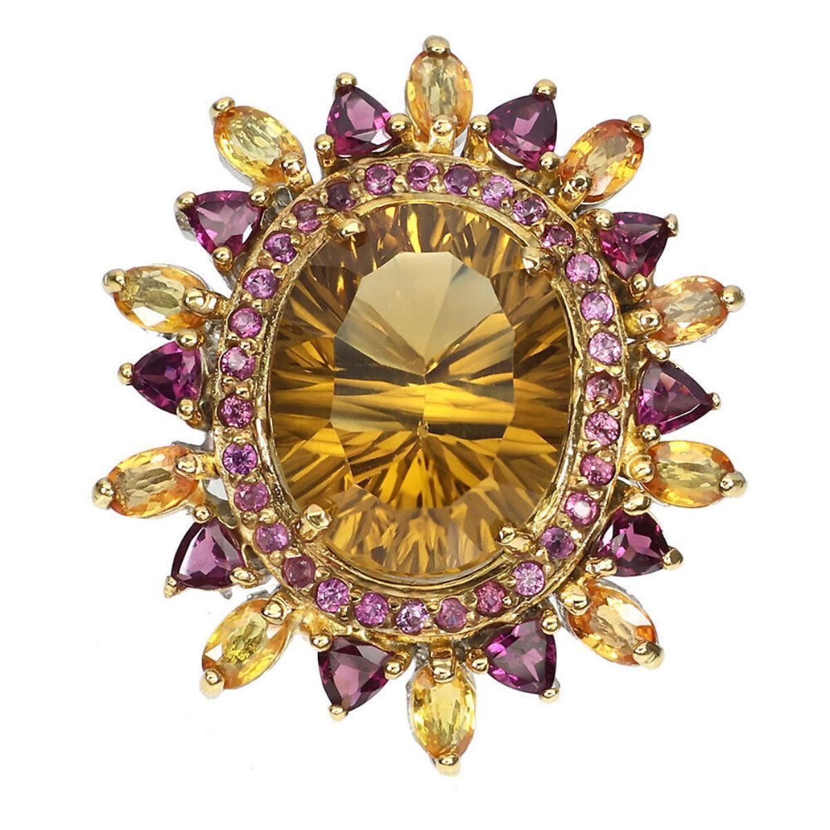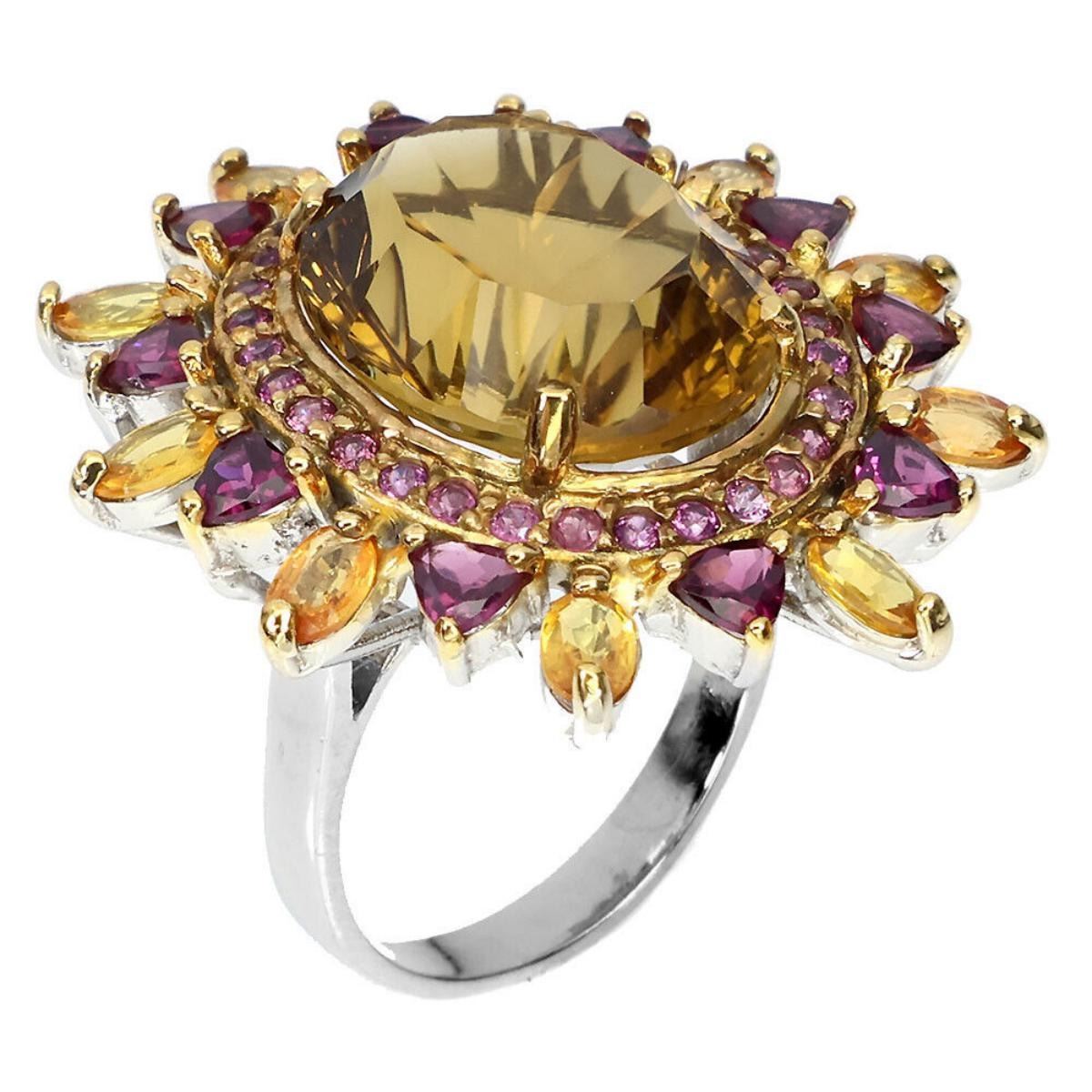 925 STERLING SILVER;PLATE-2-TONE WHITE & YELLOW 14K GOLD;RING SIZE-8.5(RESIZABLE);MAIN STONE-CITRINE;OTHER GEMS-RHODOLITE GARNET, SAPPHIRE;TOTAL WEIGHT-12.22 GRAM (TOTAL WEIGHT OF SILVER + STONE);DIMENSION-* STONE 1.5 TO 17.0 X 14.0 MM.* RING SIZE 8.5* FACE RING 35.0 X 30.0 MM.;MAIN STONE SHAPE-OVAL CONCAVE ;MAIN STONE COLOR-YELLOW;CLARITY/GRADE-IF;TREATMENT-UNHEATED;ORIGIN-BRAZIL;HARDNESS-7;