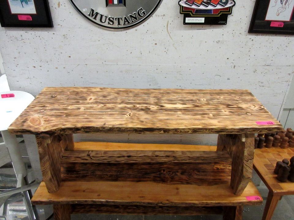 Burnt satin stain finish. 48" x 18" x 18" Tall.