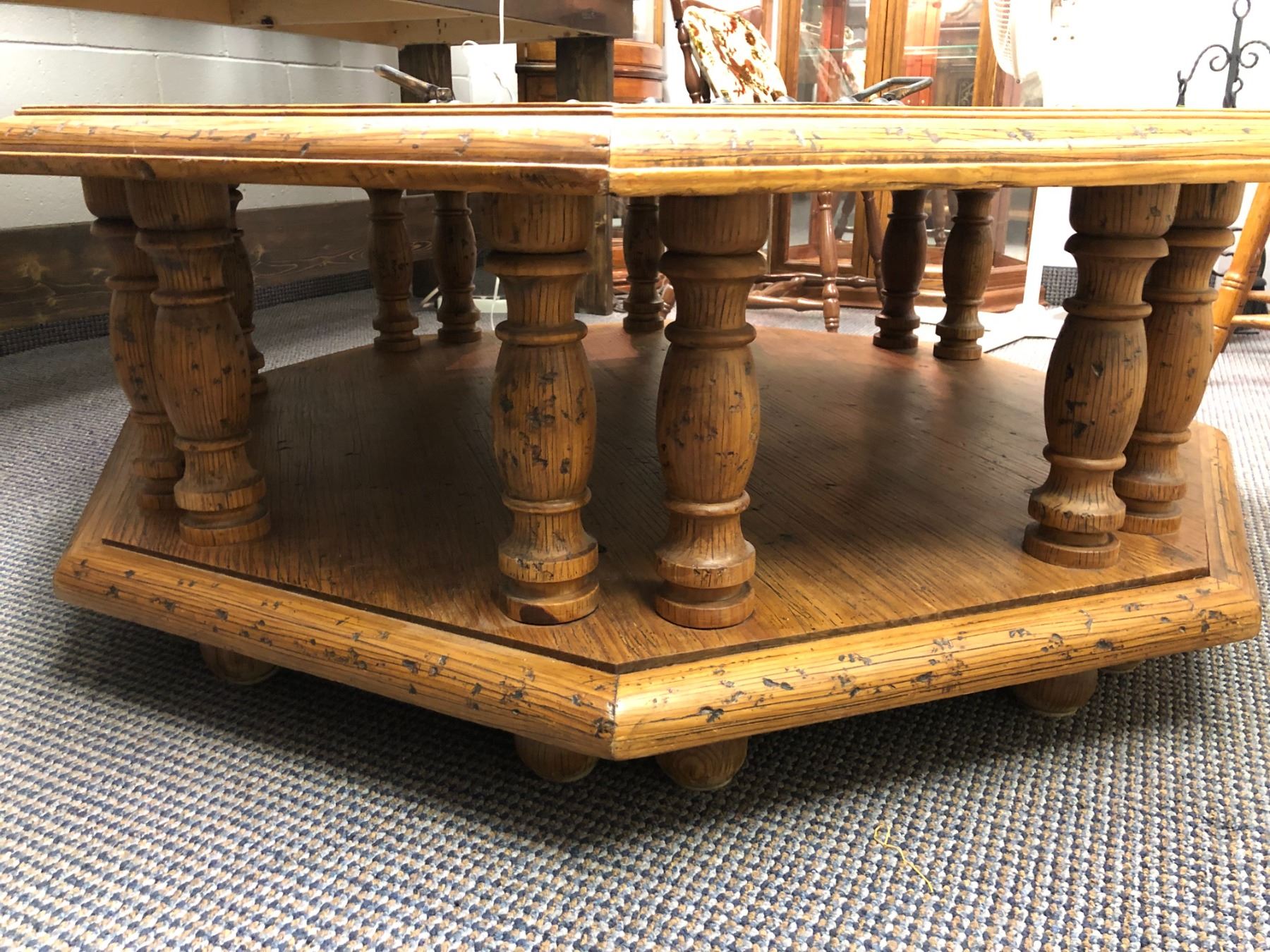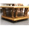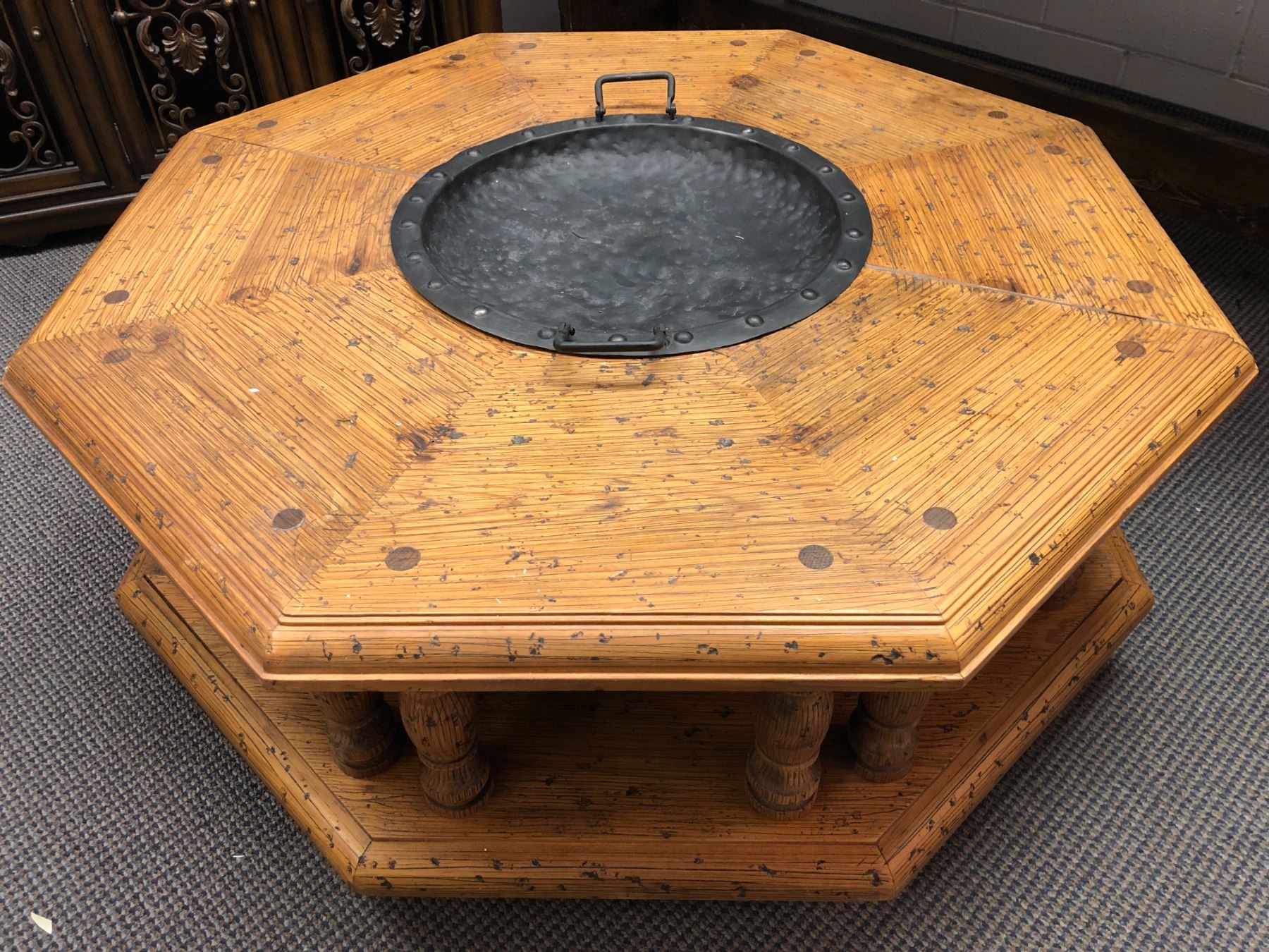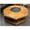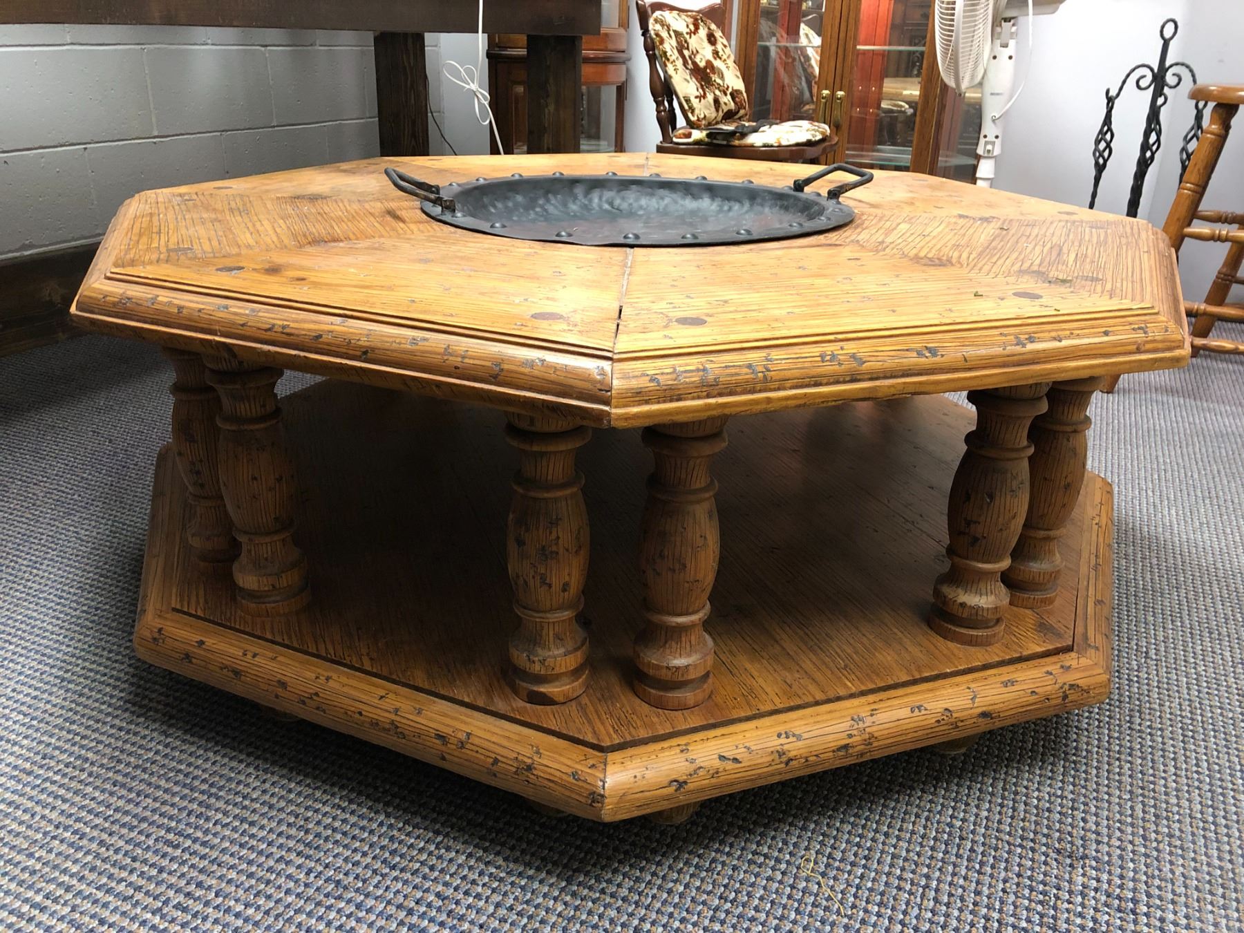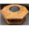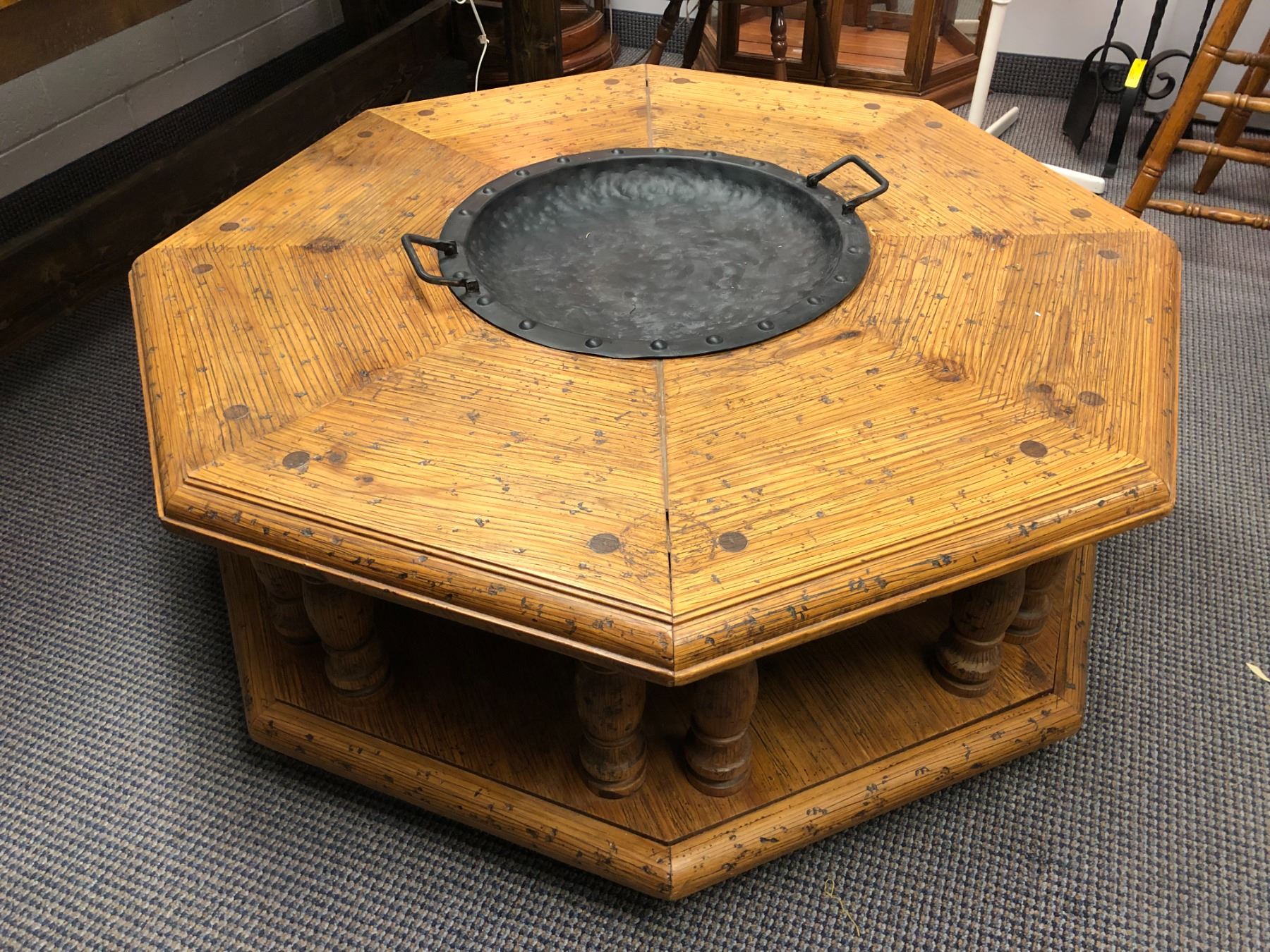 Handcrafted wooden octagon coffee table w/ hammered metal bowl insert