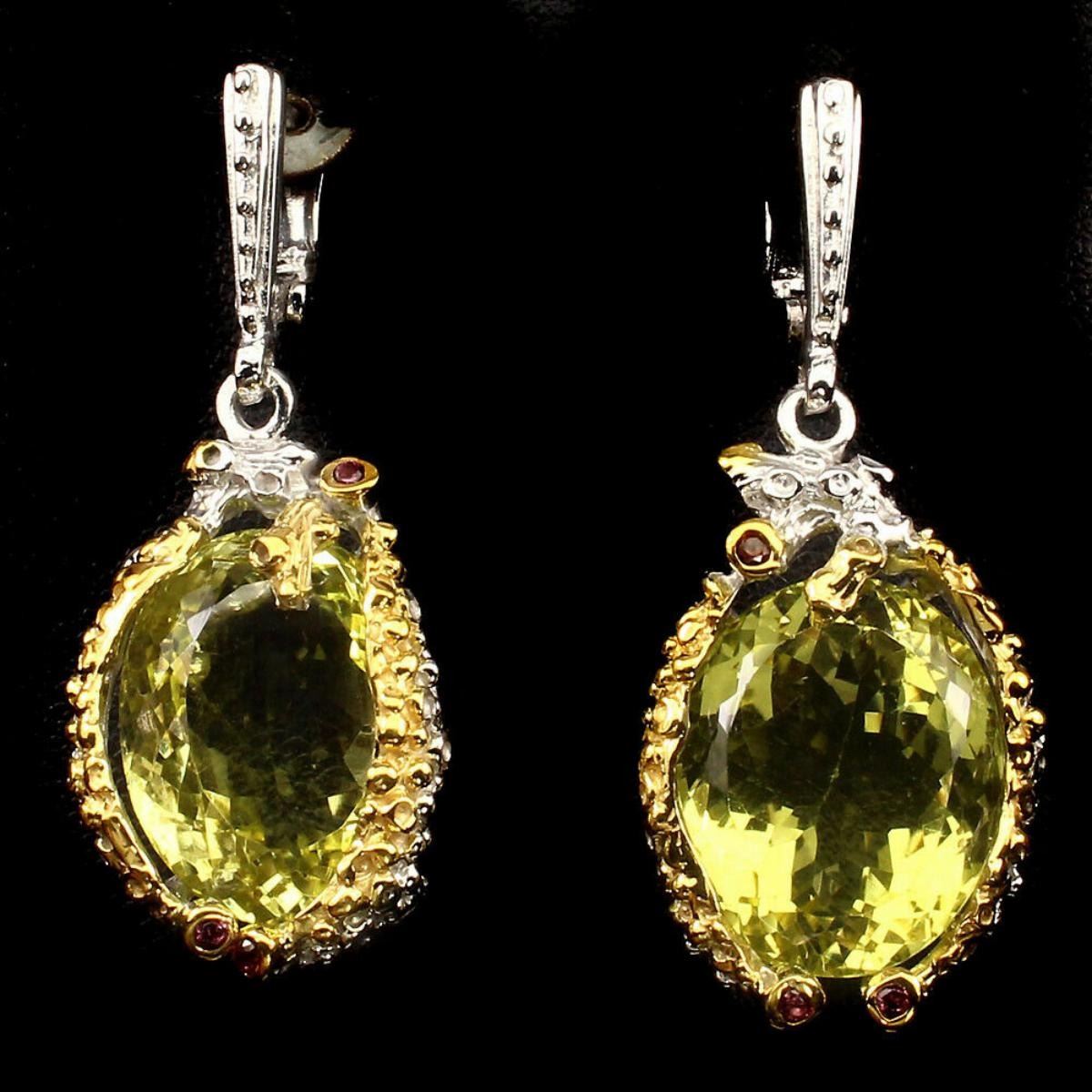 925 STERLING SILVER;PLATE...2-TONE WHITE & YELLOW 14K GOLD;MAIN STONE-LEMON QUARTZ;OTHER GEMS-RHODOLITE GARNET;TOTAL WEIGHT-88.48 CT (TOTAL WEIGHT OF SILVER + STONE)DIMENSION* STONE 1.5 TO 17.0 X 15.0 MM. * FACE EARRINGS 41.0 X 18.0 MM.MAIN STONE SHAPE-OVAL CUT;MAIN STONE COLOR-TOP LEMON YELLOW;CLARITY/GRADE-IF;LUSTER-EXQUISITE;TREATMENT-UNHEATED;ORIGINBRAZIL;HARDNESS7.0 - 7.5;