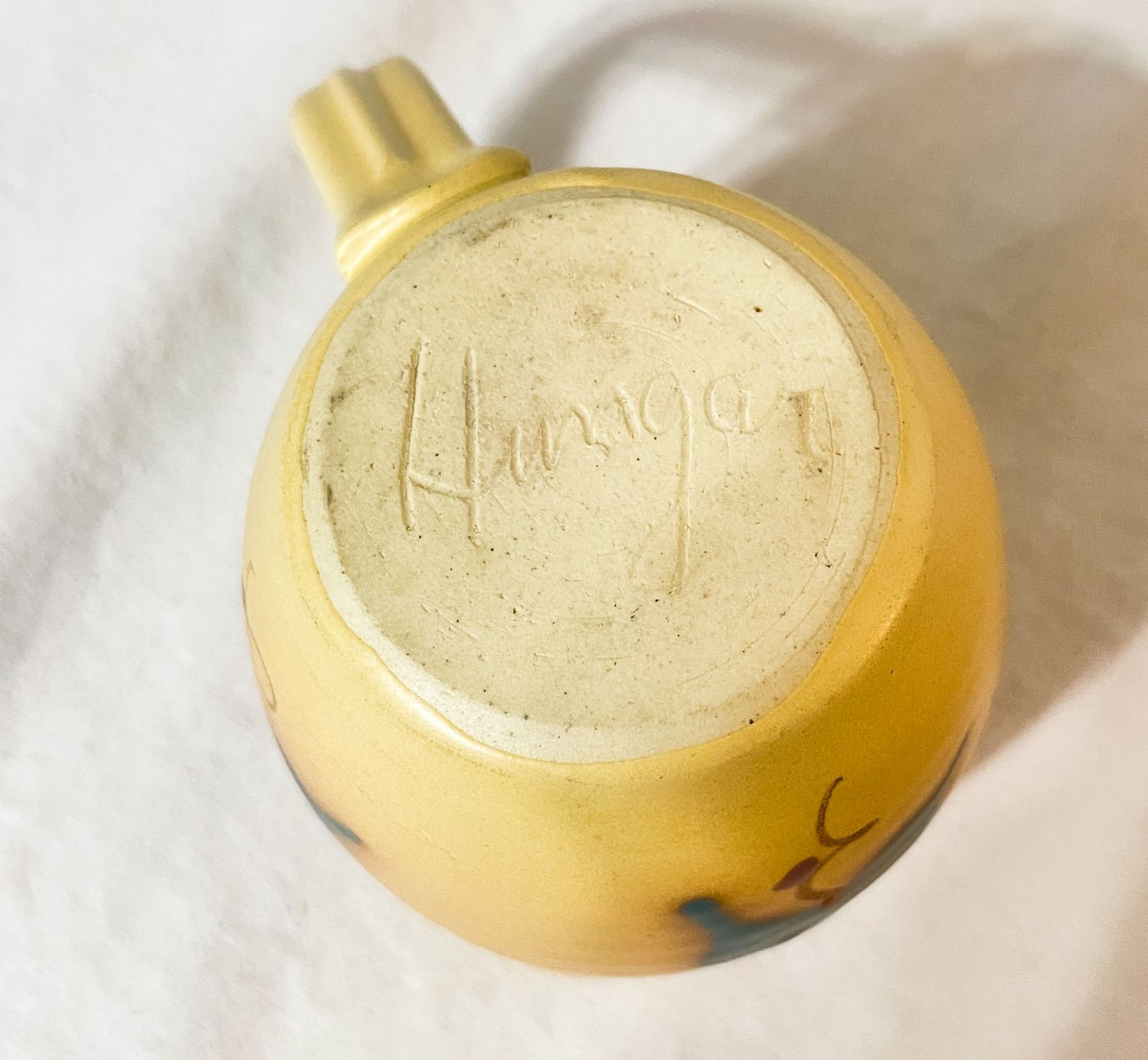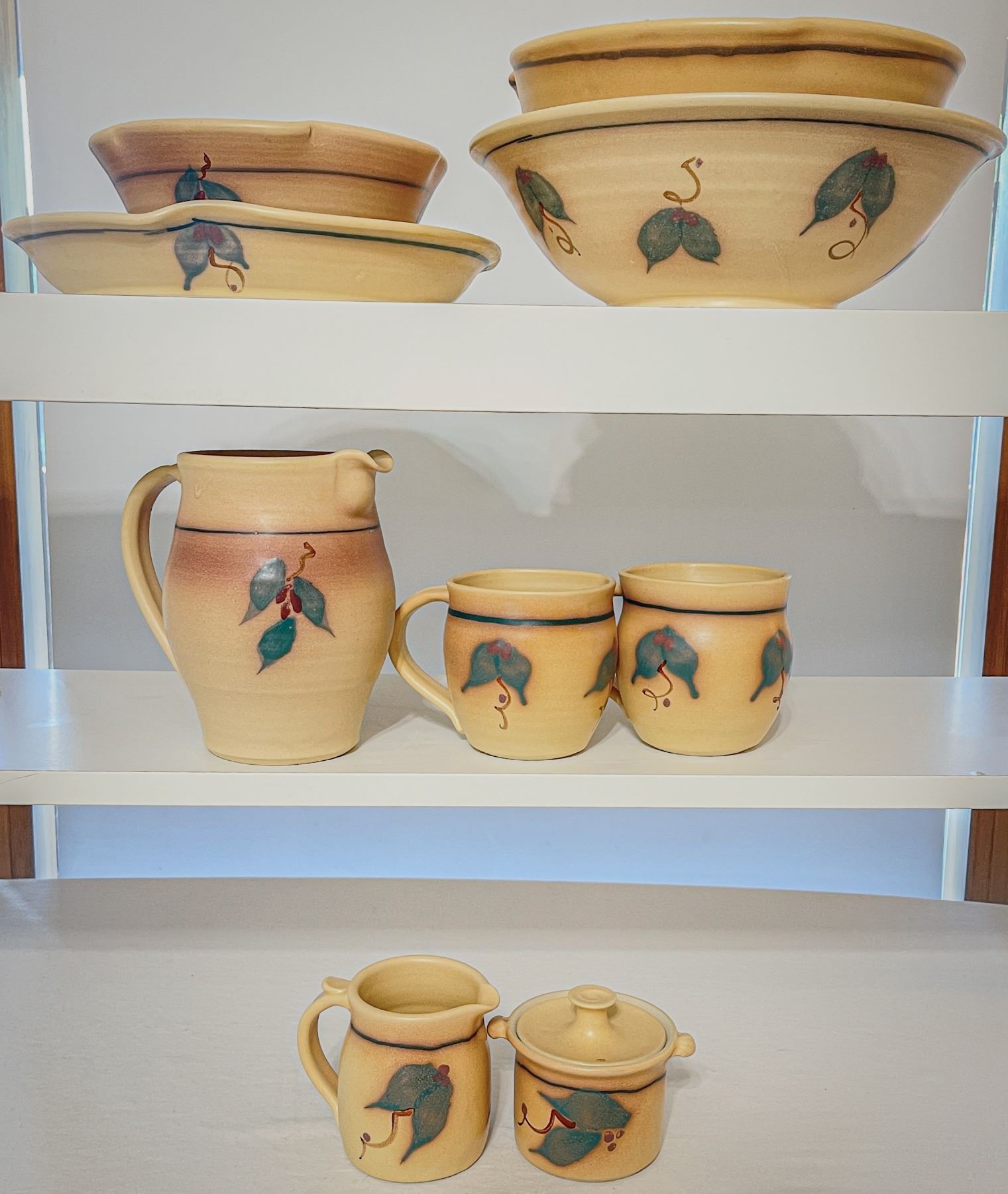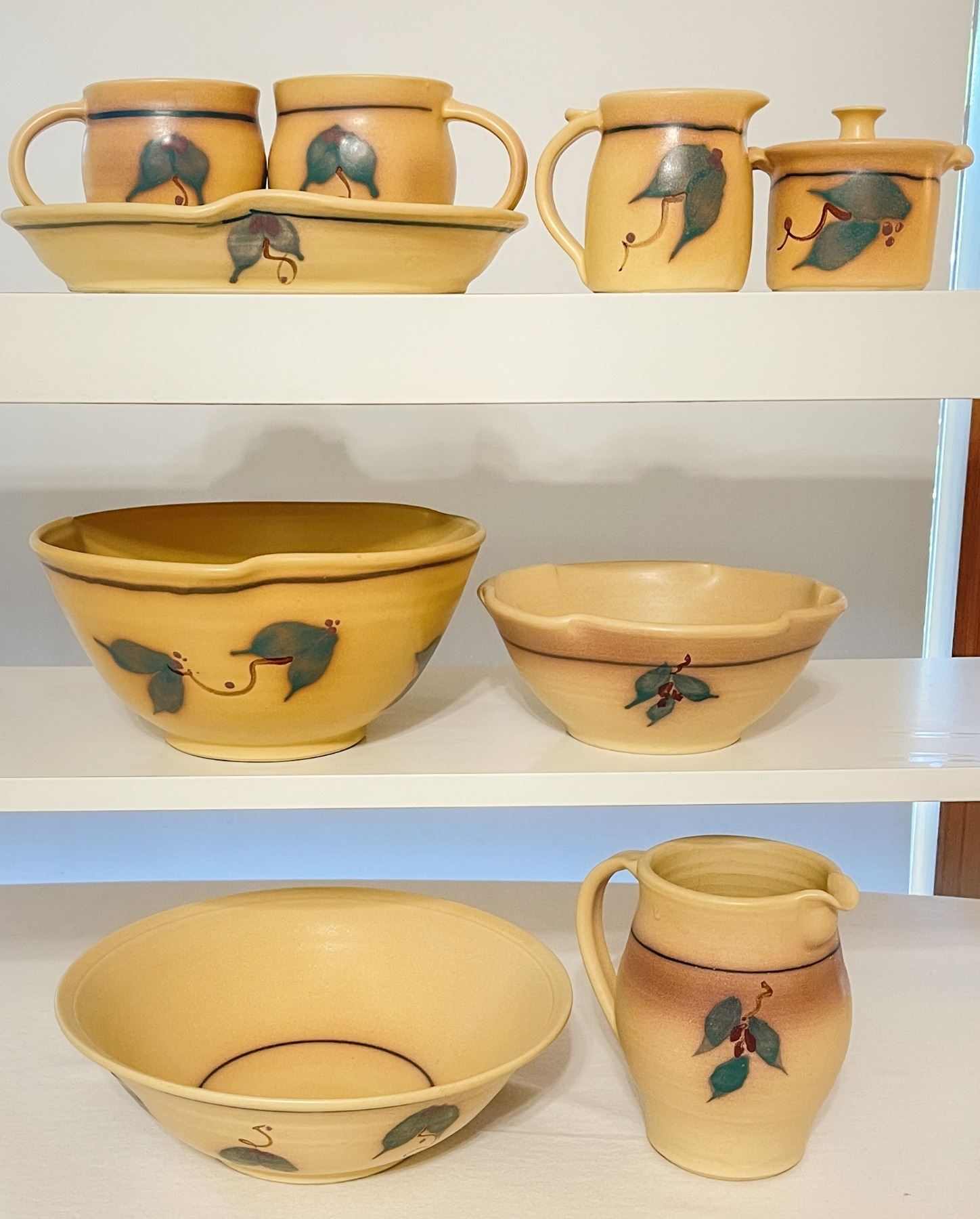 Charming set of handmade, artist-signed pottery in warm earth tones with hand-painted leaf motifs. Includes sugar with lid, creamer, 2 mugs, pitcher, 3 bowls in graduated sizes, and a serving platter. All pieces in good used condition. Unique and functional artisan stoneware, perfect for display or everyday use.