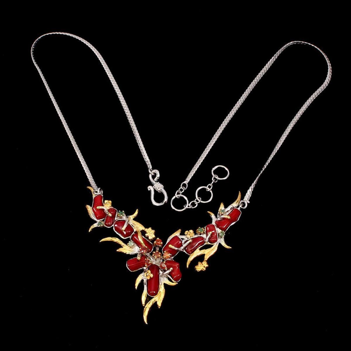 925 STERLING SILVER;PLATE2-TONE WHITE & YELLOW 14K GOLD;LENGTH (INCHES)19.5;MAIN STONECORAL;OTHER GEMSEMERALD,SAPPHIRE;TOTAL WEIGHT123.50 CT (TOTAL WEIGHT OF SILVER + STONE)DIMENSION* STONE 2.0 TO 13.0 X 4.0 MM. * STONES PART LENGTH 65.0 X 38.0 MM.;MAIN STONE SHAPENATURAL SHAPE;MAIN STONE COLORTOP RICH RED;TREATMENTUNHEATED;ORIGINCROATIA;HARDNESS3.0;