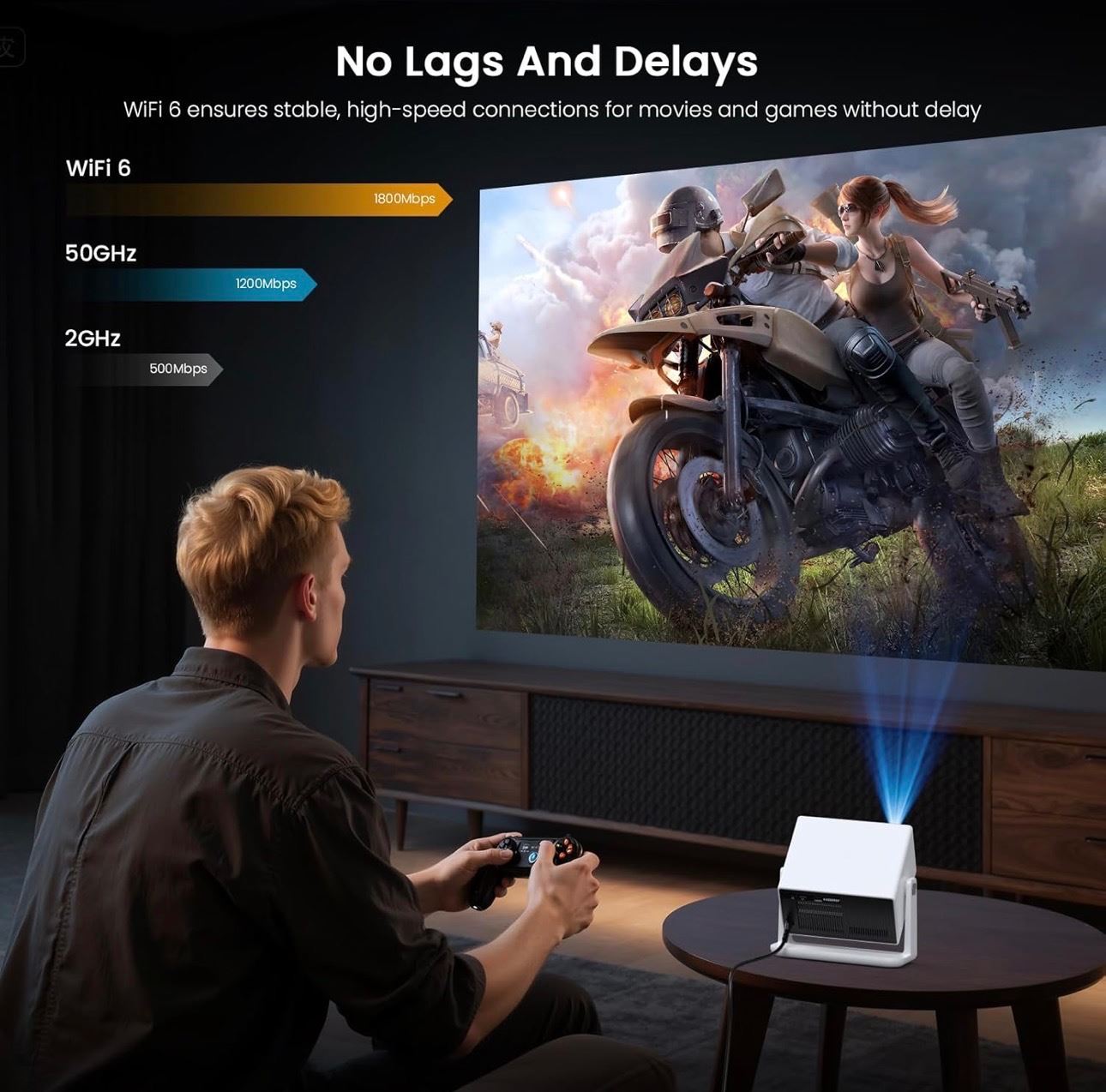 - Ultra-Fast Wifi 6, No Latency; Enjoy effortless screen mirroring from both iOS and Android devices to your movie projector with ultra-fast Wi-Fi 6 connectivity. Compatible with 2.4GHz and 5GHz networks