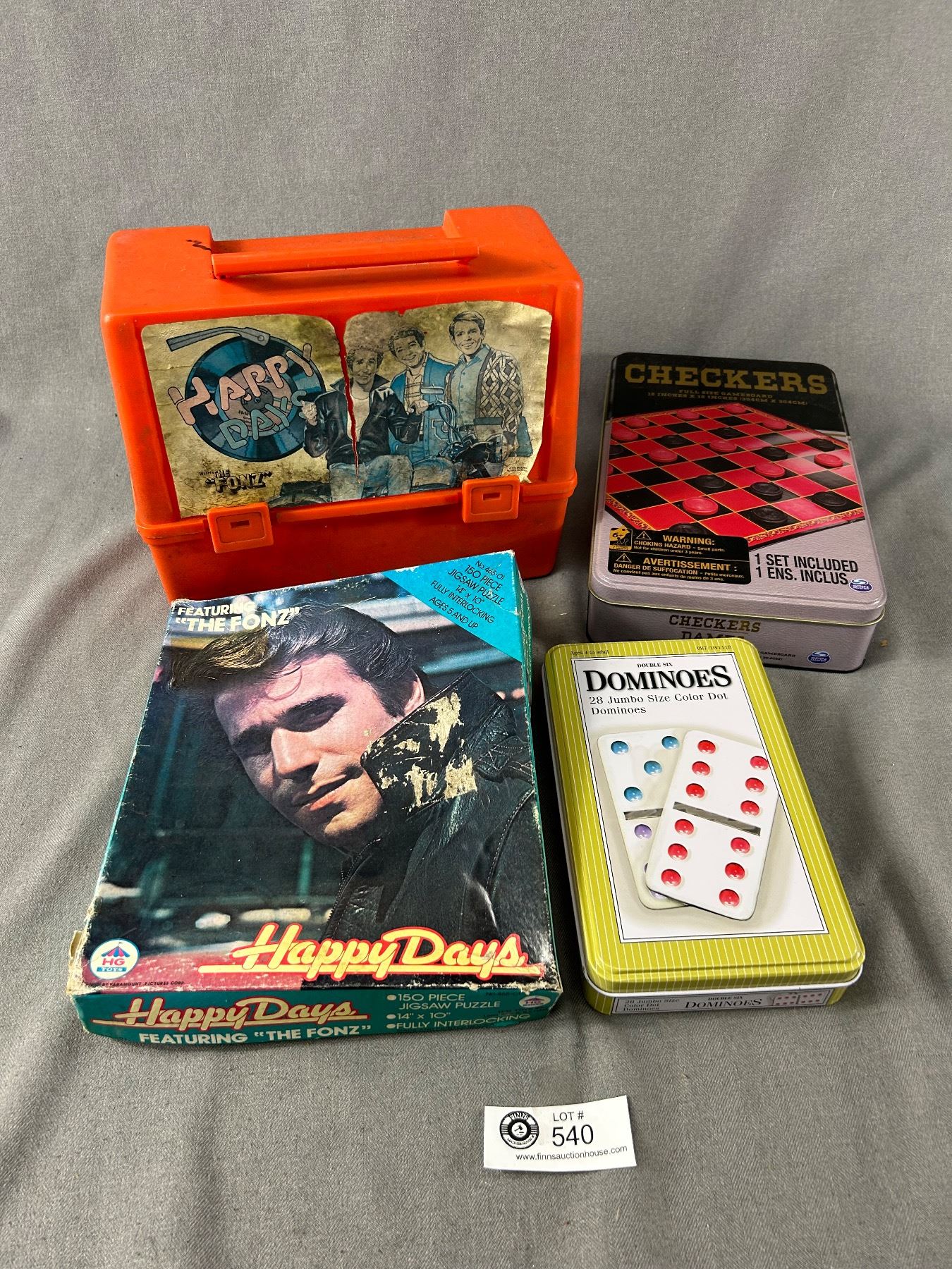 Happy Days "The Fonz" Lunch Box And Puzzle & Dominos & Checkers Games In Tin Box