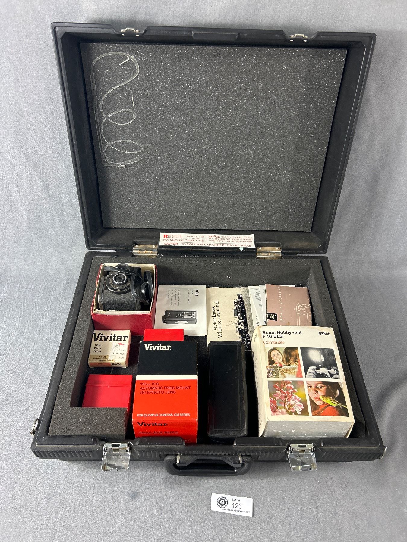 Hard Plastic Case w/ Vintage Ensign Camera, Vivitar Tele-835aw, Vivitar 135mm f2.8 Auto, Vivitar Telephoto Lens, Braun Hobby-mat + Various Slides & Manuals