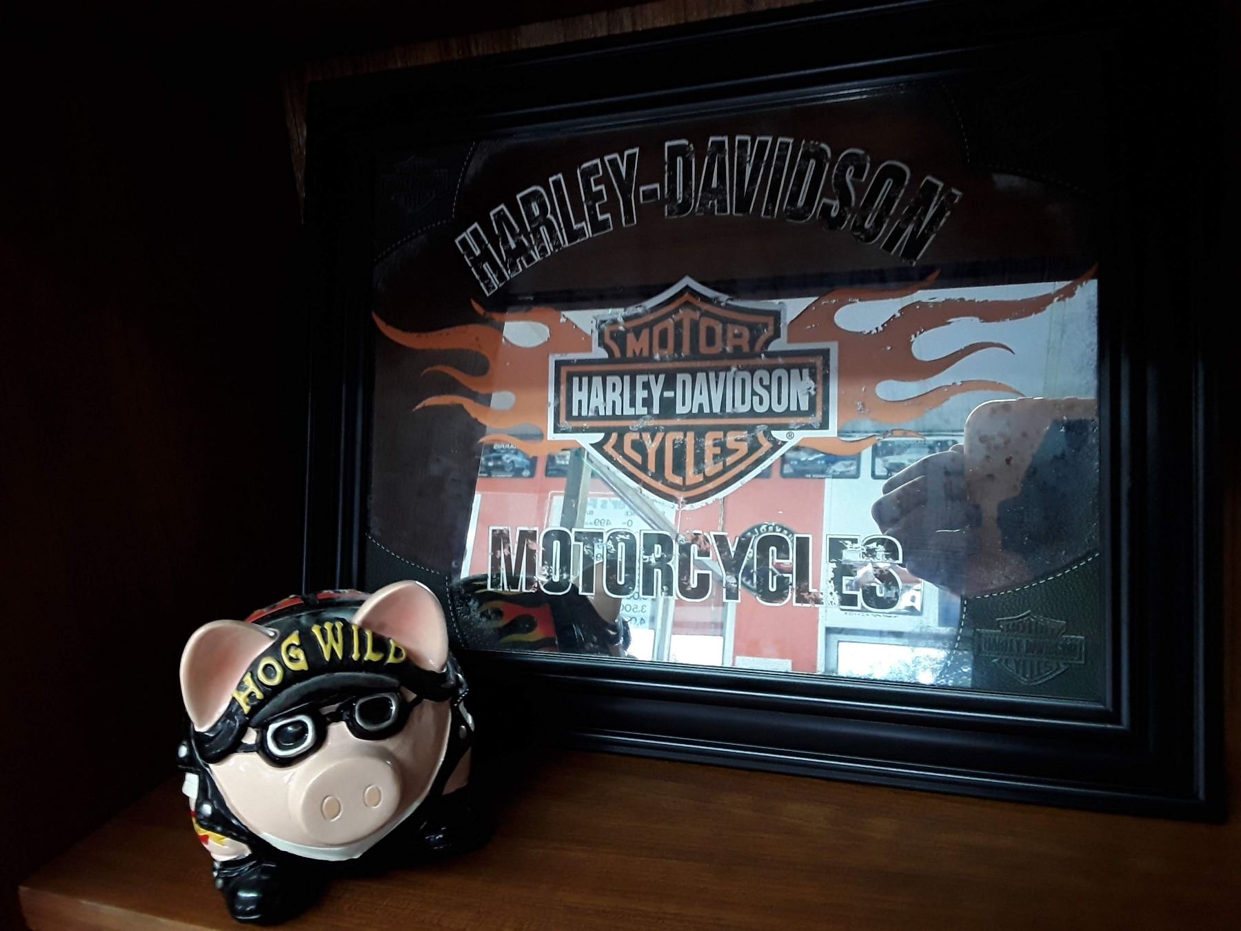 Harley Davidson Mirror & HOG Piggy Bank -- 17% Buyer Fee. Payment Processed through Live Auction World ( Visa or Master Card ) pick up Saturday, or Tuesday
