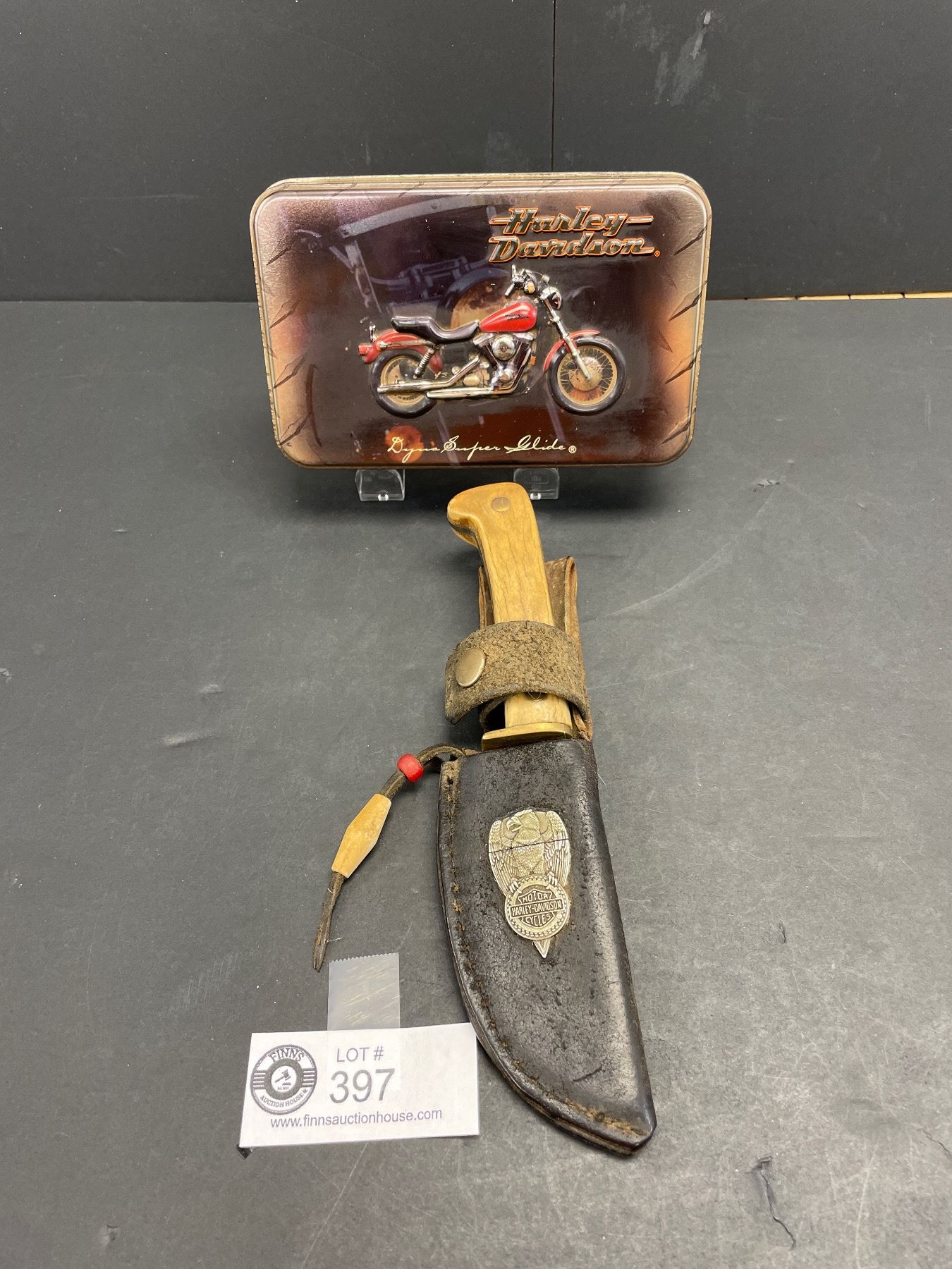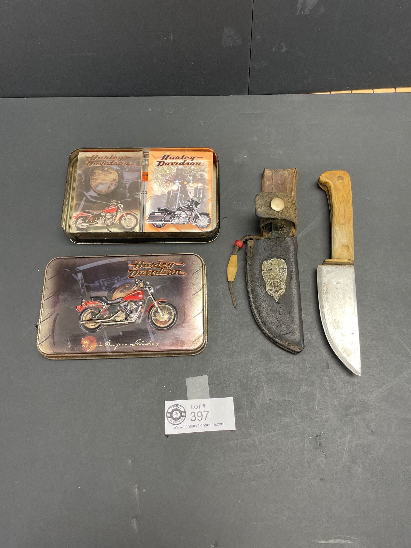 Harley Davidson Tin with 2 Unopened Packs of Cards with Harley Davidson Knife and Sheath
