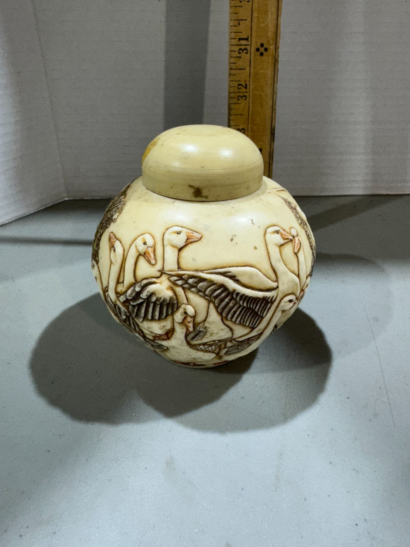 Harmony Kingdom "In a Gaggle" Jardinia lidded jar, which features a low-relief carving of geese.
