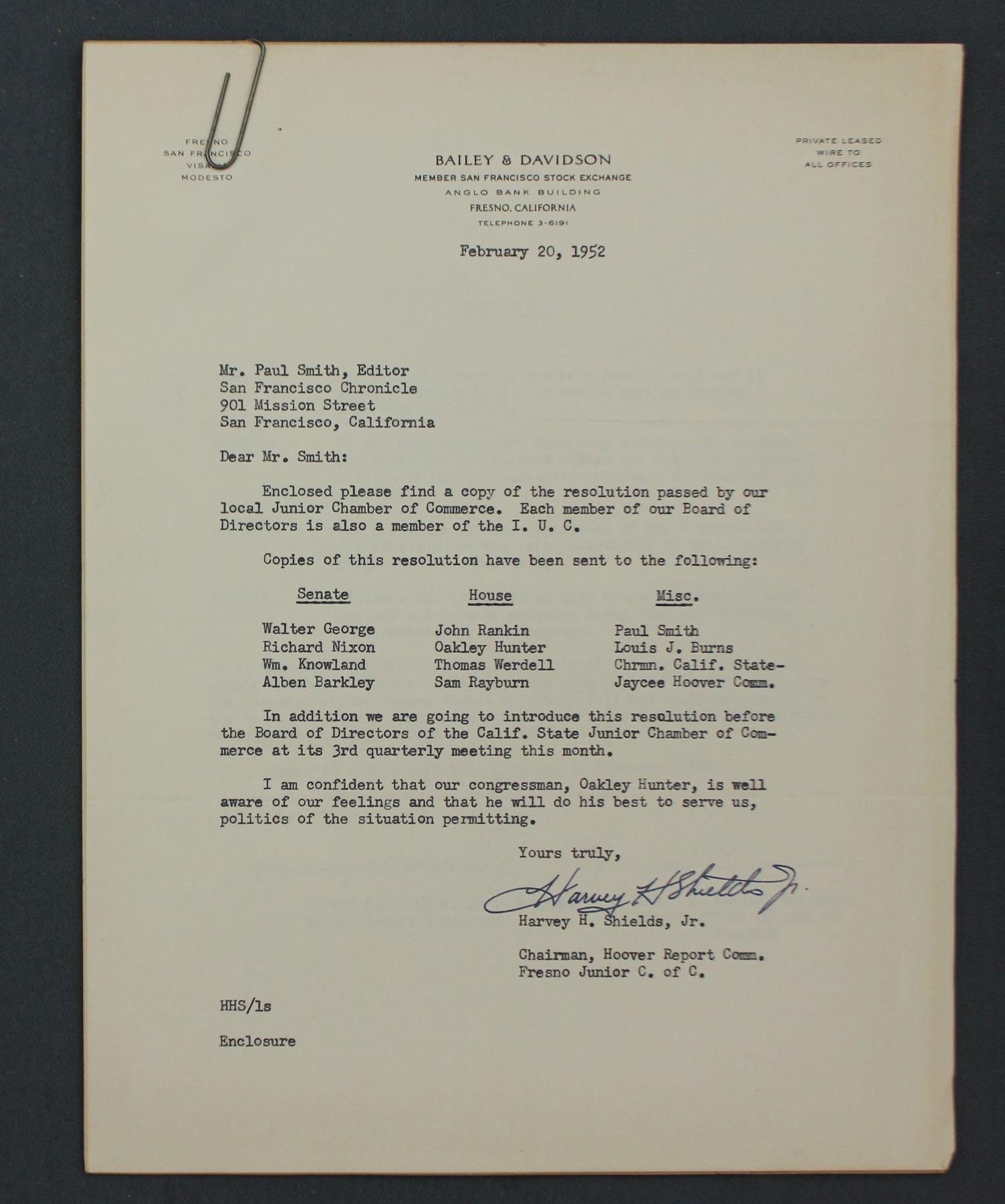 Harvey H. Shields Jr. Letter Signed as Chairman of the Hoover Report Commission. One page, 11" x 8 1/2"; February 20, 1952. In addition, more supplementary papers.