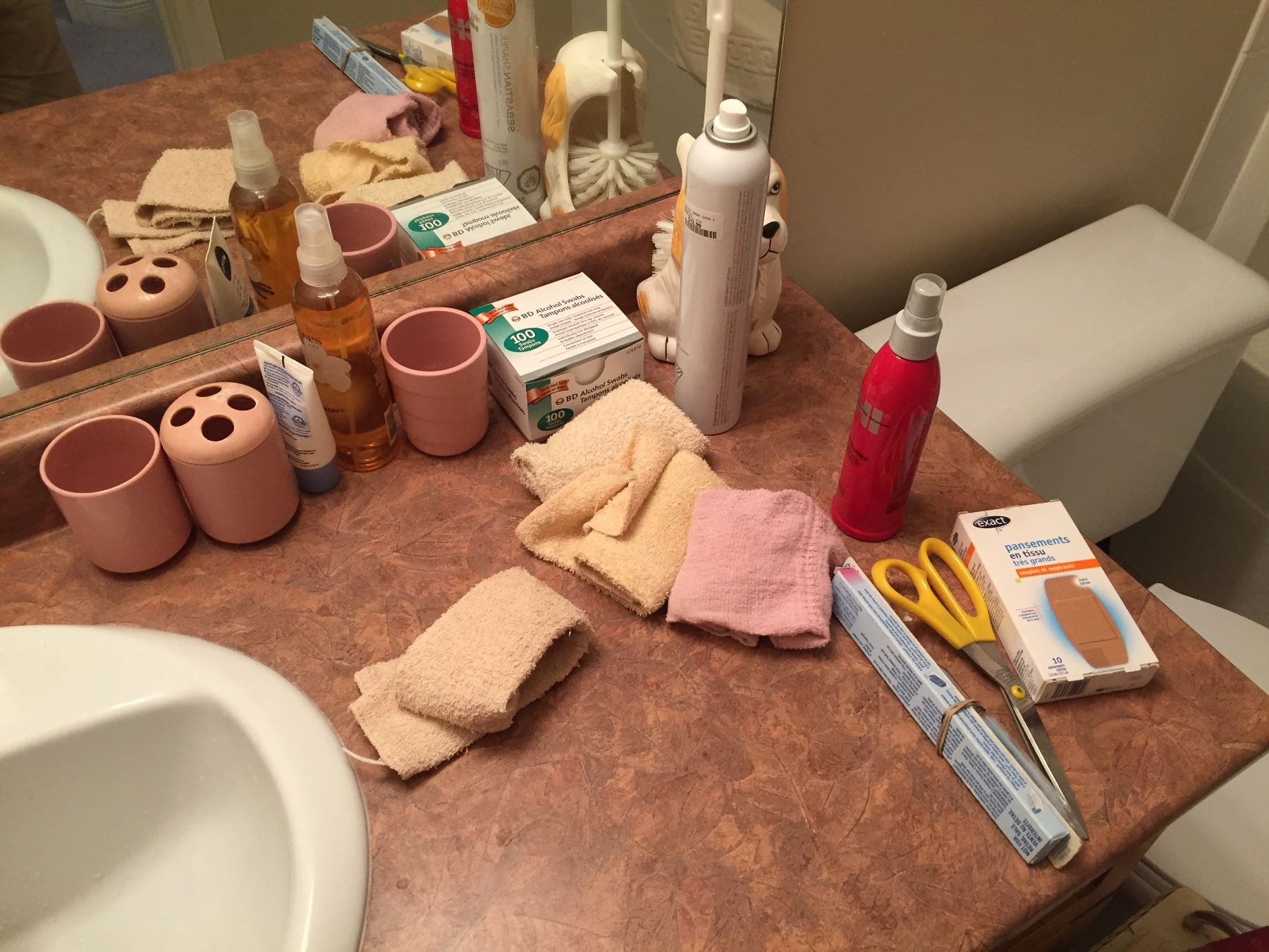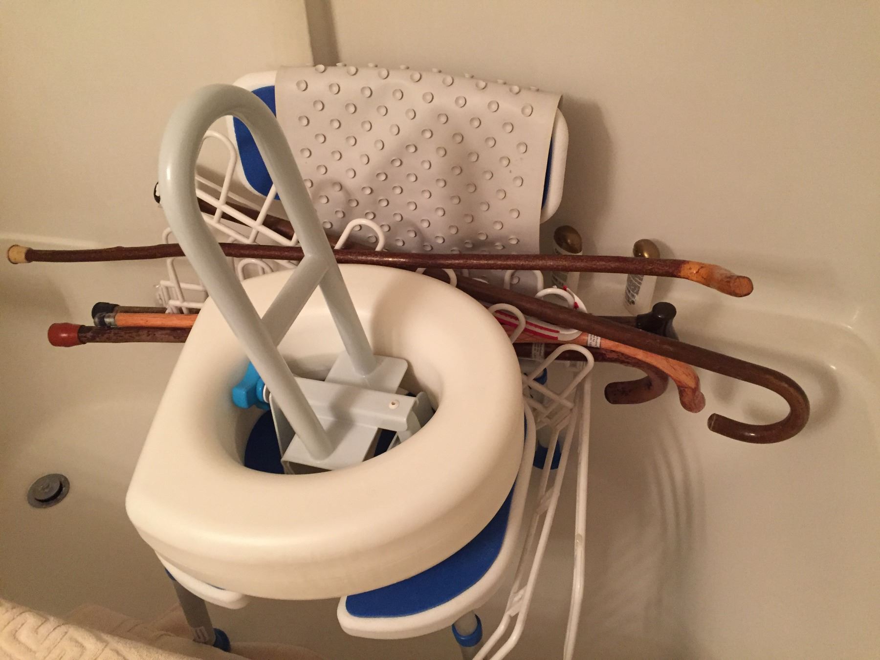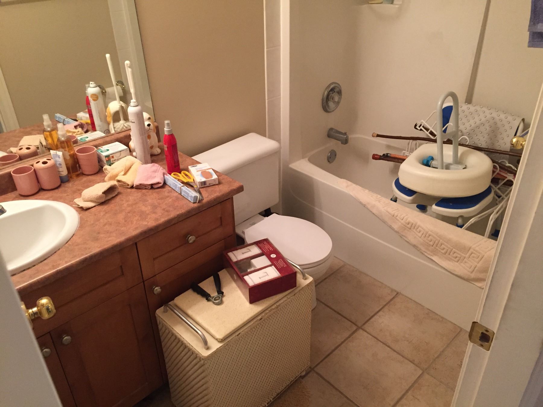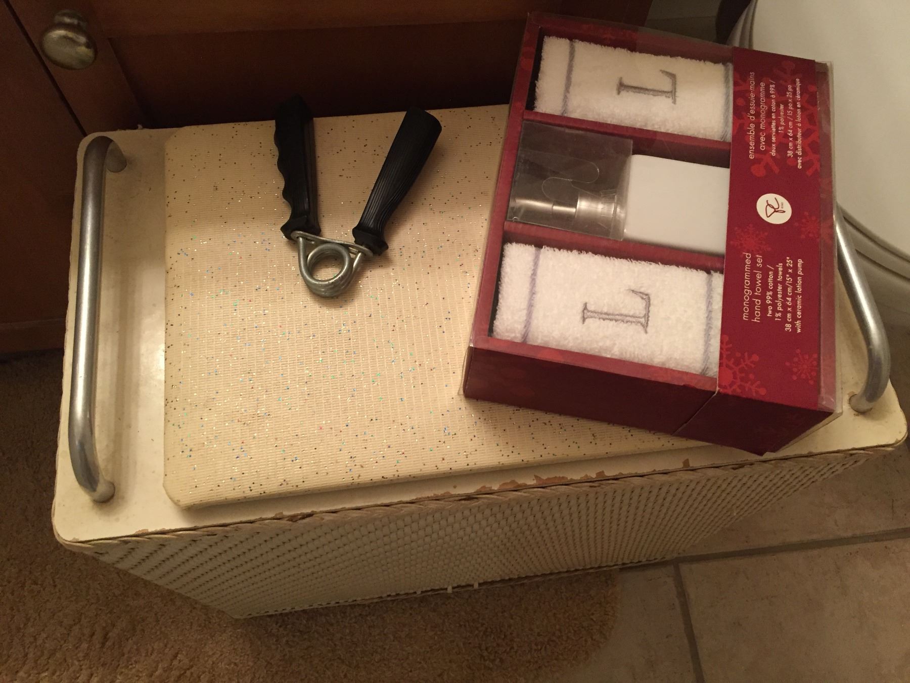 Assortment of health care products including bath seat, bathtub handle, hamper & toiletries. Bring packing supplies and Come to pickup Category A time slot, (9:00 am to 10:00 am)