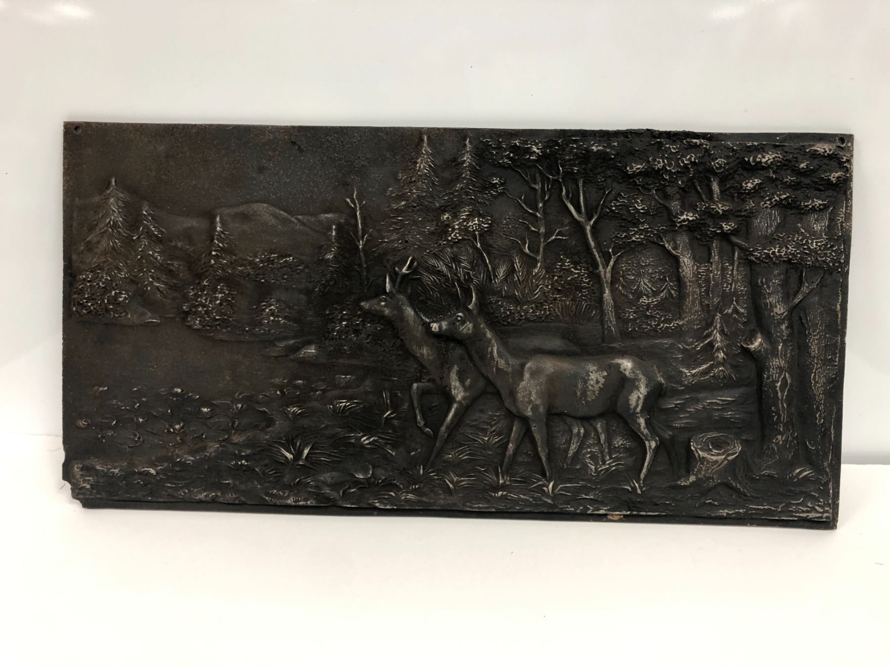 Heavy cast metal 2 deer in forest plaque - 18in x 9in