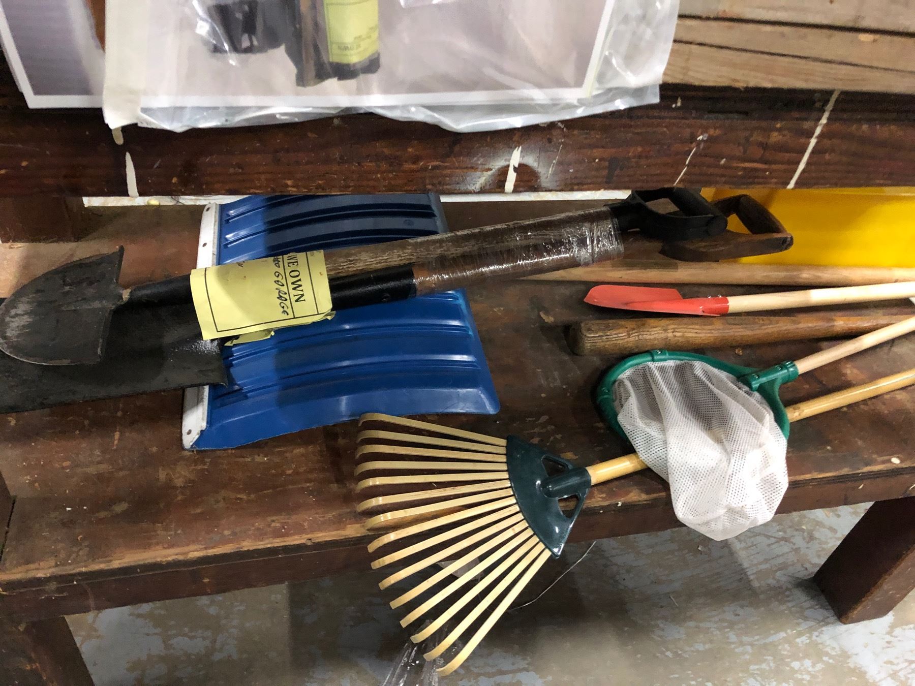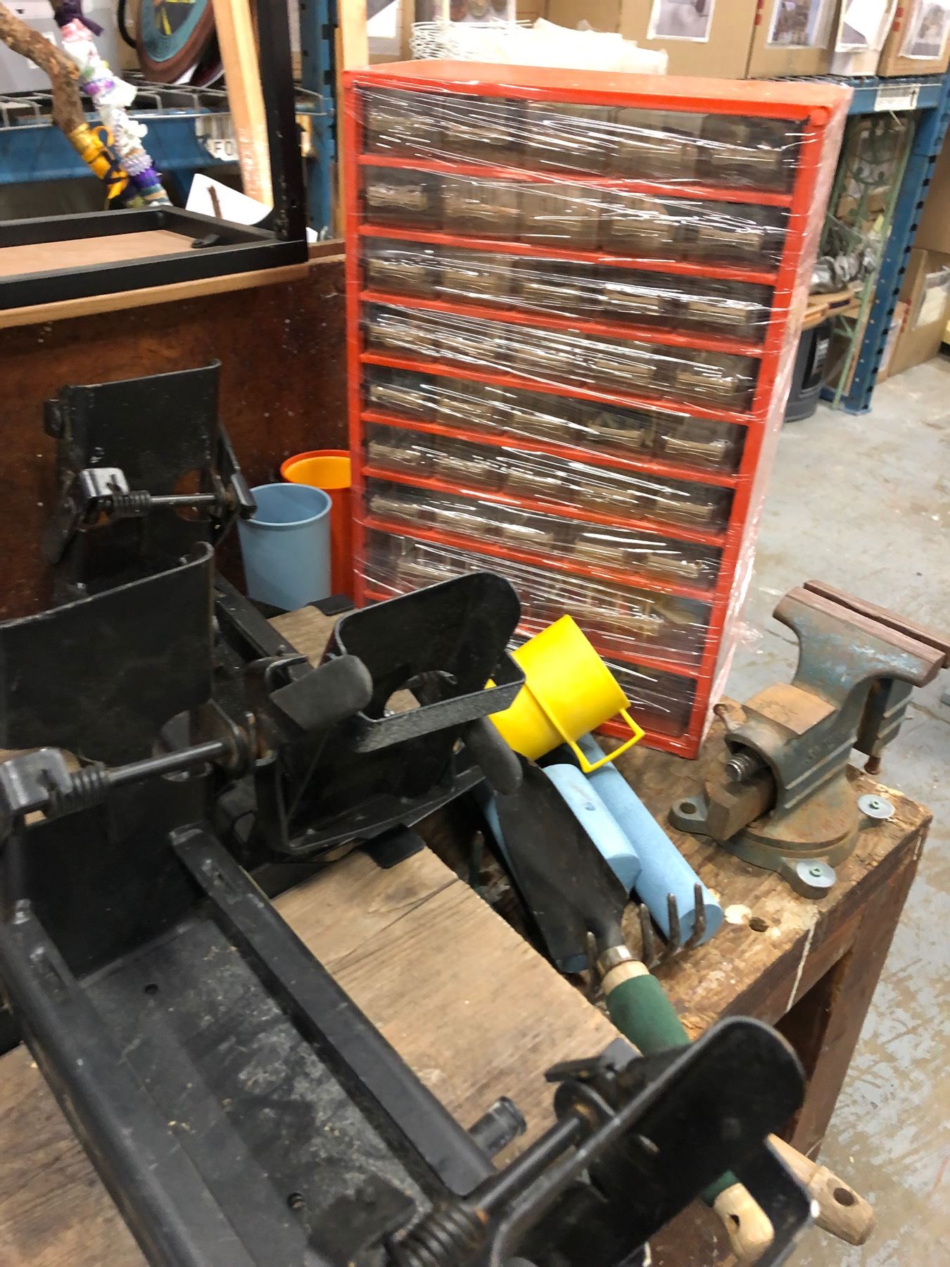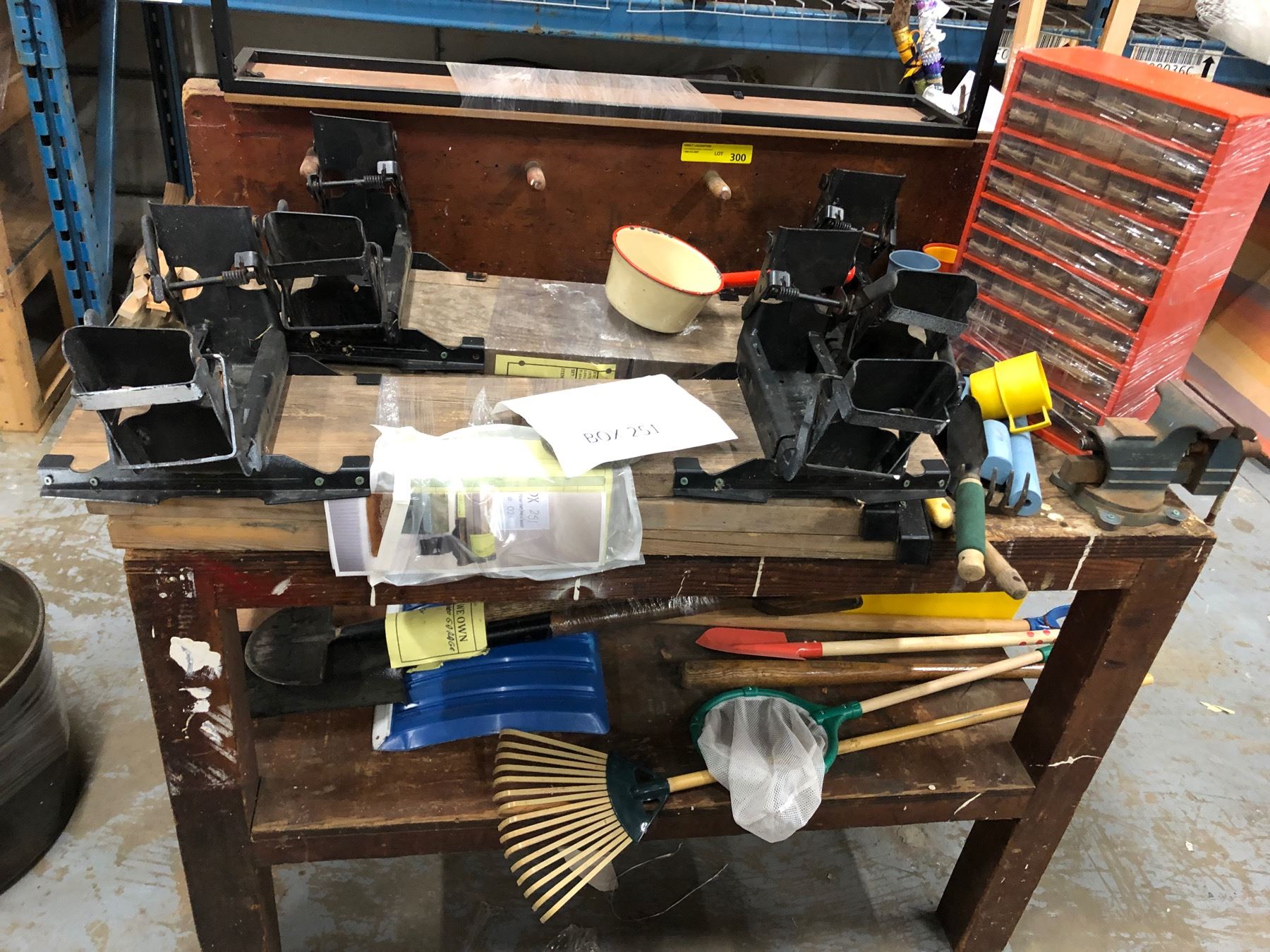 Heavy-duty wooden work bench w/ contents - includes bench grinder/ small screws cabinet/ small shovels/ rake/ wooden workhorse/legs etc. (approx.