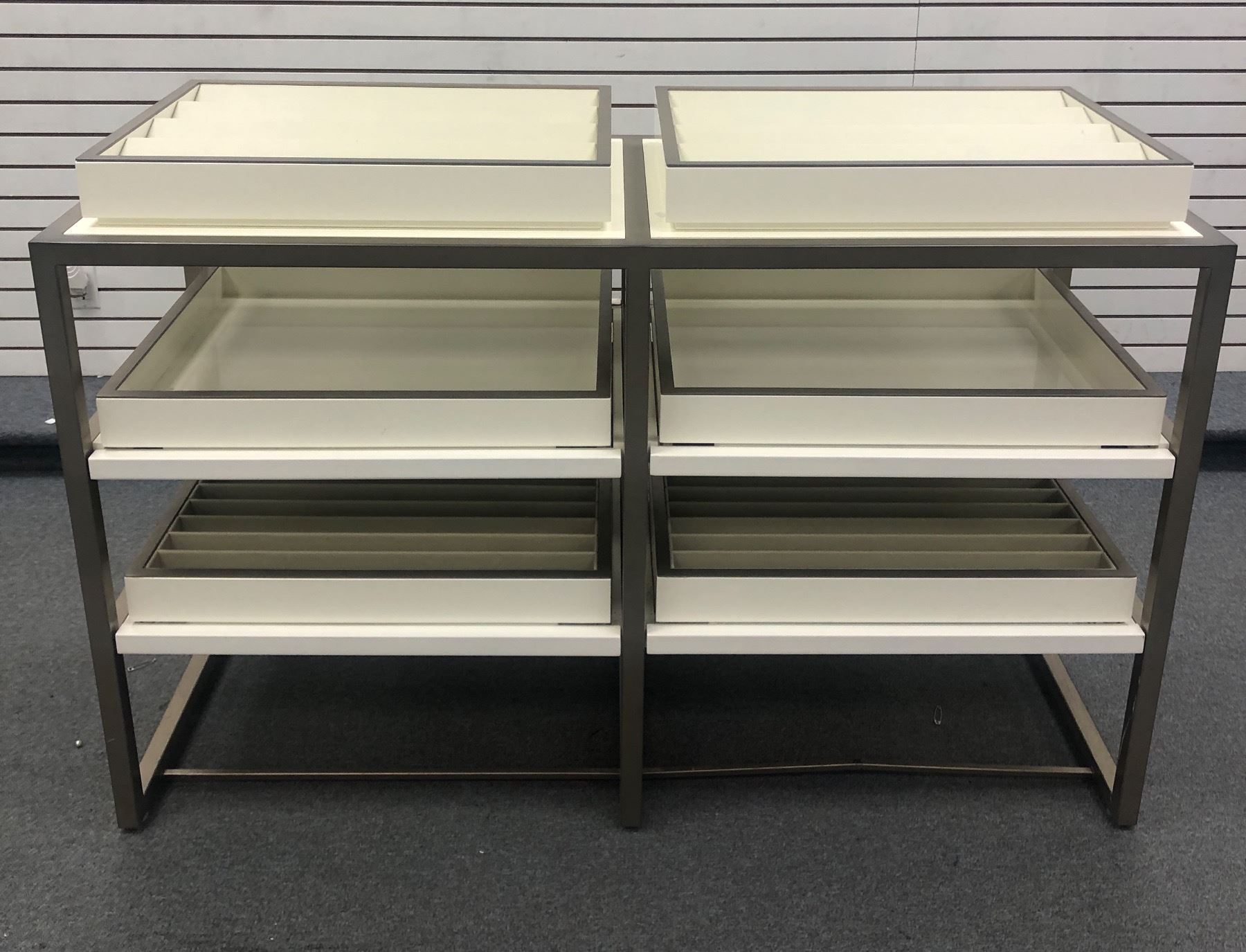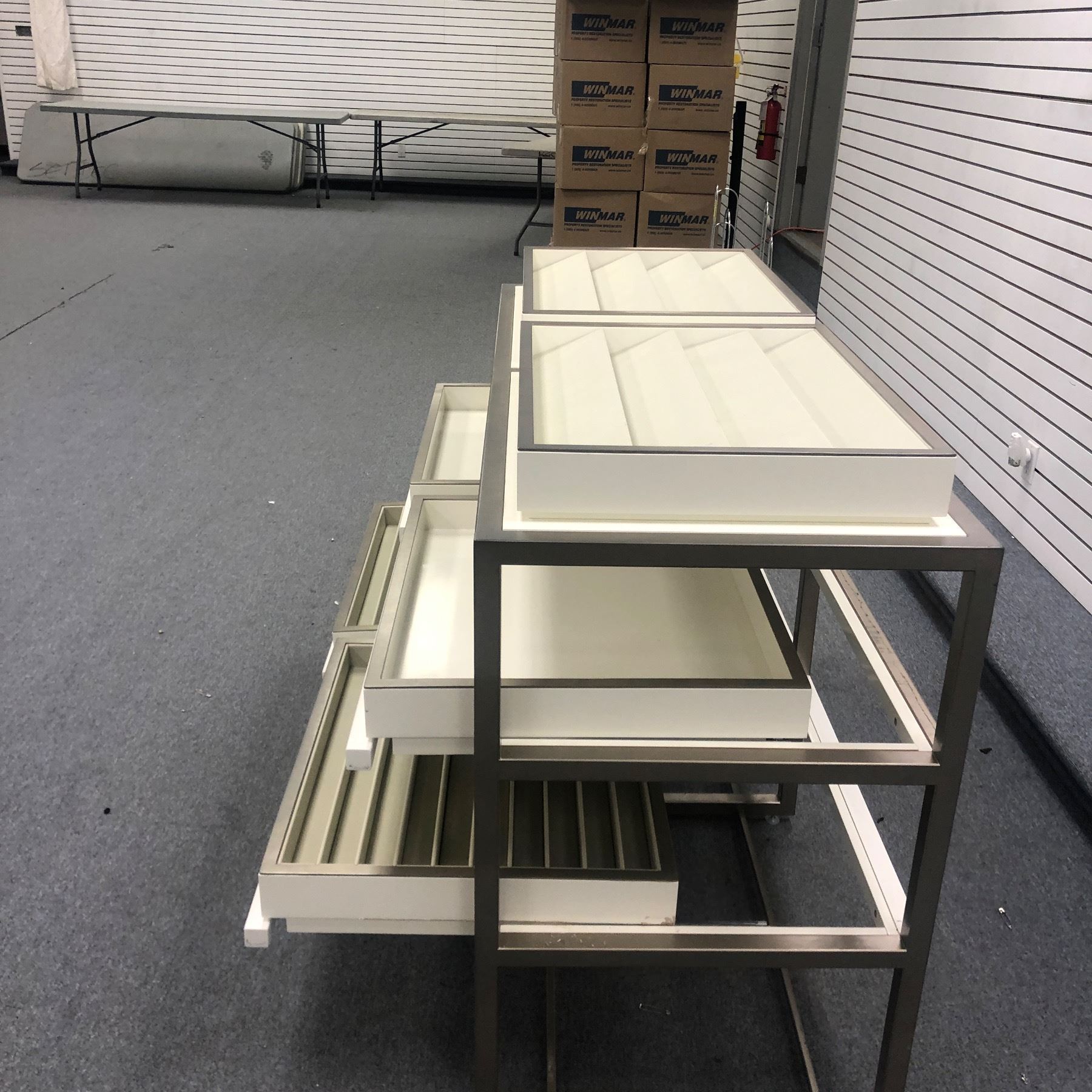 High-end modern white organizer display cabinet w/ metal legs (approx. 59" x 2ft x 40") - clean up auction moving auction