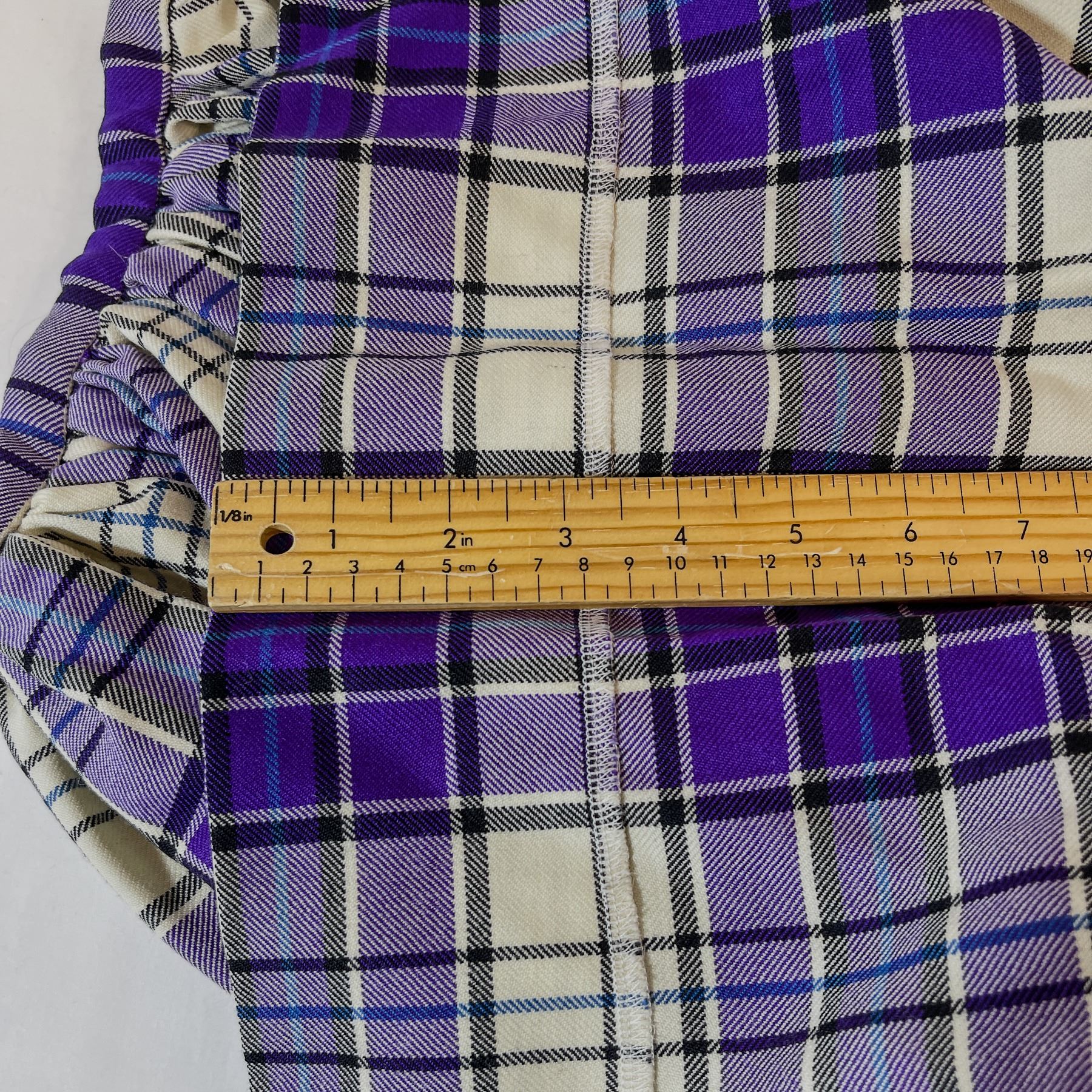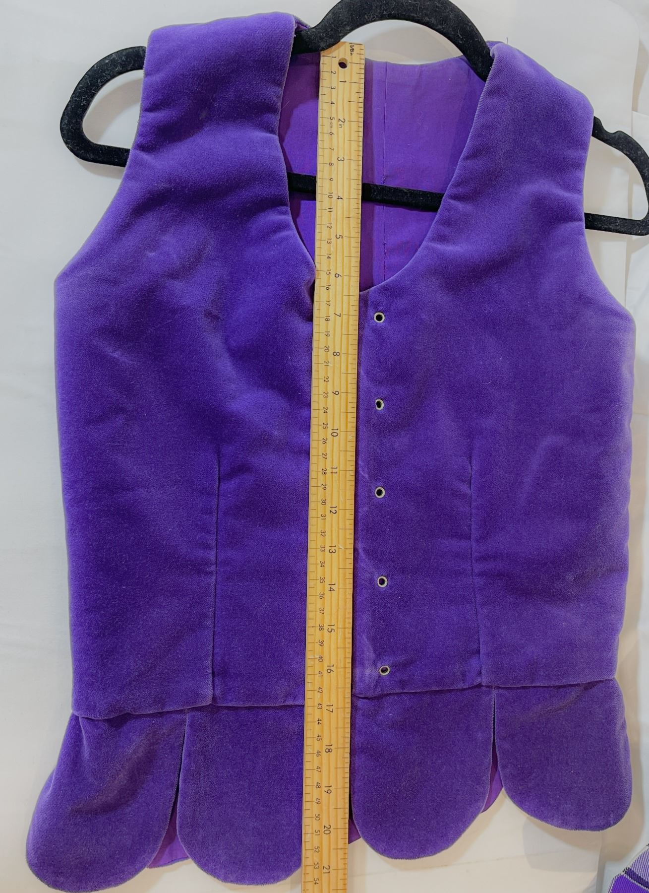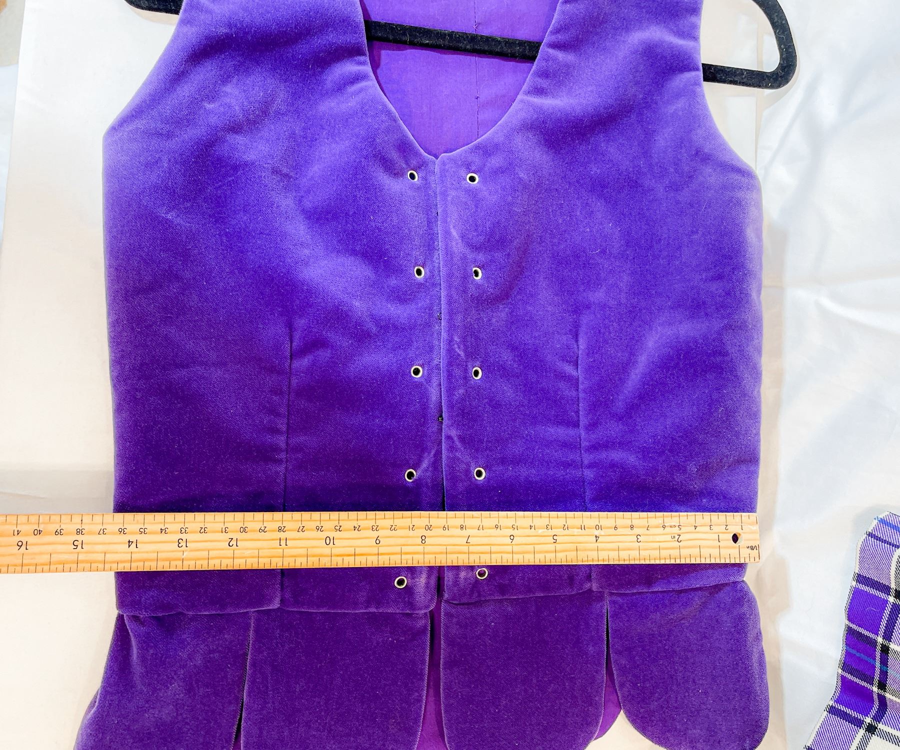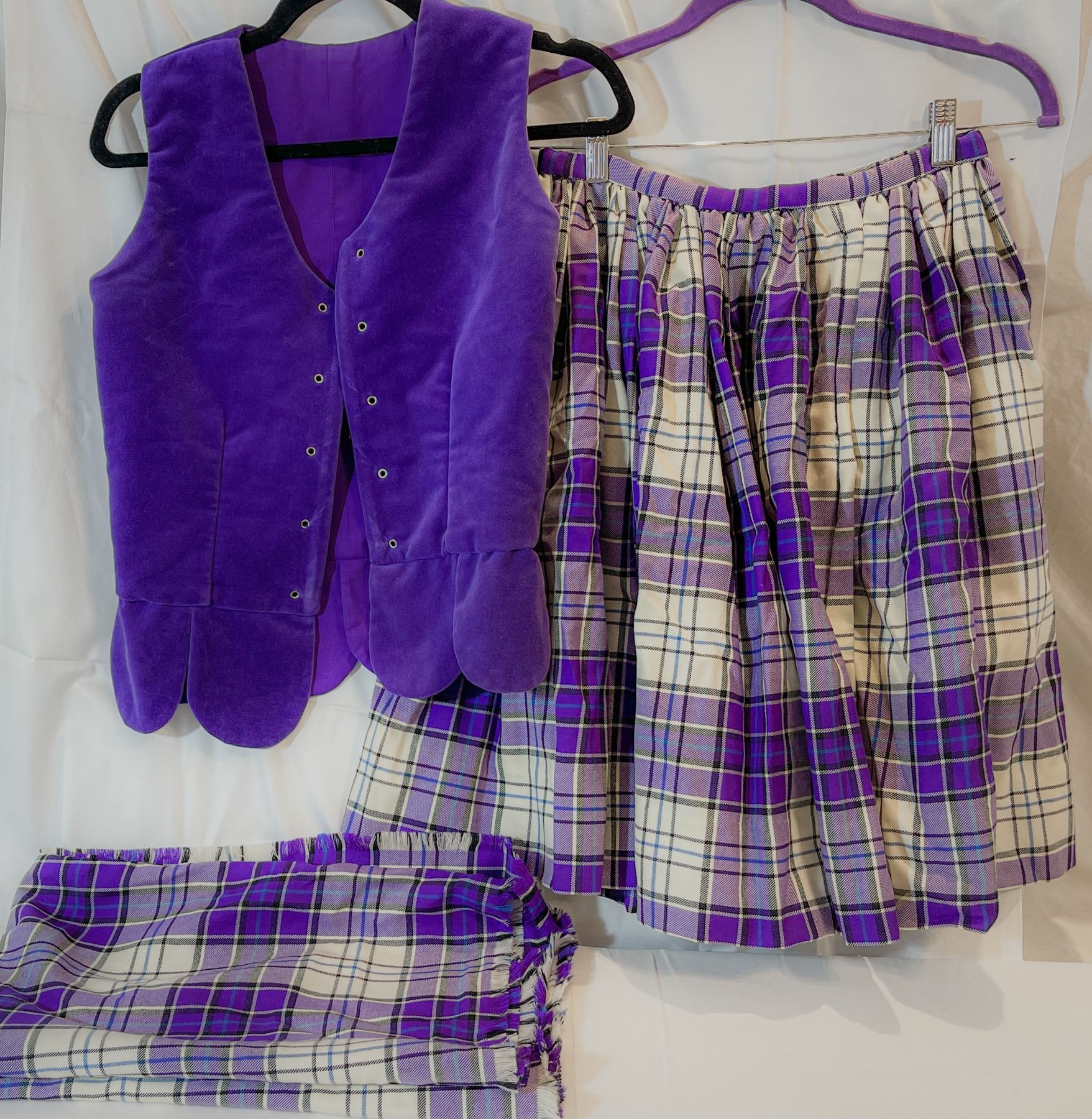 Highland National dance costume consisting of a purple velvet vest with scalloped waist and hook/eye closure, paired with a matching purple, blue, and white tartan skirt and coordinating sash. In good used condition. See photos for measurements.