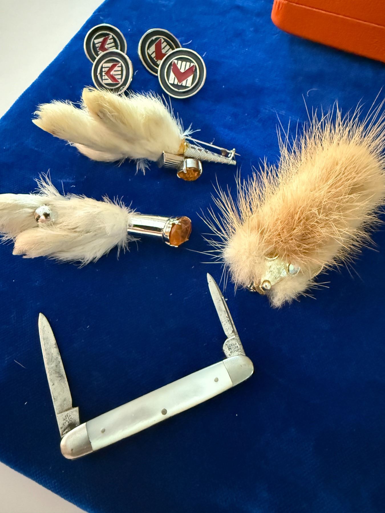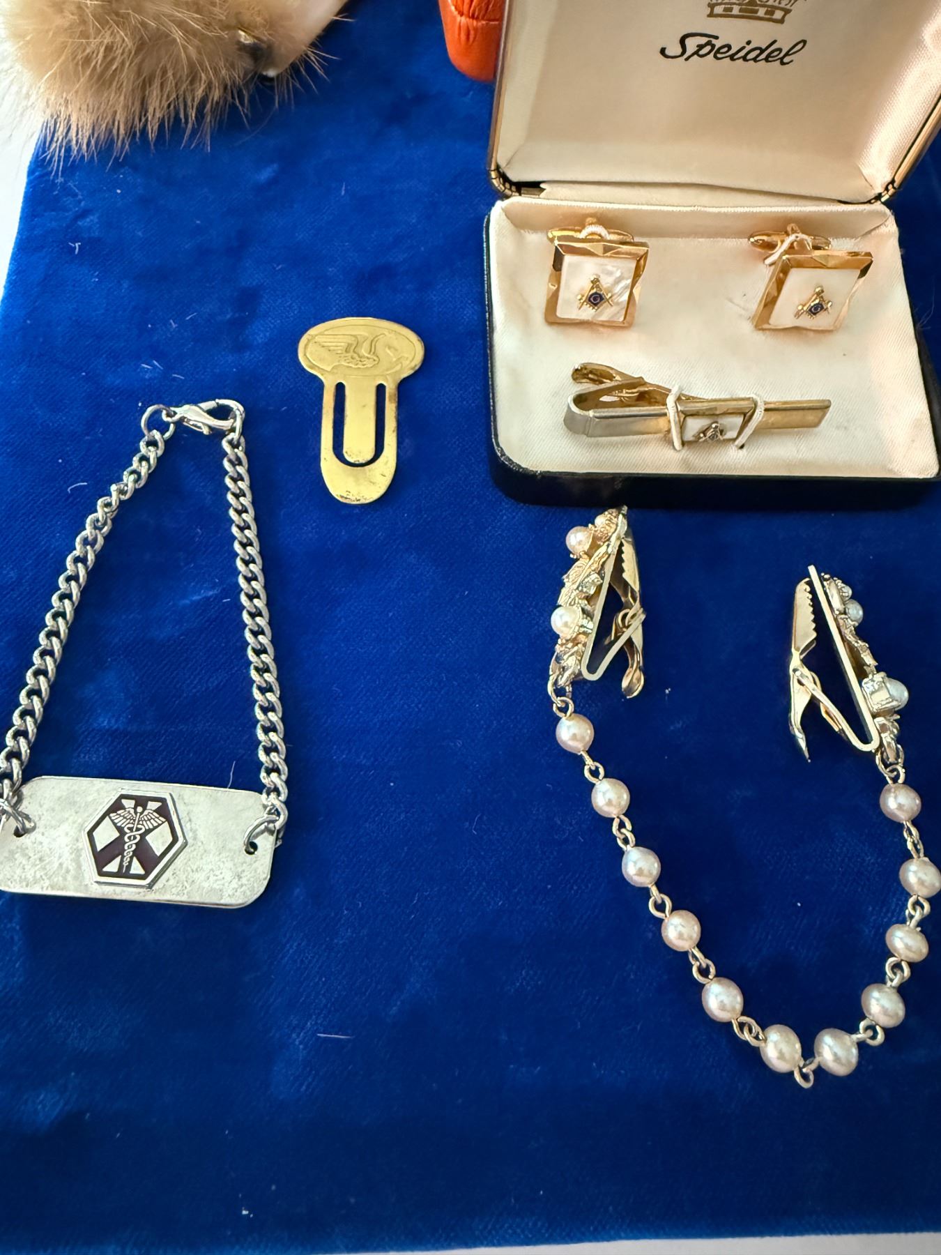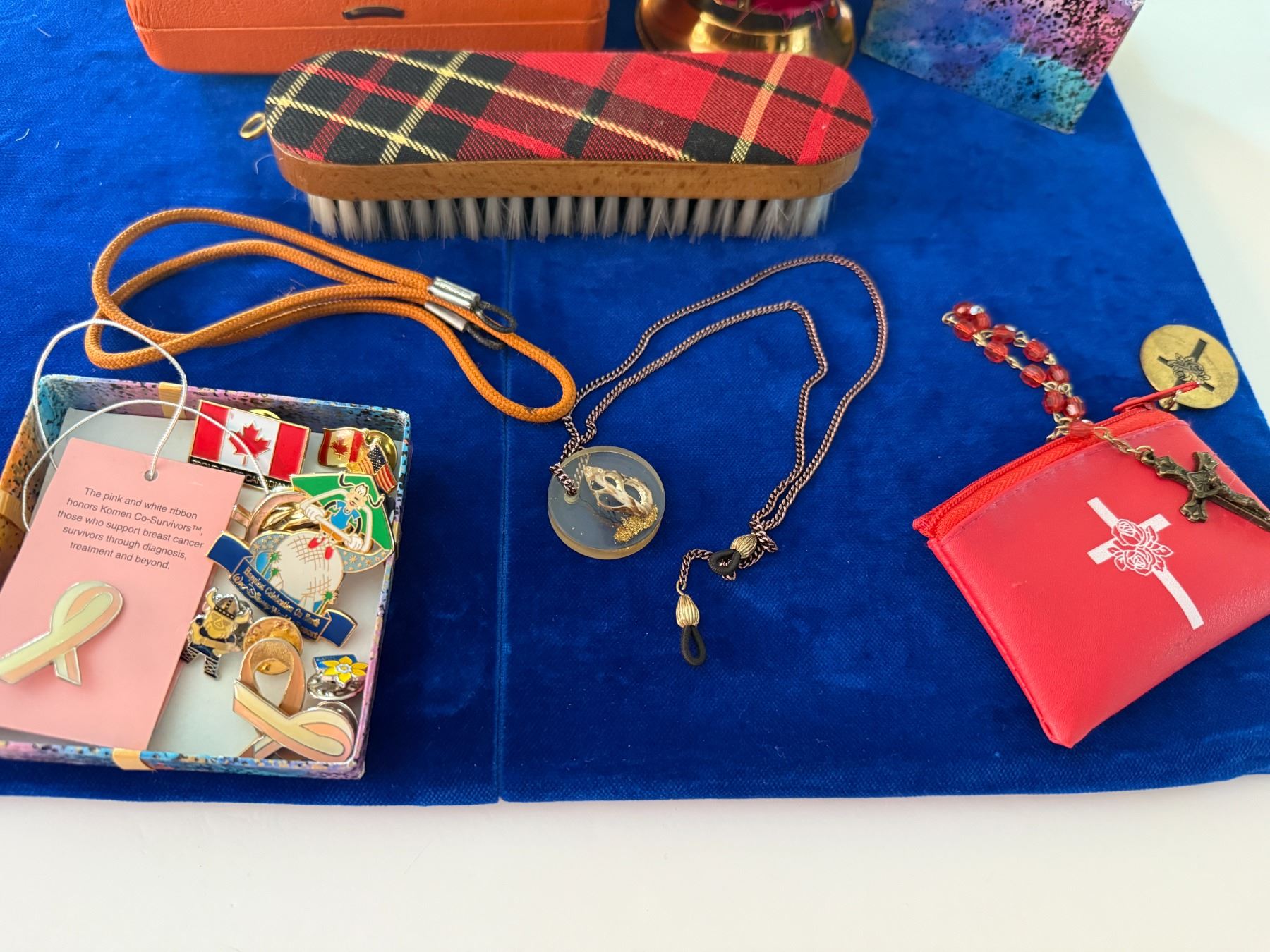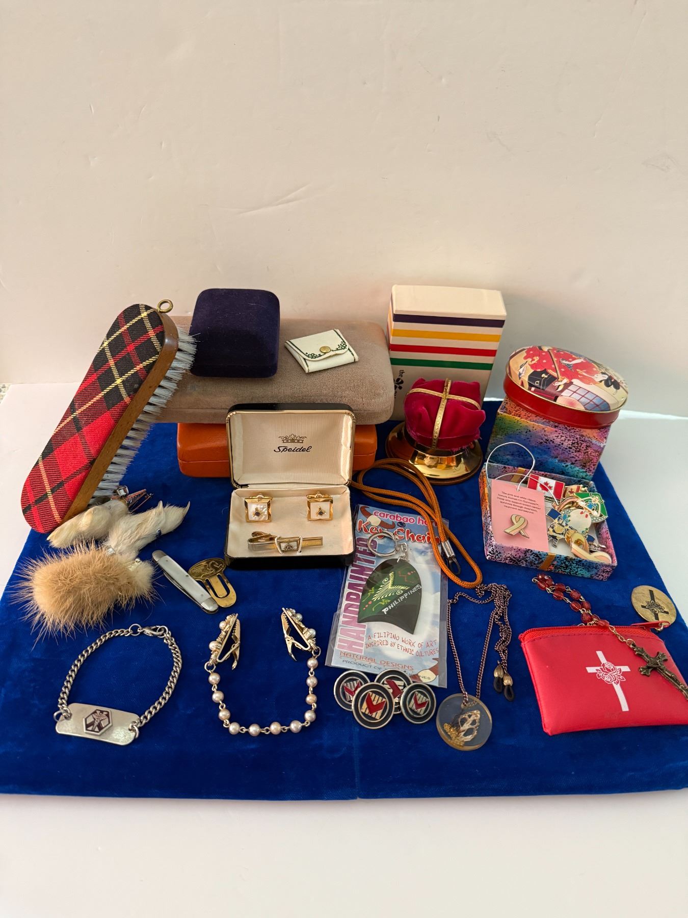 Collectible pins, vintage jewelry cases, clothes brush, Speidel cuff links and tie clip, vintage sweater clips, eyewear bands, vintage Canadian Airline buttons, more.