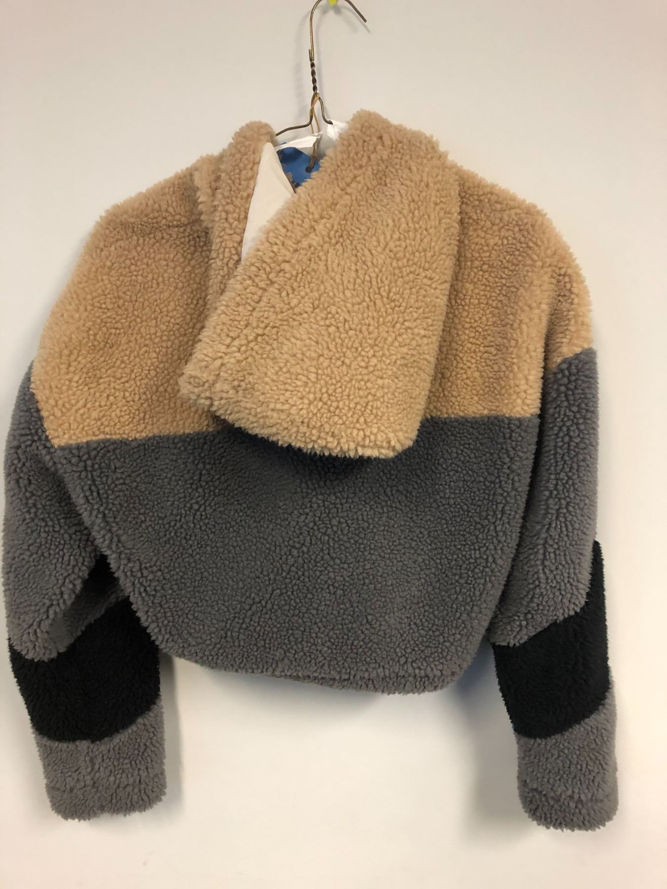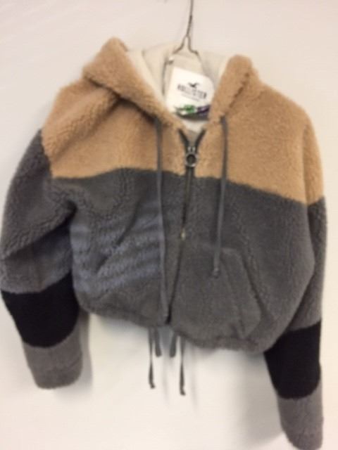 Hollister Ladies Hooded Fuzzy Jacket - Size S ( Beige, Grey and Black Stripes) CLOTHING DISCLAIMER - Items are Movie Set Clothing. There are various sizes, some new and some used and some with tags.