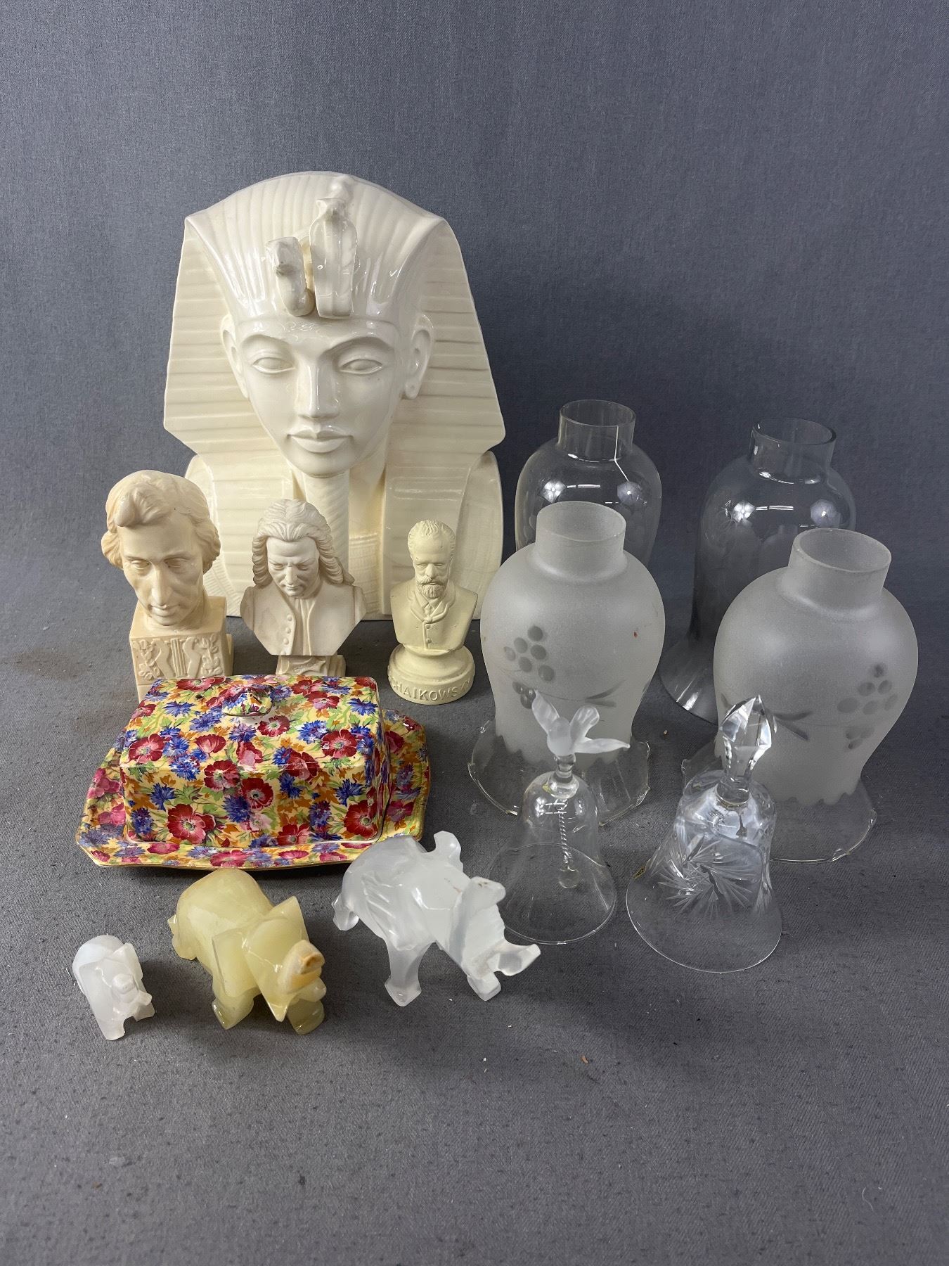 Home Décor Lot - 9.75"H Pharoh Bust, Hurrican Lamp Shades, Stone Elephants, Bells & More