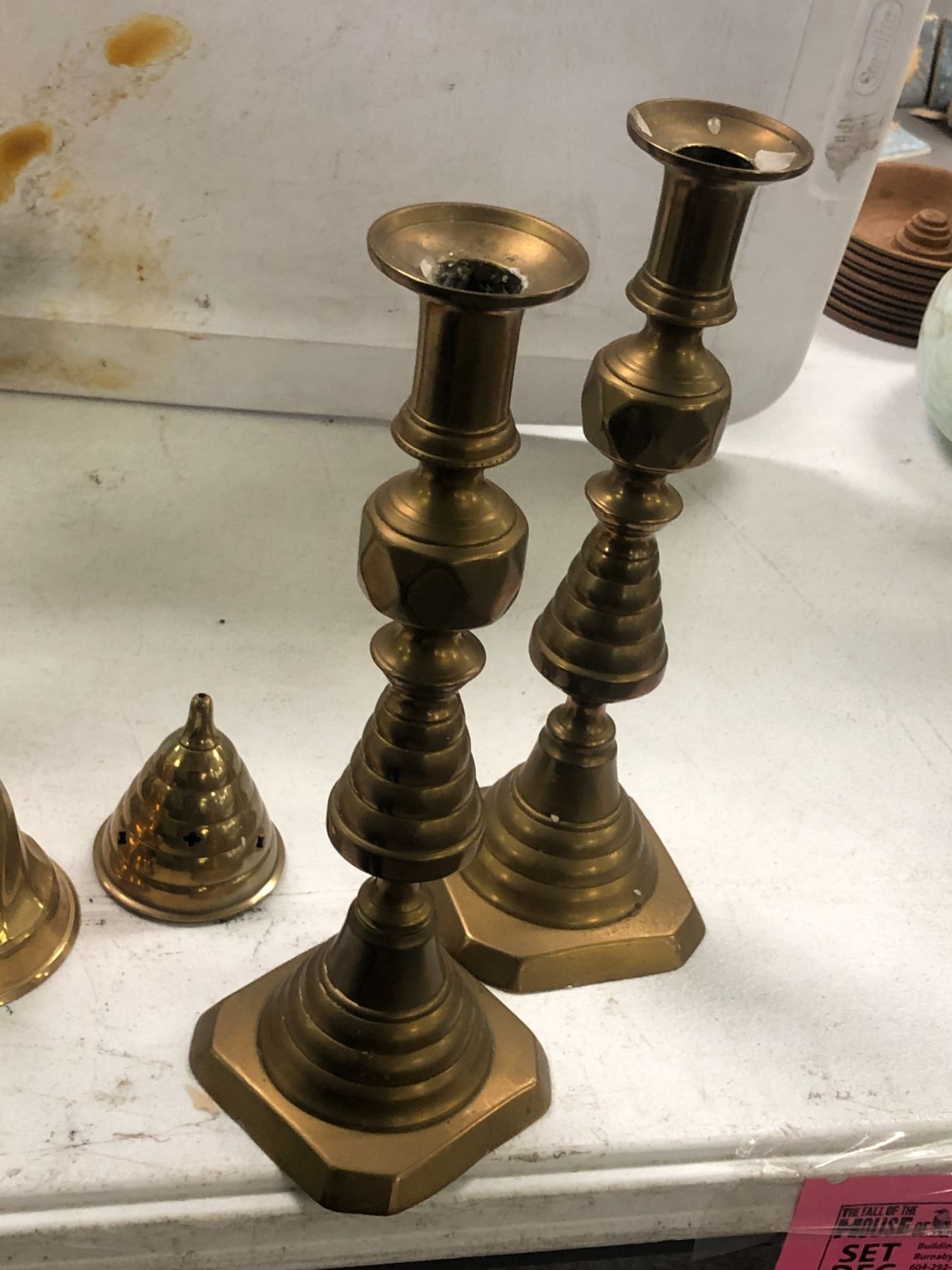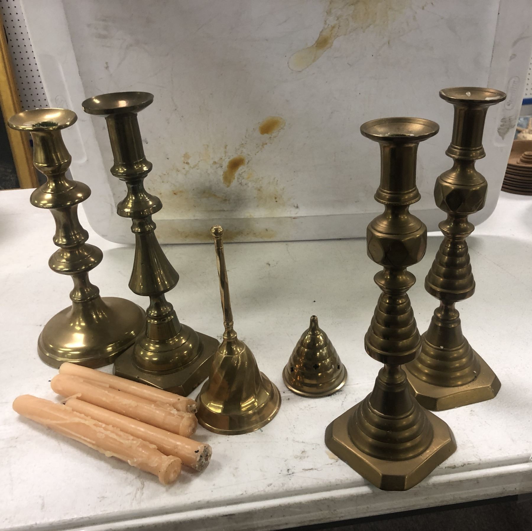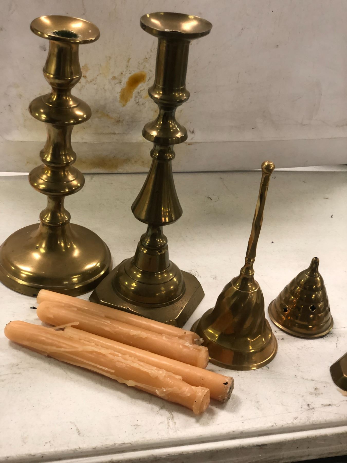 "Horror Show" - Group of brassware includes candle holders/bell/candles