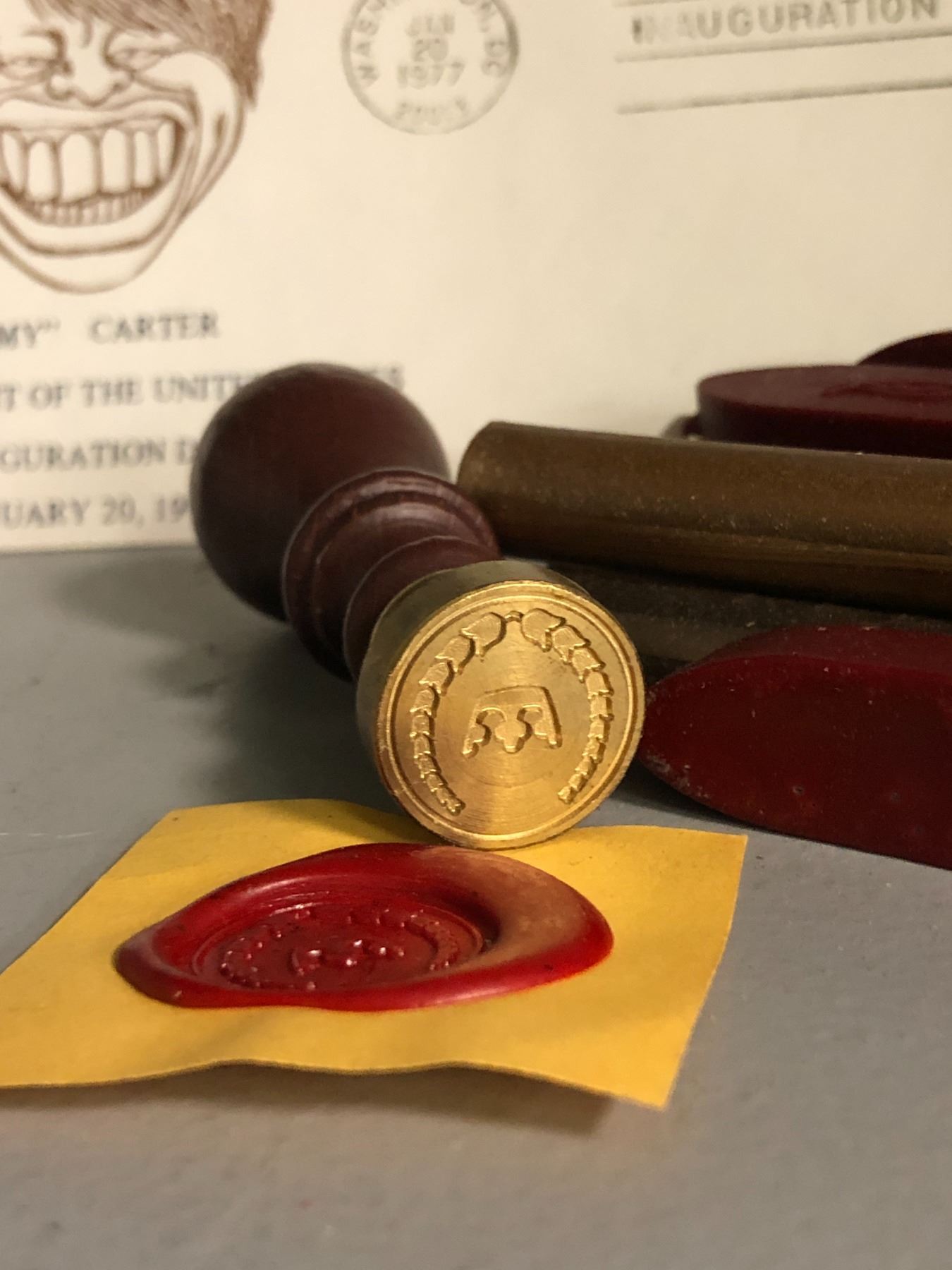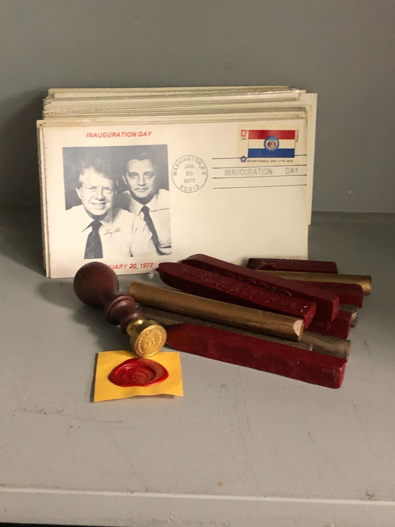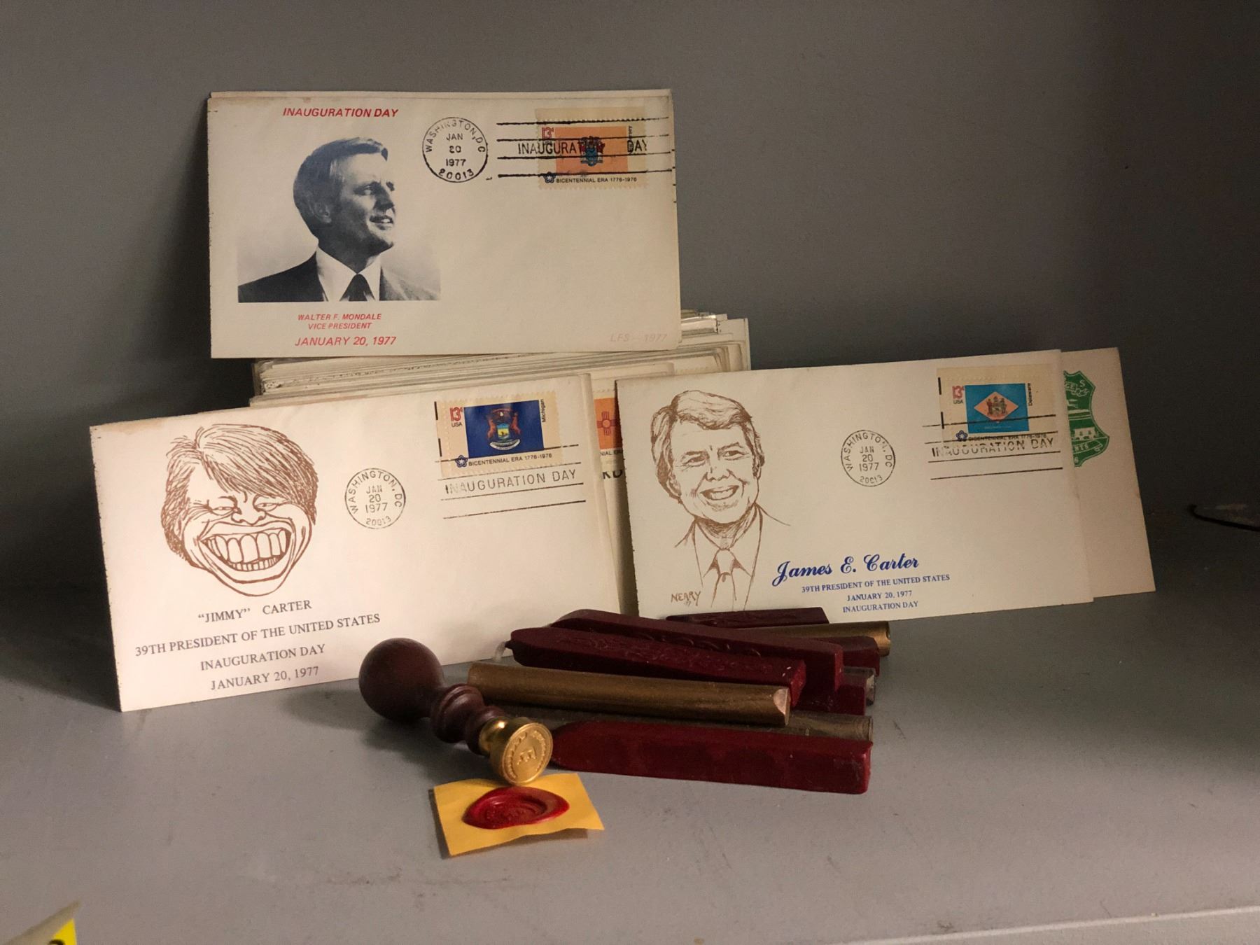 "Horror Show" - set dec items includes "Inauguration Day of James E. Carter" envelops (approx. 80 pieces)/wax seal stamp w/ wax